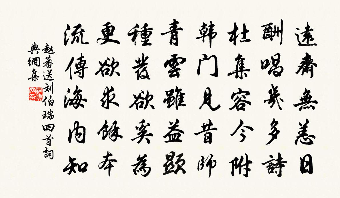 詩詞名句歷史字典書法欣賞書法字典國語詞典說文解字康熙字典古漢語字典標 題 作 者 詩 句 送劉伯瑞四首作者:趙蕃 朝代:宋代送劉伯瑞四首原文遠齋無恙日,酬唱幾多詩。杜集容今附,韓門見昔師。青雲雖益顯,種發欲奚為。更欲求余本,流傳海內知。詩詞問答問:送劉伯瑞四首的作者是誰?答:趙蕃問:送劉伯瑞四首寫於哪個朝代?答:宋代趙蕃送劉伯瑞四首書法欣賞送劉伯瑞四首書法作品詩詞推薦題長安酒肆壁三絕句鍾離權〔唐代〕坐臥酒常攜酒一壺酒,不教雙酒眼識皇都酒。乾坤許大無名姓,疏散人中一丈夫。得道高僧不易逢,幾時歸去願相題天華觀盧綸〔唐代〕峰嶂徘徊霞景新,一潭寒水絕纖鱗。朱字靈書千萬軸,蒼髯道士兩三人。芝童解說壺中事,玉管能留天上春。眼見入春半月未有梅花尤袤〔宋代〕枯樹扶疏水滿池,攀翻未見玉團枝。應羞無雪教誰伴。未肯先春獨探枝。幾度杖藜貪看早,一年芳信恨開遲。留連浣溪沙(試香羅)韓淲〔宋代〕風軟湖光遠盪磨。春衫初試薄香羅。踏青無計奈君何。莫笑老來多歲月,肯教閒去少詩歌。長安陌上有銅駝。我愛淳安好陳曄〔宋代〕我愛淳安好,憂民缺致盈。渠通廬避濕,灘鑿浪難生。利涉津梁固,安行道路平。夙宵雖龜勉,終愧漢公卿。人有畫花中四倫者偶記毗陵舊詩即題其上家鉉翁〔宋代〕佩玉垂紳廊廟人,幽花小草豈其倫。須知四海皆兄弟,淡泊論交處處親。偈頌一百三十六首釋惟一〔宋代〕泯志灰心,參禪學道。無煩惱中,自討煩惱。可不向老胡來已前,試著眼看,自己分上有何欠少。天童恁么道,不紹興祀岳鎮海瀆四十三首佚名〔宋代〕相予陰威,厥功浩浩。一歲之功,何以為報。府有珪幣,我其敢私。肅肅孔懷,於以將之。念奴嬌趙長卿〔宋代〕銀蟾光滿,弄餘輝、冷浸江梅無力。緩引柔條浮素蕊,橫在閒窗虛壁。染紙揮毫,粉塗墨暈,不似今端的。天然造賦得白雲起封中(一作陳希烈詩)李正辭〔唐代〕千年泰山頂,雲起漢皇封。不作奇峰狀,寧分觸石容。為霖雖易得,表聖自難逢。冉冉排空上,依依疊影重。素光讀謝章奏疏賦朝陽吟高斯得〔宋代〕岷峨禿如赭,江漢濁如泔。云何只隔夜,潑黛挼青藍。得非氣沆碭,祝融困西戡。秋風抗手謝,天公吾敢貪。此邦宮詞楊公遠〔宋代〕燕語鶯啼日正長,六宮桃李鬧春光。妾身雖未承恩澤,卻喜君恩澤萬方。邊思張祜〔唐代〕蘇武節旌盡,李陵音信稀。花當隴上發,人向隴頭歸。水調歌頭白君瑞〔宋代〕涼吹拂衣袂,助我上高台。雲檐風棟,窗戶絕纖埃。四繞江山雄麗,萬古盤龍踞虎,壯氣鎖崔嵬。二水中分遠,艇離廣平蘇頌〔宋代〕歸騎駸駸踏去塵,數朝晴日暖如春。向陽漸喜聞南雁,炙背何妨問野人。度漠兼程閒鼠褐,據鞍濃睡側烏巾。窮冬落花釋寶曇〔宋代〕閬苑春歸去,愁人有落紅。錦茵鋪地密,蝶夢繞枝空。素艷隨流水,餘香散曉風。日斜深院靜,不見賣花翁。王通判輓詞樓鑰〔宋代〕世篤青箱學,驊騮更著鞭。半山分近派,岩壑誦新篇。竹馬迎雙舄,棠陰憶二天。黃扉伸讜論,風節尚翹然。宇文子貞至驛為松江諸邑田糧事賦古詩二章增之孫華孫〔元代〕朝行谷水東,暮行谷水西。谷水日日流,驛舟日日來。驛舟來不已,波浪日日起。朝行谷水西,暮行谷水東。傍人山中寄吳磻十韻方乾〔唐代〕莫問終休否,林中事已成。盤餐憐火種,歲計付刀耕。掬水皆花氣,聽松似雨聲。書空翹足臥,避險側身行。果傍宿山祠(一作宮山祠)張籍〔唐代〕秋草宮人斜里墓,宮人誰送葬來時。千千萬萬皆如此,家在邊城亦不知。名句推薦一重山,兩重山。山遠天高煙水寒,相思楓葉丹。李煜《長相思·一重山》 這次第,怎一個愁字了得!李清照《聲聲慢·尋尋覓覓》 處世不必邀功,無過便是功;與人不要感德,無怨便是德。洪應明《菜根譚·概論》 微風搖紫葉,輕露拂朱房。沈約《詠芙蓉》 絕代有佳人,幽居在空谷。杜甫《佳人》 好夢欲成還又覺,綠窗但覺鶯啼曉。施耐庵《蝶戀花·一別家山音信杳》 千古英雄同一嘆,傷懷豈止為蛾眉沈約《昭君辭》 集中什九從軍樂,亘古男兒一放翁。梁啓超《讀陸放翁集》 白頭搔更短,渾欲不勝簪。杜甫《春望》 黃衫飛白馬,日日青樓下。陳克《菩薩蠻·赤闌橋盡香街直》