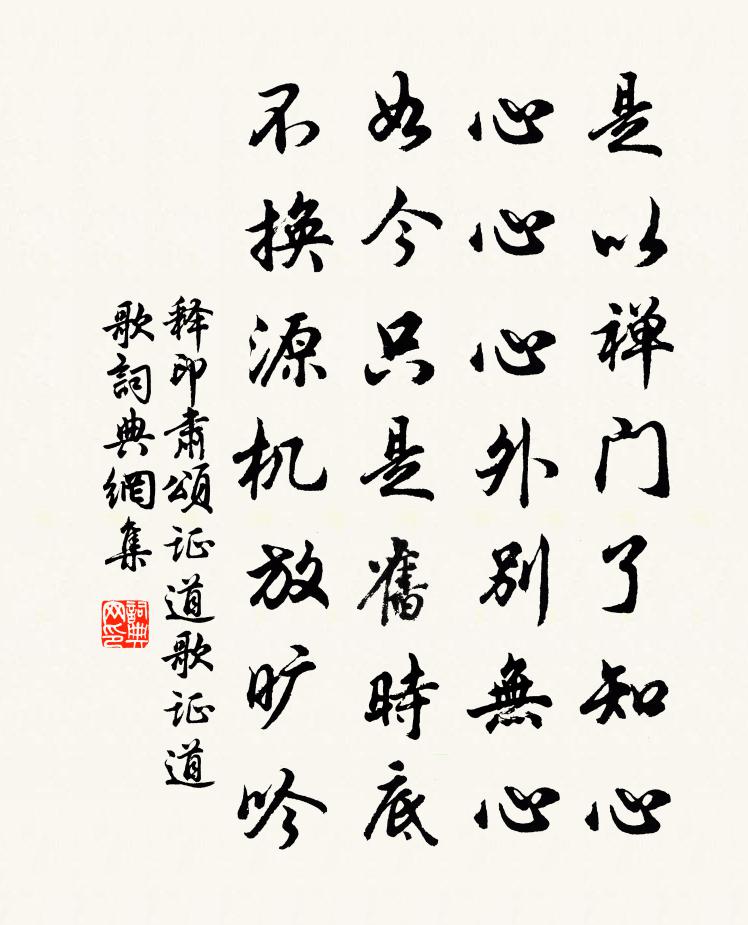 詩詞名句歷史字典書法欣賞書法字典國語詞典說文解字康熙字典古漢語字典標 題 作 者 詩 句 頌證道歌證道歌作者:釋印肅 朝代:宋代頌證道歌證道歌原文是以禪門了知心,心心心外別無心。如今只是舊時底,不換源機放曠吟。詩詞問答問:頌證道歌證道歌的作者是誰?答:釋印肅問:頌證道歌證道歌寫於哪個朝代?答:宋代釋印肅頌證道歌證道歌書法欣賞頌證道歌證道歌書法作品詩詞推薦病目武衍〔宋代〕病目醫治兩睫寬,迎風猶苦淚漫漫。水邊望月雖無礙,燈下觀書便覺難。索句每防愁人腎,好杯多是熱歸肝。法當賦秋江圖張端義〔宋代〕浪靜風平月正中,自搖柔櫓駕孤篷。若無三萬六千頃,把甚江湖著此翁。宮詞 / 宮中詞朱慶餘〔唐代〕寂寂花時閉院門,美人相併立瓊軒。含 * 說宮中事,鸚鵡前頭不敢言。滿庭芳蔡伸〔宋代〕煙鎖長堤,雲橫孤嶼,斷橋流水溶溶。憑闌凝望,遠目送征鴻。桃葉溪邊舊事,如春夢、回首無蹤。難忘處,紫薇雨中即事簡二友鄭清之〔宋代〕舉頭但覺雲頭暗,移腳何曾雨腳乾。衣裌未便時衣褐,薄寒渾作晚秋看。石(上鞏下石)艾申〔宋代〕突兀倚蒼穹,誰雲巧妙工。滴□岩已竭,神運□常空。人入嵌□里,春歸秋□中。□翁何處在,孤塔凜高風。呈月窗兄陳著〔宋代〕頗有愛山心,山人交未深。不知回俗駕,依舊入儒林。樂處外何有,故書中可尋。漁蓑歸得晚,風雨伴吾吟。送衣還石泓弟張埴〔宋代〕所不貸人惟世道,最無窮處是天機。昂藏池上霜楓樹,寒冷年年著錦衣。寓嚴陵學和鄧學錄相留之韻陳淳〔宋代〕道為賢侯講泮宮,淵源程子及周翁。路開正脈同歸極,川障狂瀾浪駕空。珍重前廊渾氣合,督提後進要心通。聖門偈二十七首釋守淨〔宋代〕三十六旬窮此夕,定盤星上轉風車。放開結角羅紋處,須信風流出當家。求遺書宋庠〔宋代〕政革秦餘暴,文興漢德優。中經雖並集,逸典更旁求。使節褒遺訓,儒林補大猷。家無藏壁恨,人弭挾書憂。深穴次韻子文探梅水西,春已深,猶未開。水西,范成大〔宋代〕孤山山下小斜橋,客魂曾共暗香飄。五年不踏西湖路,想見黃昏清淺處。如今憔悴古江乾,豈有幽芳伴倚欄。臘盡立春范成大〔宋代〕候管灰初動,條風已發春。萬靈歸化育,一氣驗平均。農事牛先示,人情蠖欲伸。憂哉漢疏廣,樽酒過嘉辰。枕上作陸游〔宋代〕寒夜臥林廬,蕭然適有餘。蟲悲號壞壁,燈暗守殘書。養拙天知我,安貧老似初。雖非漆園吏,也作蝶蘧蘧。送宋屯田之湖南轉運判官鄭獬〔宋代〕綠綬郎官笑白頭,更攜龍節領諸侯。摶風初擊三千水,投刃方排十二牛。行色未拋京洛地,先聲已壓洞庭秋。漢家和戴禹功幕府歸來三首王之道〔宋代〕客里詩成付漫書,清風一榻黑甜余。相山舊隱今分定,卻是歸來計不疏。題大茲寺兼簡照講師林表民〔宋代〕來從金地過銀地,智者修禪古道場。疊嶂倚空圍日月,穹聳松壑飽風霜。碑文多是唐人刻,經卷猶陰煬帝藏。偶值春詞毛滂〔宋代〕日催紅{左革右甲}鞢,雪放綠蒙茸。莫向東郊去,王春在九重。夜遊宮(宮詞)陸游〔宋代〕獨夜寒侵翠被。奈幽夢、不成還起。欲寫新愁淚濺紙。憶承恩,嘆餘生,今至此。蔌蔌燈花墜。問此際、報人何事詰朝雨寒密雪雜下輒成一篇呈諸匠者幸賜光和強至〔宋代〕飄灑初驚曉,霏微或舞檐。勢應緣雨作,威未抵霜嚴。水面瓊銷液,山頭玉露尖。偏能仁富室,只解虐窮閻。樵凍名句推薦妾本秦羅敷,玉顏艷名都。李白《陌上桑》 角聲吹徹小梅花。夜長人憶家。趙長卿《阮郎歸·客中見梅》 相馬失之瘦,相士失之貧。司馬遷《史記·滑稽列傳》 去來江口守空船,繞船月明江水寒。白居易《琵琶行 / 琵琶引》 天涯地角有窮時,只有相思無盡處。晏殊《玉樓春·春恨》 三千年事殘鴉外,無言倦憑秋樹。吳文英《齊天樂·與馮深居登禹陵》 秋江上,看驚弦雁避,駭浪船回。辛棄疾《沁園春·帶湖新居將成》 黃塵清水三山下,更變千年如走馬。李賀《夢天》 昔日芙蓉花,今成斷根草。李白《妾薄命》 力分者弱,心疑者背。尉繚《尉繚子·攻權》