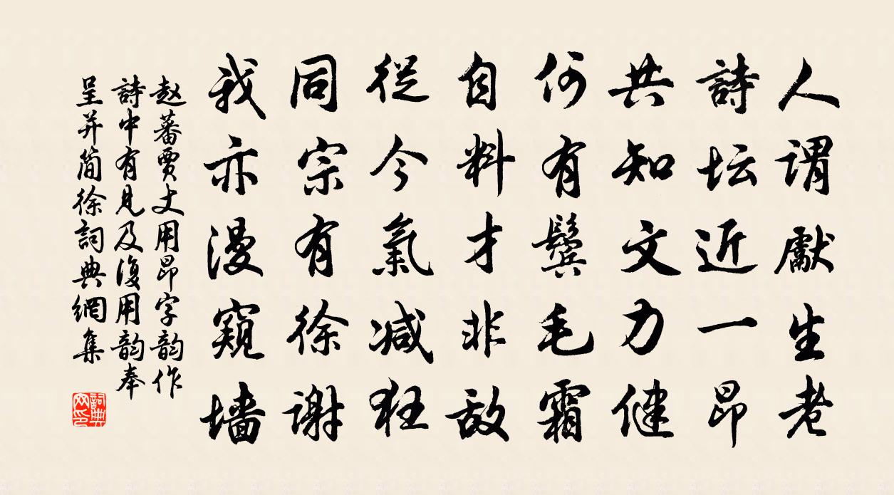 詩詞名句歷史字典書法欣賞書法字典國語詞典說文解字康熙字典古漢語字典標 題 作 者 詩 句 賈丈用昂字韻作詩中有見及復用韻奉呈並簡徐作者:趙蕃 朝代:宋代原文人謂先生老,詩壇近一昂。共知文力健,何有鬢毛霜。自料才非敵,從今氣減狂。同宗有徐謝,我亦漫窺牆。詩詞問答問:《賈丈用昂字韻作詩中有見及復用韻奉呈並簡徐》的作者是誰?答:趙蕃問:該詩寫於哪個朝代?答:宋代書法欣賞賈丈用昂字韻作詩中有見及復用韻奉呈並簡徐書法作品詩文賞析【原題】:賈丈用昂字韻作詩中有見及復用韻奉呈並簡徐謝二丈詩詞推薦過昌利觀有懷薛能〔唐代〕萬仞雲峰八石泉,李君仙后更誰仙。我來駐馬人何問,老柏無多不種田。緣識宋太宗〔宋代〕大道常恭謹,明靈不降威。少言知有信,多事自招非。年壽看松柏,冠簪短布衣。我心忙也樂,清淨得同歸。次韻汪翔甫和西城呂全州見過四首方回〔宋代〕驟見累侯印,遄聞趣相裝。相期終古事,未用暫時香。清論玉霏麈,高眠雷撼床。前魚又堪笑,紅袖泣龍陽。奉和聖制送來濟應制許敬宗〔唐代〕萬乘騰鑣警岐路,百壺供帳餞離宮。御溝分水聲難絕,廣宴當歌曲易終。興言共傷千里道,俯跡聊示五情同。良哉喜遷鶯晏殊〔宋代〕歌斂黛,舞縈風。遲日象筵中。分行珠翠簇繁紅。雲髻裊瓏璁。金爐暖。龍香遠。共祝堯齡萬萬。曲終休解畫羅衣臘旦大雪運使何同叔送羊羔酒拙詩為謝周必大〔宋代〕未雪兵廚已擊鮮,雪中從事到尊前。淺斟未辦銷金帳,快瀉聊憑藥玉船。醉夢免教園踏菜,富兒休詫饌羅膻。爛頭和雙溪五首曹勛〔宋代〕發緘喜讀五篇詩,詩到天成分外奇。五一自應歸定位,他時笑領更何疑。臨江仙晁補之〔宋代〕身外閒愁空滿眼,就中歡事常稀。明年應賦送君詩。試從今夜數,相會幾多時。淺酒欲邀誰共勸,深情唯有君知。車中聞人說豀澗如水晶色口占一絕張鎡〔宋代〕澗水流如活水晶,道傍一語喚人醒。山林未必渠能說,說著山林便可聽。言懷仇遠〔宋代〕馬蹄赤日走紅塵,汗濕林宗折角巾。輸與夷山班博士,深衣脫卻作閒人。送平陸知縣尹象先宋祁〔宋代〕之子被尉薦,走馬赴關西。西人待賢相,撫育庶有宜。羌羶汙右鄙,秦隴含創痍。健將貪屯聚,砦柵猶鱗差。四年趙景貺以詩求東齋榜銘昨日聞都下寄酒來戲和蘇軾〔宋代〕王孫天麒麟,眸子奧而澈。囊空學愈富,屋陋人更傑。我老書益放,筆落座爭制。欲求東齋銘,要飲西湖雪。長瓶和人九日詩李廌〔宋代〕三徑就荒陶令宅,兩峰高並杜翁情。悲秋不奈黃花好,落帽誰憐白髮生。遠岫薄雲收細雨,晚林丹葉弄新晴。登臨橫翠亭書懷釋紹嵩〔宋代〕小葺茅茨紫翠間,門當宮道不曾關。剪裁風月聊堪醉,奔走塵寰出老顏。半局殘棋消白晝,十年歸夢滿青山。江城詠海棠於倞〔宋代〕和風春滿園,草木皆芳薰。君看十八葉,具與凡卉群。秋夜與空舟弄泉於北溪之上賦是詩趙文〔宋代〕四更欲盡草露濕,萬籟不鳴山月閒。往往虎蹄留道上,時時人語出林間。飯覆釜山僧王維〔唐代〕晚知清淨理。日與人群疏。將候遠山僧。先期掃弊廬。果從雲峰里。顧我蓬蒿居。藉草飯松屑。焚香看道書。然燈雜曲歌辭。苦熱行王維〔唐代〕赤日滿天地,火雲成山嶽。草木盡焦卷,川澤皆竭涸。輕紈覺衣重,密樹苦陰薄。莞簟不可近,絺綌再三濯。思出老境郭印〔宋代〕怪來齒髮日凋疏,坐閱春秋六十餘。鬢雪難消休把鏡,眼花易發廢觀書。身邊賴有三田實,世上須知一夢虛。只辦挽許秋浦馬廷鸞〔宋代〕歌騷讀盡遠遊篇,淡日寒空引紼天。繞浦黃花秋易老,晚香留付子孫賢。名句推薦秋風萬里芙蓉國,暮雨千家薜荔村。譚用之《秋宿湘江遇雨》 孤眠鸞帳里,枉勞魂夢,夜夜飛揚。佚名《鳳歸雲·閨怨》 小不忍,則亂大謀。孔子弟子《論語·衛靈公篇》 星點點,月團團。倒流河漢入杯盤。劉著《鷓鴣天·雪照山城玉指寒》 攀荷弄其珠,蕩漾不成圓。李白《折荷有贈》 文死諫,武死戰。曹雪芹《紅樓夢·第三十六回》 立盡黃昏淚幾行,一片鴉啼月。夏完淳《卜運算元·秋色到空閨》 微陽下喬木,遠色隱秋山。馬戴《落日悵望》 兩岸桃花烘日出,四圍高柳到天垂。一尊心事百年期。姜彧《浣溪沙·山滴嵐光水拍堤》 有桃花紅,李花白,菜花黃。秦觀《行香子·樹繞村莊》