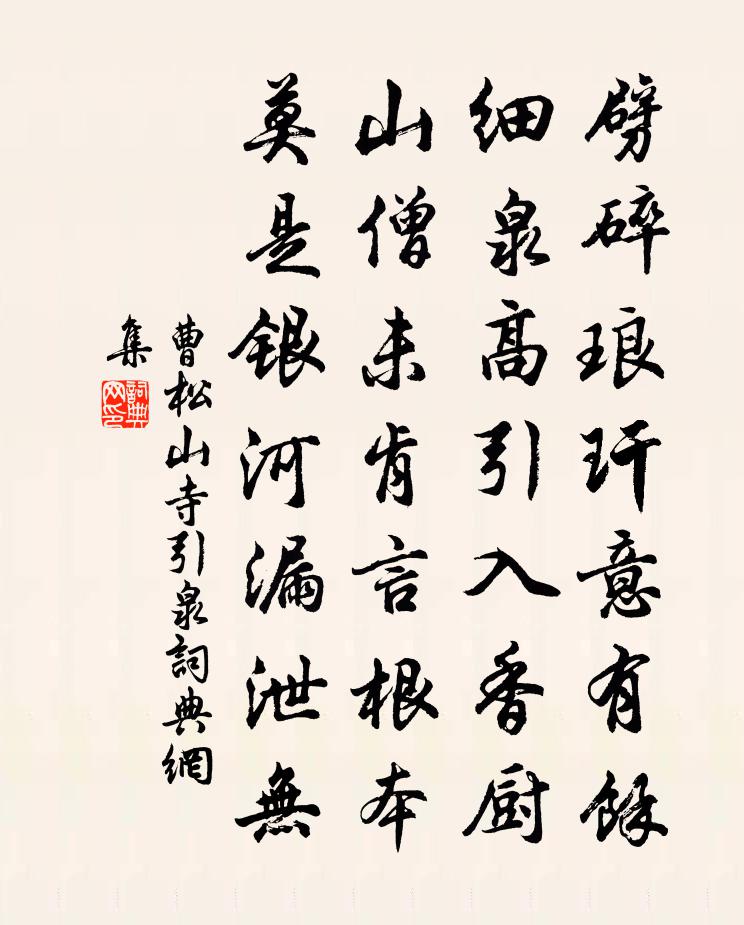 詩詞名句歷史字典書法欣賞書法字典國語詞典說文解字康熙字典古漢語字典標 題 作 者 詩 句 山寺引泉作者:曹松 朝代:唐代山寺引泉原文劈碎琅玕意有餘,細泉高引入香廚。山僧未肯言根本,莫是銀河漏泄無。詩詞問答問:山寺引泉的作者是誰?答:曹松問:山寺引泉寫於哪個朝代?答:唐代曹松山寺引泉書法欣賞山寺引泉書法作品詩詞推薦題齋壁陸游〔宋代〕門前枯葉滿荒街,堂下殘蕪擁土階。蓬蓽蕭條如旅店,豆蔬淡薄學僧齋。晝存真火溫枵腹,夜挽黃流灌病骸。喚取六月二十二日守陴百姓始下城方回〔宋代〕本不食官粟,亦令登敵樓。鳴桴木杪急,傳箭夜深愁。暗躡蛇纏膝,塵搔虱滿頭。傳聞賊寨破,今日得歸休。碣石庵戲贈湛庵主蘇軾〔宋代〕保康橋上夜觀燈,喝石岩前夏飲冰。莫把山林笑朝市,老夫手裡有烏藤。宿甘露寺黃庚〔宋代〕山險疑無路,縈迴一徑通。鐘聲寒瀑外,塔影夕陽中。窗出茶煙白,爐分葑火紅。禪房遇耆舊,清話數霄同。上禮部楊侍郎皇甫冉〔唐代〕郢匠掄材日,轅輪必盡呈。敢言當一乾,徒欲隸諸生。末學慚鄒魯,深仁錄弟兄。餘波知可挹,弱植更求榮。績愧山中雨辭高似孫〔宋代〕若古兮多奇,御夏兮高明。蹇千山兮在下,石吐泉兮泠泠。采新果兮半熟,被疏絺兮全輕。非老子兮孰悟,亦晉人再次韻四首陳造〔宋代〕詩愁磨盡鬢邊青,玄鑰無施閉理扃。牛渚錦官祠廟古,瓣香儻格在天靈。偈頌一百一十七首釋紹曇〔宋代〕萬疊青山,一溪寒水。花禁冷葉紅,草滴虛嵐翠,無位真人只者是。不離當處當湛然,左右逢原無二體。覷之瞎雙朝退偶題王禹偁〔宋代〕吏隱金門祗似閒,退朝窮巷懶開關。經年不到公卿宅,五日空隨侍從班。禁漏出花寒歷歷,御泉通市細潺潺。功名五月六日約諸友游北山舟已具而予偶不能出諸高斯得〔宋代〕區中無由舒眼界,欲上雲峰觀九派。頗聞黃龍擅奇特,儻得窺臨真一快。清苕一線僅委蛇,具區萬頃何滂湃。又聞偶題二首張耒〔宋代〕春水長流鳥自飛,偶然相值不相知。請君試采中塘藕,若道心空卻有絲。贈畢四曜杜甫〔唐代〕才大今詩伯,家貧苦宦卑。饑寒奴僕賤,顏狀老翁為。同調嗟誰惜,論文笑自知。流傳江鮑體,相顧免無兒。秋夜棹舟訪李隱君許渾〔唐代〕望月憶披襟,長溪柳半陰。高齋初釀酒,孤棹遠攜琴。犬吠秋山迥,雞鳴曉樹深。開門更欹枕,誰識野人心。何止言輓詩洪咨夔〔宋代〕雋手芥拾紫,忠肝蒲伏青。嬰龍雲氣直,縛虎雪毛腥。炊枕夢何短,書棺名更馨。眇然人物幾,墓草涕交零。禪人並化主寫真求贊釋正覺〔宋代〕性不疏通,機不捷敏。頹慵陋見聞,急快失容忍。一默清秋兮芙蓉華開,萬態浩春兮葛藤蔓引。獻帝徐鈞〔宋代〕卓操餘凶事可知,空臨南面竟何為。賓士關洛還遷許,終作奸雄盜取資。偈頌一百三十六首釋惟一〔宋代〕九月授衣,無衣可受。衲僧門下,別有要妙。新糊紙被烘來暖,一覺和衣到五更。聞得上方鍾皷動,又添一日在浮少年行杜牧〔唐代〕官為駿馬監,職帥羽林兒。兩綬藏不見,落花何處期?獵敲白玉鐙,怒袖紫金錘。田竇長留醉,蘇辛曲讓歧。豪持端午貼子詞皇后閣五首周麟之〔宋代〕不貪鬥草事詩書,溫采香芸辟蠹魚。永日揮毫自忘暑,滴殘宮硯玉蟾蜍。謝公擇舅分賜茶三首黃庭堅〔宋代〕文書滿案惟生睡,夢裡鳴鳩喚雨來。乞與降魔大圓鏡,真成破柱作驚雷。名句推薦意內稱長短,終身荷聖情。杜甫《端午日賜衣》 草木搖殺氣,星辰無光彩。李白《經亂離後天恩流夜郎憶舊遊書懷贈江夏韋太守良宰》 兩岸桃花烘日出,四圍高柳到天垂。姜彧《浣溪沙·山滴嵐光水拍堤》 綠桑高下映平川,賽罷田神笑語喧。歐陽修《田家》 日暖泥融雪半消,行人芳草馬聲驕。杜牧《宣州送裴坦判官往舒州時牧欲赴官歸京》 子規夜半猶啼血,不信東風喚不回。王令《送春》 兒童見說深驚訝,卻問何方是故鄉。殷堯藩《同州端午》 天子,兵強馬壯者當為之,寧有種耶!薛居正《舊五代史·後晉·列傳十三》 智不逾奸,伐之莫勝;知不至大,奸者難拒。來俊臣《羅織經·察奸卷第八》 殷勤花下同攜手。更盡杯中酒。美人不用斂蛾眉。葉夢得《虞美人·雨後同乾譽才卿置酒來禽花下作》