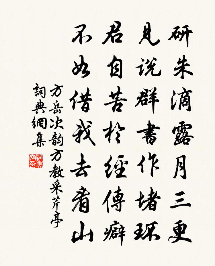 詩詞名句歷史字典書法欣賞書法字典國語詞典說文解字康熙字典古漢語字典標 題 作 者 詩 句 次韻方教采芹亭作者:方岳 朝代:宋代次韻方教采芹亭原文研朱滴露月三更,見說群書作堵環。君自苦於經傳癖,不如借我去看山。詩詞問答問:次韻方教采芹亭的作者是誰?答:方岳問:次韻方教采芹亭寫於哪個朝代?答:宋代方岳次韻方教采芹亭書法欣賞次韻方教采芹亭書法作品詩詞推薦羅敷水白居易〔唐代〕野店東頭花落處,一條流水號羅敷。芳魂艷骨知何在,春草茫茫墓亦無。頌古三十八首釋從瑾〔宋代〕融牆見角便騎牛,騎入戲塵鬧市游。游篇歸來欄里臥,三更半失蹤由。寶鏡吟柴元彪〔宋代〕荊山已童若耶涸,若耶可采山可鑿。金精少皞不敢秘,鑒壞飛就歐冶錯。祝融煽焰千丈芒,玄冥洗光萬里爍。冷侵漁家傲歐陽修〔宋代〕戰勝歸來飛捷奏。傾賀酒。玉階遙獻南山壽。小子只自夜來風氣又作腫連頤頷熱發心脾無以李至〔宋代〕此心未足便何如,官職於君不啻余。輦下十年前進士,省中四品次尚書。曾陪國相裨時少,亦掌王言屬思疏。終乞浣溪沙朱敦儒〔宋代〕風落芙蓉畫扇閒。涼隨春色到人間。乍垂羅幕乍飛鸞。好把深杯添綠酒,休拈明鏡照蒼顏。浮生難得是清歡。次韻張守曉起陳造〔宋代〕客亭移枕待殘更,起趁鄰雞第二聲。了了每添新悟解,營營無復舊心情。興來命酒禁詩瘦,老去衰容怯鏡明。況是琴操履霜操曹勛〔宋代〕皇之車兮,僕夫馳之。皇之輿兮,僕夫乘之。沉沉廣宇兮,燕雀安之。晨羞夕膳,誰其眎之。親不我思兮,我寧不賀新郎·挽住風前柳盧祖皋〔宋代〕彭傳師於吳江三高堂之前釣雪亭,蓋擅漁人之窟宅以供詩境也,趙子野約余賦之。挽住風前柳,問鴟夷當日扁舟,南園雜詩六首見山台書臥偶成司馬光〔宋代〕移床獨上高台臥,颯颯涼風吹面過。林蟬忽噪驚薄夢,手執殘書幅巾墮。偈頌七十六首釋師範〔宋代〕五峰門下,百種全無。僧床迫窄,堂供蕭疏。腳下踏著底,破磚頭碎瓦礫。面前撞見底,王獦獠李麻胡。恁麽薄福游崇真觀南樓,睹新及第題名處魚玄機〔唐代〕雲峰滿目放春晴,歷歷銀鉤指下生。自恨羅衣掩詩句,舉頭空羨榜中名。好事近(壽黃仲符)王千秋〔宋代〕人物又無雙,餘事錦機閒織。□就兩都新賦,笑一生聯緝。來年秋色起鵬程,一舉上晴碧。須洗玉荷為壽,助穿楊除夜苦雨薛嵎〔宋代〕華發負滄洲,星霜又一周。未憑終夜雨,能洗隔年愁。池草起吟思,樹禽棲屋頭。空餘壯心在,燈下看吳鉤。首尾吟邵雍〔宋代〕堯夫非是愛吟詩,詩是堯夫自試時。事體待諳然後信,人情非久莫能知。同沾雨露蒿萊質,獨出雪霜松柏姿。見慣晚夏郡中臥疾羊士諤〔唐代〕事外心如寄,虛齋臥更幽。微風生白羽,畏日隔青油。用拙懷歸去,沉痾畏借留。東山自有計,蓬鬢莫先秋。梓人傳柳宗元〔唐代〕裴封叔之第,在光德里。有梓人款其門,願傭隙宇而處焉。所職,尋、引、規、矩、繩、墨,家不居礱斫之器。問遣興周文璞〔宋代〕望見山櫻媚短岑,翻然便悔出家林。壞車殺馬空嗟晚,裂芰焚荷直到今。筍蕨久為歸去計,雲煙無復舊來心。平生老僧(一作鄭綮詩)景雲〔唐代〕日照西山雪,老僧門始開。凍瓶粘柱礎,宿火焰爐灰。童子病歸去,鹿麑寒入來。齋鍾知漸近,枝鳥下生台。詠齋偶書呈通無隱朱長文〔唐代〕夙志在蕭間,獲此遁幽跡。喬林無冬春,蒼靄異晨夕。旁窺疑好峰,俯瞰驚峭壁。浩然溪山興,盡在陶潛宅。杖藜名句推薦低頭羞見人,雙手結裙帶。毛鉉《 * 詞·下床著新衣》 半夜呼兒趁曉耕,羸牛無力漸艱行。顏仁郁《農家》 落月滿屋樑,猶疑照顏色。杜甫《夢李白二首·其一》 別離還有經年客,悵望不如河鼓星。徐凝《七夕》 聞善以相告也,見善以相示也戴聖《禮記·儒行》 雲盡月如練,水涼風似秋。歐陽詹《荊南夏夜水樓懷昭丘直上人云夢李莘》 君子不自大其事,不自尚其功戴聖《禮記·表記》 同穴窅冥何所望,他生緣會更難期。元稹《遣悲懷三首·其三》 歲月無多人易老,乾坤雖大愁難著吳潛《滿江紅·豫章滕王閣》 淺情終似,行雲無定,猶到夢魂中。晏幾道《少年游·離多最是》