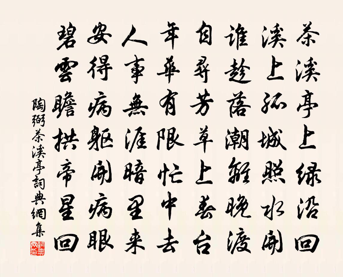 詩詞名句歷史字典書法欣賞書法字典國語詞典說文解字康熙字典古漢語字典標 題 作 者 詩 句 茶溪亭作者:陶弼 朝代:宋代茶溪亭原文茶溪亭上綠沿回,溪上孤城照水開。誰趁落潮離晚渡,自尋芳草上春台。年華有限忙中去,人事無涯暗裡來。安得病軀開病眼,碧雲瞻拱帝星回。詩詞問答問:茶溪亭的作者是誰?答:陶弼問:茶溪亭寫於哪個朝代?答:宋代陶弼茶溪亭書法欣賞茶溪亭書法作品詩詞推薦牡丹李商隱〔唐代〕錦幃初卷衛夫人,繡被猶堆越鄂君。垂手亂翻雕玉佩,招腰爭舞鬱金裙。石家蠟燭何曾剪,荀令香爐可待熏。我是赴陳留二首陳與義〔宋代〕草草一夢闌,行止本難期。歲晚陳留路,老馬三振鬐。自看鞭袖影,曠野日落遲。柳林行不盡,想來見春時。點點迎春樂(雙調·第二)周邦彥〔宋代〕桃蹊柳曲閒蹤跡。俱曾是、大堤客。解春衣、貰酒城南陌。頻醉臥、胡姬側。鬢點吳霜嗟早白。更誰念、玉溪訊息聽廬山胡道士彈離騷樂雷發〔宋代〕吊湘誰解薦江蘺,忠憤泠泠寫七絲。愁絕九疑山下聽,重華應許就陳詞。五歌水鳥陸龜蒙〔唐代〕水鳥山禽雖異名,天工各與雙翅翎。雛巢吞啄即一例,游處高卑殊不停。則有觜鈹爪戟勁立直視者,擊搏挽裂圖膻五月二十三夜記夢陸游〔宋代〕夜漏欲盡雞初唱,夢到神仙信非妄。泉流直舂碧澗底,松根橫走蒼崖上。徐行林際遇飛橋,峭壁驚濤臨萬丈,非惟黃鶴洞中仙 繼重陽韻馬鈺〔元代〕傳得清虛劍。心內深深點。木上金絲來往牽。馬風占。更把風搖。卦象常推漸。功行時時檢。黃鶴沿中仙要成,郿塢蘇轍〔宋代〕董公平昔甚縱橫,晚歲藏金欲避兵。當日英雄智相似,燕南趙北亦為京。鏟孟郊體七首謝翱〔宋代〕閨中玻黎盆,貯水看落月。看月復看日,日月從此出。愛此日與月,傾寫入妾懷。疑此一掬水,中涵濟與淮。淚落圓機和邵大及予二詩可謂壓倒五更枕上誦嘆不晁說之〔宋代〕去歲巢乾燕子歸,生涯辛苦問何時。門前似覺酒徒散,坐上何嘗筆力衰。郡印故人能若若,田廬晚友亦差差。莫嫌江梅引 寧海范明叔邀飯,覽月桂花王哲〔元代〕凌晨靜至樂倍,倚闌隈。*奇材。正是蟾宮。餘影世間來。遂得晴空甘露力,潤根*,發修條,偉又瑰。能綻粉苞落鴻范成大〔宋代〕落鴻聲里怨關山,淚濕秋衣不肯乾。只道一番新雨過,誰知雙袖倚樓寒。觀南堤魏了翁〔宋代〕吏報南郊役事休,好風吹袂到江頭。長堤飲水馬非馬,疊石護田牛戴牛。處處女筐蠶望歲,村村社鼓麥祈秋。守臣七字長句敬餞提刑寺丞胡元之持節桂林楊萬里〔宋代〕江西太守說誰子,只說吉州有新事。棘闈照日動碧鱗,粉堞入雲橫爛銀。三年八邑邑邑熟,一任千日日日春。君不李處士輓詩葉適〔宋代〕憶吟詩句與君兒,曾說高宗涕自揮。兩地兵休重富樂,百年家活共輕肥。多留螢火明書案,閒看魚蓑傍釣磯。身內送王使君赴太原拜節度副使司空曙〔唐代〕新從劉太尉,結束向并州。絡腦青絲騎,盤囊錦帶鉤。出關逢將校,下嶺擁戈矛。匣閉黃雲冷,山傳畫角秋。劍鋒新寒戲簡尤延之檢正楊萬里〔宋代〕逗曉添衣並數重,隔哺剩熱尚斜紅。秋生露竹風荷外,寒到雲窗霧合中。半點暄涼能幾許,古來豪傑總成空。木犀示兒洪鉞〔宋代〕豫章實佳木,尋丈早異眾。匠石雖未顧,終解作梁棟。社棟大蔽牛,不資世所用。棄置成散材,歲久即空洞。誠由魯城北郭曲腰桑下送張子還嵩陽李白〔唐代〕送別枯桑下,凋葉落半空。我行懵道遠,爾獨知天風。誰念張仲蔚,還依蒿與蓬。何時一杯酒,更與李膺同。和李子儀韻四首吳芾〔宋代〕甚矣吾兒病,求安欲籲天。憂心千里切,喜信一朝傳。遠勝開金穴,渾如得寶鞭。若非天相我,今日豈能然。名句推薦木蘭舟上珠簾卷,歌聲遠,椰子酒傾鸚鵡盞。李珣《南鄉子·山果熟》 風摧寒棕響,月入霜閨悲。李白《獨不見》 木蘭舟上,何處吳娃越艷:藕花紅照臉。孫光憲《河傳·風颭》 誠信者,天下之結也。管仲《管子·樞言》 父老得書知我在,小軒臨水為君開。蘇軾《送賈訥倅眉》 使殺生之機,奪予之要在大臣,如是者侵。韓非及後人《韓非子·三守》 城邊有古樹,日夕連秋聲。李白《沙丘城下寄杜甫》 故人何不返,春華復應晚。柳惲《江南曲》 迢迢新秋夕,亭亭月將圓。陶淵明《戊申歲六月中遇火》 誰言寸草心,報得三春暉。孟郊《遊子吟 / 迎母漂上作》