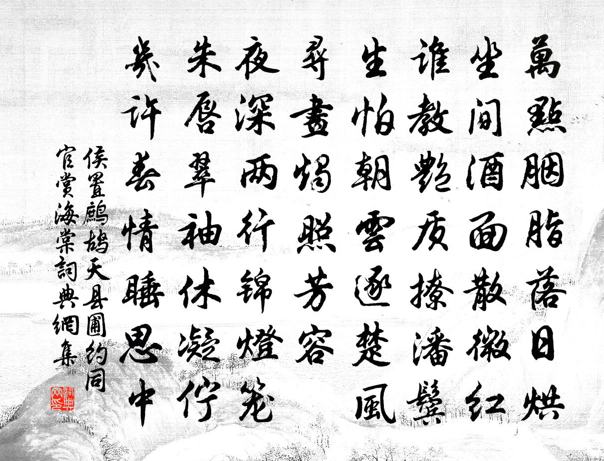 詩詞名句歷史字典書法欣賞書法字典國語詞典說文解字康熙字典古漢語字典標 題 作 者 詩 句 鷓鴣天(縣圃約同官賞海棠)作者:侯置 朝代:宋代原文萬點胭脂落日烘。坐間酒面散微紅。誰教艷質撩潘鬢,生怕朝雲逐楚風。尋畫燭,照芳容。夜深兩行錦燈籠。朱唇翠袖休凝佇,幾許春情睡思中。詩詞問答問:《鷓鴣天(縣圃約同官賞海棠)》的作者是誰?答:侯置問:該詩寫於哪個朝代?答:宋代問:該詩是什麼體裁?答:詞書法欣賞鷓鴣天(縣圃約同官賞海棠)書法作品詩詞推薦法曲獻仙音·聚景亭梅次草窗韻王沂孫〔宋代〕層綠峨峨,纖瓊皎皎,倒壓波痕清淺。過眼年華,動人幽意,相逢幾番春換。記喚酒尋芳處,盈盈褪妝晚。已銷黯五泄山劉述〔宋代〕翠屏千疊水潺潺,一簇青鴛杳靄間。惜是晚年逢此境,悔將前眼看他山。瀑飛蘿磴終難畫,龍蟄岩雲只蹔閒。薄宦自仙潭治歸舟呈王鷗盟楊冠卿〔宋代〕江頭重整舊漁衣,觸起眠沙鷗鷺機。煙渚蘆花留不住,葉舟還趁夕陽歸。減字木蘭花·賣花擔上李清照〔宋代〕賣花擔上。買得一枝春欲放。淚染輕勻。猶帶彤霞曉露痕。 怕郎猜道。奴面不如花面好。雲鬢斜簪。徒要教郎比民夫宋伯仁〔宋代〕閫帥差夫欲太平,浚河才了又修城。挑小組鍫鑊無休日,失業妻兒有嘆聲。兩個布衫寒透骨,半盂蒸飯冷無羹。何入湧泉道中程師孟〔宋代〕告老清朝分自安,從今榮悴不相關。有愁方見田家樂,無事才知釣叟閒。世故要看終始後,人生未免是非間。婦憤親耕籍田七首佚名〔宋代〕群公灰相,奉事齊莊。率時農天,舉耜載揚。播厥百台,以佑我皇。多黍多稌,丕應農祥。從軍樂二首姚合〔唐代〕每日尋兵籍,經年別酒徒。眼疼長不校,肺病且還無。僮僕驚衣窄,親情覺語粗。幾時得歸去,依舊作山夫。朝朝秋夕寄友人羅鄴〔唐代〕秋夕蒼茫一雁過,西風白露滿宮莎。昨來京洛逢歸客,猶說軒車未渡河。莫把少年空倚賴,須知孤立易蹉跎。想君永遇樂(五日)周紫芝〔宋代〕槐幄如雲,燕泥猶濕,雨余清暑。細草搖風,小荷擎雨,時節還端午。碧羅窗底,依稀記得,閒系翠絲煙縷。到如和侃法師庾信〔南北朝〕秦關望楚路,灞岸想江潭。幾人應落淚,看君馬向南。重午山蹊獨步洪咨夔〔宋代〕扶病索清蔭,循林步幽霏。花拈勃姑飯,草拾蝦蟆衣。良藥觴手是,壯容轉頭非。易補天上漏,難駐人間暉。寒暑競秀閣朱翌〔宋代〕輞川遙展右丞圖,盤谷中藏李原居。龍睡潭深飛客櫂,鳳鳴枝才結吾廬。但令蠟屐去前齒,安用鴟夷托後車。西望與行肇師宿廬山棲賢寺釋惟鳳〔宋代〕冰瀑寒侵室,圍鑪靜話長。詩心全大雅,祖意會諸方。磬斷危杉月,燈殘古塔霜。無眠向遙夕,又約去衡陽。淮安軍文天祥〔宋代〕楚州城門外,白楊吹悲風。累累死人塚,死向鋒鏑中。豈無匹婦冤,定無萬夫雄。中原在其北,登城望何窮。出廣州第一宿文天祥〔宋代〕越王台下路,搔首嘆萍蹤。城古都招水,山高易得風。鼓聲殘雨後,塔影暮林中。一樣連營火,山同河不同。泊定海夜哭李鄴嗣〔清代〕頻年國破淚,此日更難收。積血知龍斗,遺民問馬流。乾坤迷鼓角,風雨濺刀頭。太息殘生在,黃冠何所投。送夢上人歸京貫休〔唐代〕伊余龍鍾歸海涯,千山萬水情自怡。夢公別我還上國,江邊慘執行遲遲。向我道雲中覓伴未得伴,又示我數首新詩水龍吟(送戴郎中漕荊襄)曹勛〔宋代〕曉雲閣雨。疏梅綴玉,塵尾聞談吐。精忠許國,才華扌離錦,塵勞釋去。六印雄圖,百川明辯,蘇張誰數。有奇謀和仲固春日村居即事十二絕胡寅〔宋代〕正眼如君了了明,未嘗沉醉本來醒。自將周易規兒輩,白馬空傳一藏經。名句推薦人生貴得適意爾,何能羈宦數千里以要名爵!劉義慶《世說新語·識鑒》 到頭來,依舊是風塵骯髒違心愿。曹雪芹《紅樓夢·第五回》 誰人背後無人說,哪個人前不說人?佚名《增廣賢文·上集》 前年過代北,今歲往遼西薛道衡《昔昔鹽》 豈能無意酬烏鵲,惟與蜘蛛乞巧絲。李商隱《辛未七夕》 以眾擊寡,利以清晨;強弩長兵,利以捷次諸葛亮《將苑·卷二·便利》 芳樹無人花自落,春山一路鳥空啼。李華《春行即興》 遊人日暮相將去,醒醉喧譁。歐陽修《採桑子·清明上巳西湖好》 朱門酒肉臭,路有凍死骨。杜甫《自京赴奉先縣詠懷五百字 / 自京赴奉先詠懷五百字》 倉無備粟,不可以待凶飢。墨子《墨子·05章 七患》