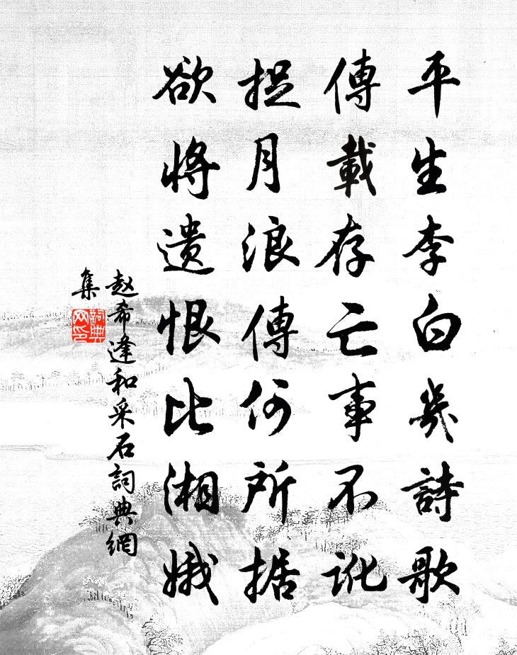 詩詞名句歷史字典書法欣賞書法字典國語詞典說文解字康熙字典古漢語字典標 題 作 者 詩 句 和採石作者:趙希逢 朝代:宋代和採石原文平生李白幾詩歌,傳載存亡事不訛。捉月浪傳何所據,欲將遺恨比湘娥。詩詞問答問:和採石的作者是誰?答:趙希逢問:和採石寫於哪個朝代?答:宋代趙希逢和採石書法欣賞和採石書法作品詩詞推薦梅岩馬廷鸞〔宋代〕卓哉青壁插晴空,古貌稜稜列士風。人物山川相與重,是間知有植鰭翁。將發洛中枉令狐相公手札兼辱二篇寵行以長句白居易〔唐代〕尺素忽驚來梓澤,雙金不惜送蓬山。八行落泊飛雲雨,五字鎗鏦動佩環。玉韻乍聽堪醒酒,銀鉤細讀當披顏。收藏金縷曲(壽李公謹同知)劉辰翁〔宋代〕我誤留公住。看人間、猶是重陽,滿城風雨。父老堂陰攜孺子,記得元宵歌舞。但稽首、烏烏無語。我有桓箏千年搗衣篇劉希夷〔唐代〕秋天瑟瑟夜漫漫,夜白風清玉露漙。燕山遊子衣裳薄,秦地佳人閨閣寒。欲向樓中縈楚練,還來機上裂齊紈。攬紅題水陸寺黃杞〔宋代〕殿樓邊翠麓,窗戶俯清湘。遊客匆匆去,高僧白日長。壽牛都大李劉〔宋代〕律中黃鐘九日前,長淮巨海降真賢。鵬程九萬快搏系,騋牝三千表塞淵。夜看牛星貫南極,早攜鶴馭出西川。梅花湘陰陳隆之〔宋代〕瀟湘天下景,絕勝是湖山。水國三千界,煙光十二鬟。乾坤水鑒里,樓閣畫屏間。有路憑風馭,心隨倦鳥還。小築陸游〔宋代〕小築湖邊避俗囂,幾年於此寓簞瓢。雖非隱士子午谷,寧媿詩人丁卯橋?羅雀門庭無俗駕,緣雲磴路有歸樵。詩情望海樓晚景五絕蘇軾〔宋代〕樓下誰家燒夜香,玉笙哀怨弄初涼。臨風有客吟秋扇,拜月無人見晚妝。歸雲洞陳洵直〔宋代〕眾真霞佩上三天,誰見回飈□駕旋。洞府後門人不信,片雲鶴鶴是歸仙。除夕感懷譚嗣同〔清代〕斷送古今惟歲月,昏昏臘酒又迎年。誰知羲仲寅賓日,已是共工缺陷天。桐待鳳鳴心不死,澤因龍起腹難堅。寒灰挽潼帥許侍郎成子三首程公許〔宋代〕天地英靈氣,風雲感會期。龍頭推蜀產,骨鯁自天知。雨露榮在妝,江湖滯一麾。甲兵何日洗,遠慮憶蓍龜。芳臭劉克莊〔宋代〕流芳斜谷出師表,遺臭樊城受禪碑。芳臭即今皆判矣,鮑魚難揜祖龍屍。丁酉重九日宿順昌步雲閣絕句七首呈味道明府劉克莊〔宋代〕先倩清風掃水軒,更呼涼月倒金樽。定知明府歸侵夜,縣郭留燈未閉門。枕上聞風鈴陸游〔宋代〕毒暑今年倍故常,蚊聲四合欲舁床。老人不辦搖團扇,靜聽風鈴意已涼。句元絳〔宋代〕神石溪頭好明月,夜來誰此憑蘭橈。衛卿叔自青暘寄詩一卷以飲酒果核殽味烹茶齋葛立方〔宋代〕玉軑華芝今省方,西風索索吹繖黃。汴京宮闕秋草長,望風屑涕心淒涼。襲粲用命嗟何嘗,義軍誰是竹園娘。黠羌上亭北軒對月吹笛得才元舍人昭華引醉霜月草文同〔宋代〕群山暝色煙開後,遠水寒光雨過時。今夜何人醉霜月,臥聽緱嶺玉參差。四並堂葛密〔宋代〕華圃控弦秋習射,寒窗留燭夜鈔書。良辰美景饒心事,觀日相併樂起予。潯陽晁公溯〔宋代〕渺渺蒼江繞郭流,菰蒲杜若滿汀洲。山雲不動飛黃鶴,黃水無邊沒白鷗。日落荒城聞戍鼓,天清絕浦見行舟。老夫名句推薦桑野就耕父,荷鋤隨牧童。孟浩然《田家元日》 天地交而萬物通也,上下交而其志同也。佚名《易傳·彖傳上·泰》 背若泰山,翼若垂天之雲。莊周《逍遙遊(節選)》 怨別自驚千里外,論交卻憶十年時。高適《東平別前衛縣李寀少府 / 送前衛縣李宷少府》 越女新妝出鏡心,自知明艷更沉吟。張籍《酬朱慶餘》 卻道“天涼好個秋”!辛棄疾《醜奴兒·書博山道中壁》 林下春晴風漸和,高崖殘雪已無多。王守仁《春晴》 雁行緣石徑,魚貫度飛梁。鮑照《代出自薊北門行》 坐愁群芳歇,白露凋華滋。李白《秋思》 不受苦中苦,難為人上人。吳承恩《西遊記·第三十二回》