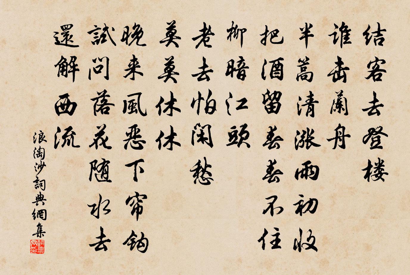 結客去登樓。誰擊蘭舟。半篙清漲雨初收。把酒留春春不住,柳暗江頭。
