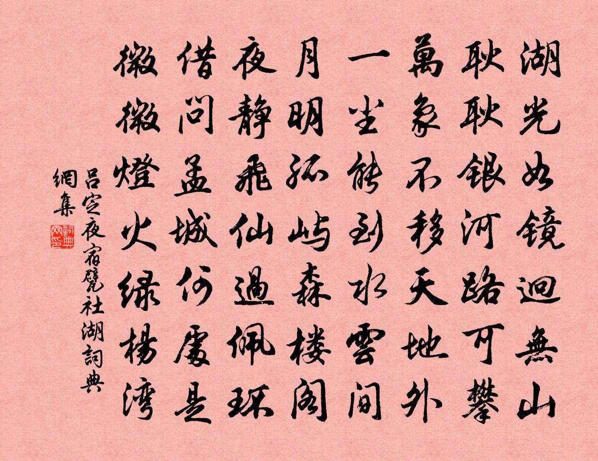 詩詞名句歷史字典書法欣賞書法字典國語詞典說文解字康熙字典古漢語字典標 題 作 者 詩 句 夜宿甓社湖作者:呂定 朝代:宋代夜宿甓社湖原文湖光如鏡迥無山,耿耿銀河路可攀。萬象不移天地外,一塵能到水雲間。月明孤嶼森樓閣,夜靜飛仙過佩環。借問孟城何處是,微微燈火綠楊灣。詩詞問答問:夜宿甓社湖的作者是誰?答:呂定問:夜宿甓社湖寫於哪個朝代?答:宋代呂定夜宿甓社湖書法欣賞夜宿甓社湖書法作品詩詞推薦送客姜特立〔宋代〕今日出郊送客,明朝肩輿入州。六十年前伎倆,白頭也合歸休。和津喜雪二首吳芾〔宋代〕六花一夜降中天,飛繞吾廬頓滿前。紀出仙家新窟宅,疑非塵世舊山川。但驚岩上青松老,不見天邊白雁連。賴有袷享八首真宗〔宋代〕[太簇徽]於昭孝治,通乎神明。寒暑不忒,熙事備成。牲牲孔碩,黍稷惟聲。以享以祀,來燕來寧。崇寧壬午臨汝四月始聞鶯二首張耒〔宋代〕好音終在恥爭先,谷外寒多故後遷。已過花時亦何恨,不妨夏木綠參天。頌古三十二首釋明辯〔宋代〕玉洞玄關道路長,蟠桃豈是等閒芳。遮藏不許人間見,只恐春風漏泄香。茶鄭清之〔宋代〕書如香色倦猶愛,茶似苦言終有情。慎勿教渠紈褲識,珠槽碎釜浪相輕。偈頌十首釋如淨〔宋代〕今朝日南長至,黑豆生芽。大眾恭惟懽慶,鐵樹開花。如何結果,龍馳虎驟,撒土拋沙。鹹淳甲戌第二朔予道櫧洲里筆畋方諫自長沙來文天祥〔宋代〕君為湘水燕,我作衡陽雁。雁去燕方留,白雲草迷岸。薄命女(一名長命女)和凝〔唐代〕天欲曉,宮漏穿花聲繚繞,窗里星光少。冷露寒侵帳額,殘月光沈樹杪。夢斷錦幃空悄悄,強起愁眉小。四塊玉·別情關漢卿〔元代〕自送別,心難捨,一點相思幾時絕。憑闌袖拂揚花雪:溪又斜,山又遮,人去也。賦周畏知寓齋張栻〔宋代〕知君隨寓即能安,久矣家山詠考盤。幕府漫遊從鬢禿,竹作寄傲有書觀。此身詎可忘三省,世路何妨閱萬端。俯仰哭丹池王隱君陳起〔宋代〕憶昔相逢初,一見即刮目。出處雖不齊,椒蘭則同馥。論心到極處,情愛逾骨肉。十年傳成癖,搰搰閉門讀。高志湖州歌九十八首 其十五汪元量〔宋代〕曉來宮櫂去如飛,掠削鬟雲淺畫眉。風雨淒淒能自遣,三三五五坐彈棋。送路應求赴郢守曾幾〔宋代〕一雨全清去路塵,石城風物話臨分。了無獄訟勞官長,賸有江山奉使君。樓上今誰能和曲,鼻端那復可揮斤。吾人琴川精舍寄城中友人趙希邁〔宋代〕客來僧已去,古屋靜蕭蕭。敲石引松火,對花懸酒瓢。窗欞寒背日,柱礎潤通潮。君肯過幽寂,水程才隔宵。八月十五夜月舒岳祥〔宋代〕引夜十分月,年時中半秋。華夷同一照,今古幾多愁。顥氣橫空白,天光際海浮。兒時讀書處,桂子落岩幽。岳王墳唐順之〔明代〕國恥猶未雪,身危亦自甘。九原人不返,萬壑氣長寒。豈恨藏弓早,終知借劍難。吾生非壯士,於此發衝冠。比得牡丹謂常品耳開花乃醉四施甚奇錢時〔宋代〕姑射山人玉雪肌,是誰污作醉西施。草間天艷無人識,不到花開總不知。浣溪沙(以貢茶、瀋水為揚齊伯壽)張孝祥〔宋代〕北苑春風小鳳團。炎州瀋水勝龍涎。殷勤送與繡衣仙。玉食鄉來思苦口,芳名久合上凌煙。天教富貴出長年。和元帥書記蕭郎中觀習水師徐鉉〔唐代〕元帥樓般出治兵,落星山外火旗明。千帆日助江陵勢,萬里風馳下瀨聲。殺氣曉岩波上鷁,凱歌遙駭海邊鯨。促宣名句推薦須作一生拚,盡君今日歡。牛嶠《菩薩蠻·玉爐冰簟鴛鴦錦》 雪聲偏傍竹,寒夢不離家。戎昱《桂州臘夜》 天地生君子,君子理天地。荀子《荀子·王制》 今日清明節,園林勝事偏。賈島《清明日園林寄友人》 懷家寒食夜,中酒落花天。趙長卿《臨江仙·暮春》 春山煙欲收,天淡星稀小牛希濟《生查子·春山煙欲收》 豪傑向簡淡中求,神仙從忠孝上起。陳繼儒《小窗幽記·集醒篇》 與人不求備,檢身若不及佚名《尚書·商書·伊訓》 鳥無聲兮山寂寂,夜正長兮風淅淅。李華《弔古戰場文》 王國富民,霸國富士;僅存之國,富大夫;亡道之國,富倉府劉向《說苑·政理》
