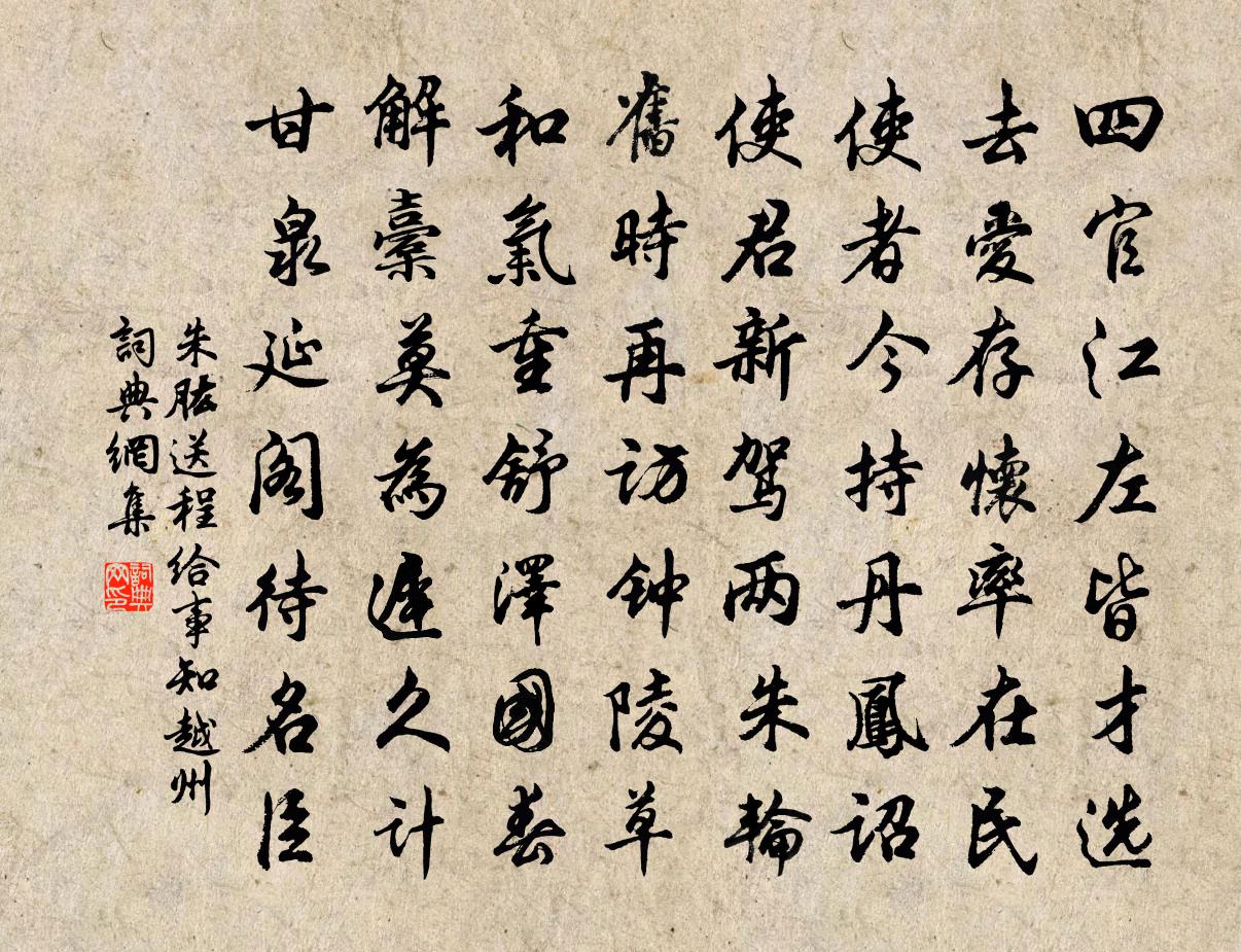 詩詞名句歷史字典書法欣賞書法字典國語詞典說文解字康熙字典古漢語字典標 題 作 者 詩 句 送程給事知越州作者:朱肱 朝代:宋代送程給事知越州原文四官江左皆才選,去愛存懷率在民。使者今持丹鳳詔,使君新駕兩朱輪。舊時再訪鍾陵草,和氣重舒澤國春。解橐莫為遲久計,甘泉延閣待名臣。詩詞問答問:送程給事知越州的作者是誰?答:朱肱問:送程給事知越州寫於哪個朝代?答:宋代朱肱送程給事知越州書法欣賞送程給事知越州書法作品詩詞推薦登岸山觀用前韻蔡戡〔宋代〕病足蹣跚好罷休,又登絕頂故遲留。霜明楓葉紅如染,露挹嵐光翠欲流。遠目無窮休更望,賞心未足卜重遊。超然和方耜岩見寄何夢桂〔宋代〕世事興亡轉腳跟,長安處處戰場塵。種桃一去非秦世,採菊猶傳有晉人。已矣覆蕉成夢鹿,誰歟被發趁騎麟。千年頌古一百則釋正覺〔宋代〕綴綴功過,膠膠因果。鏡外狂奔演若多,杖頭擊著破灶墮。灶墮破,來相賀,卻道從前辜負我。常祀五享三首真宗〔宋代〕奕奕清齋,昭穆定位。霜露增感,粢盛潔祭。神靈來格,福祉攸暨。追孝奉先,本支百世。禪人求贊四首釋宗杲〔宋代〕鄒搜斂似天烝棗,輕輕觸著便煩惱。身著如來三事衣,口中謗佛法僧寶。從來纖芥不與人,一毫不就他人討。驀然寄帥初舒岳祥〔宋代〕寄語榆林戴,年來書不靈。翠微雙鬢白,茅舍一燈青。醉後窮豪在,吟成老健能。楊梅時節近,吾欲理行縢。頌古三十一首釋原妙〔宋代〕 * 猶可恕,再犯豈能容。貶向無生國,千聖不知蹤。醉歸陸游〔宋代〕持酒江頭到夕霏,愁城頓覺解重圍。澄波宜月移船看,醉面便風走馬歸。末路已驚添白髮,故人頻報上黃扉。強隨杏花天(無題)辛棄疾〔宋代〕病來自是於春懶。但別院、笙歌一片。蛛絲網遍玻璃盞。更問舞裙歌扇。有多少、鶯愁蝶怨。甚夢裡、春歸不管。醜奴兒/採桑子黃庭堅〔宋代〕濟楚好得些。憔悴損、都是因它。那回得句閒言語,傍人盡道,你管又還鬼那人唦。得過口兒嘛。直勾得、風了自定海陳著〔宋代〕一夜南風便葉舟,天教償我定川游。兩崖踞海潮吞腳,萬石封堤水掉頭。家家活計魚蝦市,處處歡聲鼓笛樓。不用宿西湖上竺王鎡〔宋代〕不收石上著殘棋,山月無聲鶴睡時。落葉打窗霜滿屋,有僧吟得夜寒詩。句吳沆〔宋代〕羽衛連荊棘,衣冠雜虎狼。煙沉鳧雁斷,天闊水雲黃。……風悲雲動色,天慘日無光。付二郎任希夷〔宋代〕望前一日正芳春,我祖當年慶誕辰。欒葉有孫同此日,吾門他日寵光新。梅山周公挽章徐瑞〔宋代〕才力千鈞弩,襟期百尺樓。吾生能幾見,異世有同流。起起悲前夢,堂堂閟一丘。衰榮動州里,外此復何求。秋日登樓客次懷張覃進士潘閬〔宋代〕聞說飄零亦異鄉,登樓吟望益悲涼。當時欲別言難盡,他日相逢話更長。蟬噪水村千萬樹,雁過雲岫兩三行。明朝和催雪衛宗武〔宋代〕我欲問天天穹窿,歲卜其有於歲終。胡然玄律欲遒盡,燠乎一歲融而沖。凍膚未起玉樓粟,寒力尚怯珠槽紅。臘前愛筍陳造〔宋代〕犀非犀,玉非玉,拂拂輕霜浮脆綠。披籜含梢欲成竹,娟娟褭褭森可束。稀間只稱佳月照,勁處差耐清風觸。少忍和蔡提乾二首釋道璨〔宋代〕落盡燈花獨倚闌,四檐風雨夜漫漫。也知憂樂先天下,不是推敲字未安。送周伯暘之餘姚連文鳳〔宋代〕佳友難為別,何時重盍簪。客衣黃葉滿,書屋白雲深。落月生離夢,寒蛩助越吟。抱琴從此去,虞氏有遺音。名句推薦落木蕭蕭,琉璃葉下瓊葩吐。王十朋《點絳唇·素香丁香》 紅豆不堪看,滿眼相思淚。牛希濟《生查子·新月曲如眉》 林壑斂暝色,雲霞收夕霏。謝靈運《石壁精舍還湖中作》 梅花散彩向空山,雪花隨意穿簾幕。王旭《踏莎行·雪中看梅花》 阿香秋夢起嬌啼,玉女傳幽素。吳文英《燭影搖紅·越上霖雨應禱》 三月正當三十日,占得,春光畢竟共春歸。莊棫《定風波·為有書來與我期》 春未綠,鬢先絲。人間別久不成悲。姜夔《鷓鴣天·元夕有所夢》 夜飲東坡醒復醉,歸來仿佛三更。家童鼻息已雷鳴。蘇軾《臨江仙·夜飲東坡醒復醉》 既秉上皇心,豈屑末代誚。謝靈運《七里瀨》 獨往獨來,獨出獨入,孰能礙之?列子及其弟子《列子·力命》