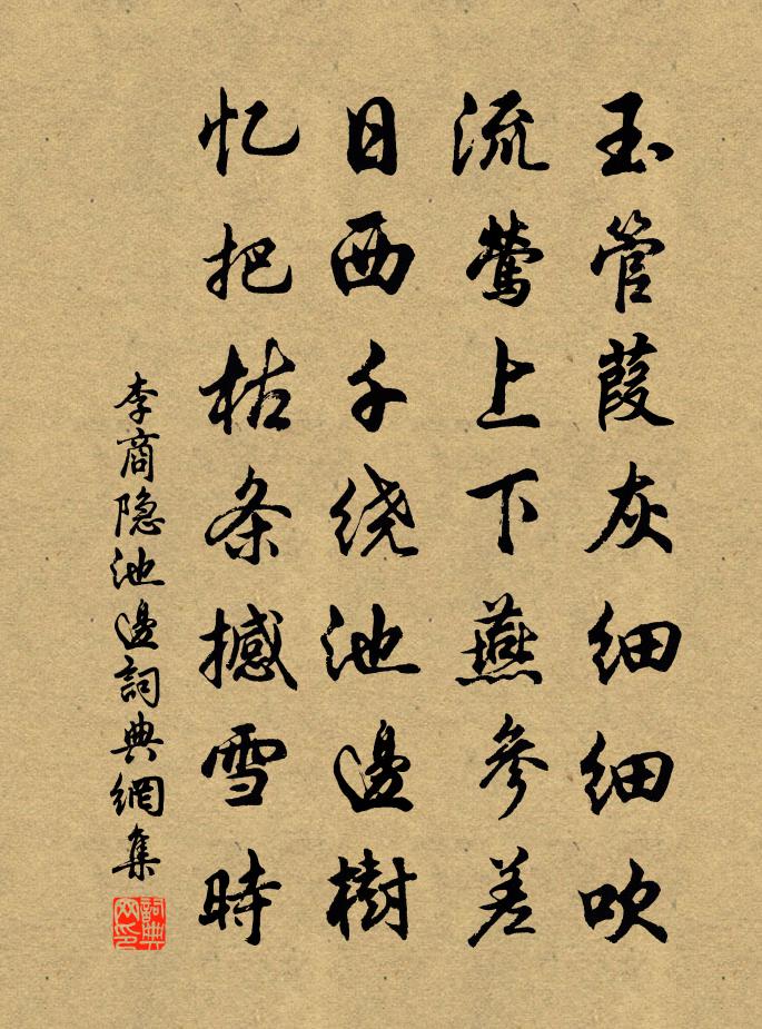 詩詞名句歷史字典書法欣賞書法字典國語詞典說文解字康熙字典古漢語字典標 題 作 者 詩 句 池邊作者:李商隱 朝代:唐代池邊原文玉管葭灰細細吹,流鶯上下燕參差。日西千繞池邊樹,憶把枯條撼雪時。詩詞問答問:池邊的作者是誰?答:李商隱問:池邊寫於哪個朝代?答:唐代問:池邊是什麼體裁?答:七絕問:李商隱的名句有哪些?答:李商隱名句大全李商隱池邊書法欣賞池邊書法作品注釋全唐詩:卷540-148詩詞推薦余既和樂天詩而喜於年及之心猶不能自已又復吳芾〔宋代〕封章上達已經旬,所乞原非為賤貧。七秩自知非久客,一心只欲作閒人。雖慚綠鬢朱顏改,卻喜清泉白石親。榮辱董侍郎生日三首魏了翁〔宋代〕潞公曩自蜀遄歸,約僅逾年秉政機。當日燕毛誰與並,後來接踵未應稀。從星元合陪天柱,戴氣寧當遠日畿。會看鷓鴣天石孝友〔宋代〕花漏聲乾月隱牆。琯灰迎曉透新陽。物情漸逐雲容好,歡意偏隨日腳長。山作鼎,玉為漿。壽杯叢處艷梅妝。醉鄉聞雁寄故人徐鉉〔唐代〕久和他鄉客,深慚薄宦非。不知雲上雁,何得每年歸。夜靜聲彌怨,天空影更微。往年離別淚,今夕重沾衣。次韻四絕末莉花樓鑰〔宋代〕江南創見喜孤芳,見說閩花遍海鄉。安得一居香盛處,帳中巧作寶毬妝。題蘇子瞻書夫天慶觀乳泉賦帖王亞夫〔宋代〕蘇公早聞道,文章乃其戲。乳泉出重海,作賦聊記異。玉池咽中夜,挈瓶非小智。氣者水之生,此語可深味。流化亭陳有聲〔宋代〕惟聖觀化,自源而流。惟吏觀化,自邑而州。聖念於民,吏職其憂。民壅於化,則吏之尤。我相此邦,此邦之休。趙逵明大社四月一日招游西湖十首楊萬里〔宋代〕匆蘢晚色正佳哉,若被歸鞍緊緊催。船壓浮荷沉水底,須臾船過卻浮來。頌古三十三首釋師觀〔宋代〕拈得便用,胡麻廝繳。冷地看來,知恩者少。仲春雜書二首趙蕃〔宋代〕二月倏已盡,一春余幾多。不知花過矣,誰問病如何。朱處士相與有山水之願見送至南康作此以別之徐鉉〔唐代〕憐君送我至南康,更憶梅花庾嶺芳。多少仙山共游在,願君百歲尚康強。鷓鴣天(獻汲公相國壽)米芾〔宋代〕暖日晴烘候小春。際天和氣與精神。靈台靜養千年壽,丹灶全無一點塵。壽彭祖,壽廣成。華陽仙裔是今身。夜來寧宗朝享三十五首真宗〔宋代〕於皇我宋,世有哲明。元祐用人,遹駿有聲。紹述先志,思監於成。受天之祜,王配於涼。雨不止和族叔韻陳文蔚〔宋代〕小齋容膝足遲回,世路羊腸不用猜。久矣此心冥進取,翩然何日賦歸來。新篘半熟瓮頭酒,小摘微黃葉底梅。盡日西江月姬翼〔元代〕巨細洪纖在在,飛潛動植芸芸。乾坤升降不停輪。借問誰為轉運。妙理周行獨立,真君莫測冥存。一針一草盡渾淪樞密東院秋日宋庠〔宋代〕試問山林客,胡然廊廟中。借籌終不效,數馬亦何功。窈窱荀池北,迴環漢壘東。繒雲高幕潤,瑤草半庭空。乍失墨歌寄林明叔王邁〔宋代〕贈君古墨三寸許,君知此墨從來處。溧陽石化幾千年,鋼鐵臼經三萬杵。昔我得之於異人,使我拾襲藏為珍。我今端午帖子太上皇帝閣周必大〔宋代〕剪舌雙鴝鵒,朝來學語新。祝堯千萬壽,歲歲樂端辰。次韻周希稷詠芭蕉喻良能〔宋代〕經年不接故人書,開戶逢渠了不殊。誰運七輪風裡扇,時跳千斛雨中珠。退之有意吟山石,摩詰無心作畫圖。為愛山行衛宗武〔宋代〕古寺僧窗借榻眠,桑柔柳暗乍晴天。夢殘一枕春酲醒,木杪鐘聲破曉煙。名句推薦沙場烽火連胡月,海畔雲山擁薊城。祖詠《望薊門》 日光寒兮草短,月色苦兮霜白。李華《弔古戰場文》 何處營巢夏將半,茅檐煙里語雙雙。杜牧《村舍燕》 穿花蛺蝶深深見,點水蜻蜓款款飛杜甫《曲江二首》 生無一日之歡,死有萬世之名。列子及其弟子《列子·楊朱》 志忍私,然後能公;行忍情性,然後能修荀子《荀子·儒效》 同居長乾里,兩小無嫌猜。李白《長干行二首》 夭夭園桃,無子空長。曹丕《煌煌京洛行》 楊柳青青著地垂,楊花漫漫攪天飛。佚名《送別詩》 江山留勝跡,我輩復登臨。孟浩然《與諸子登峴山》