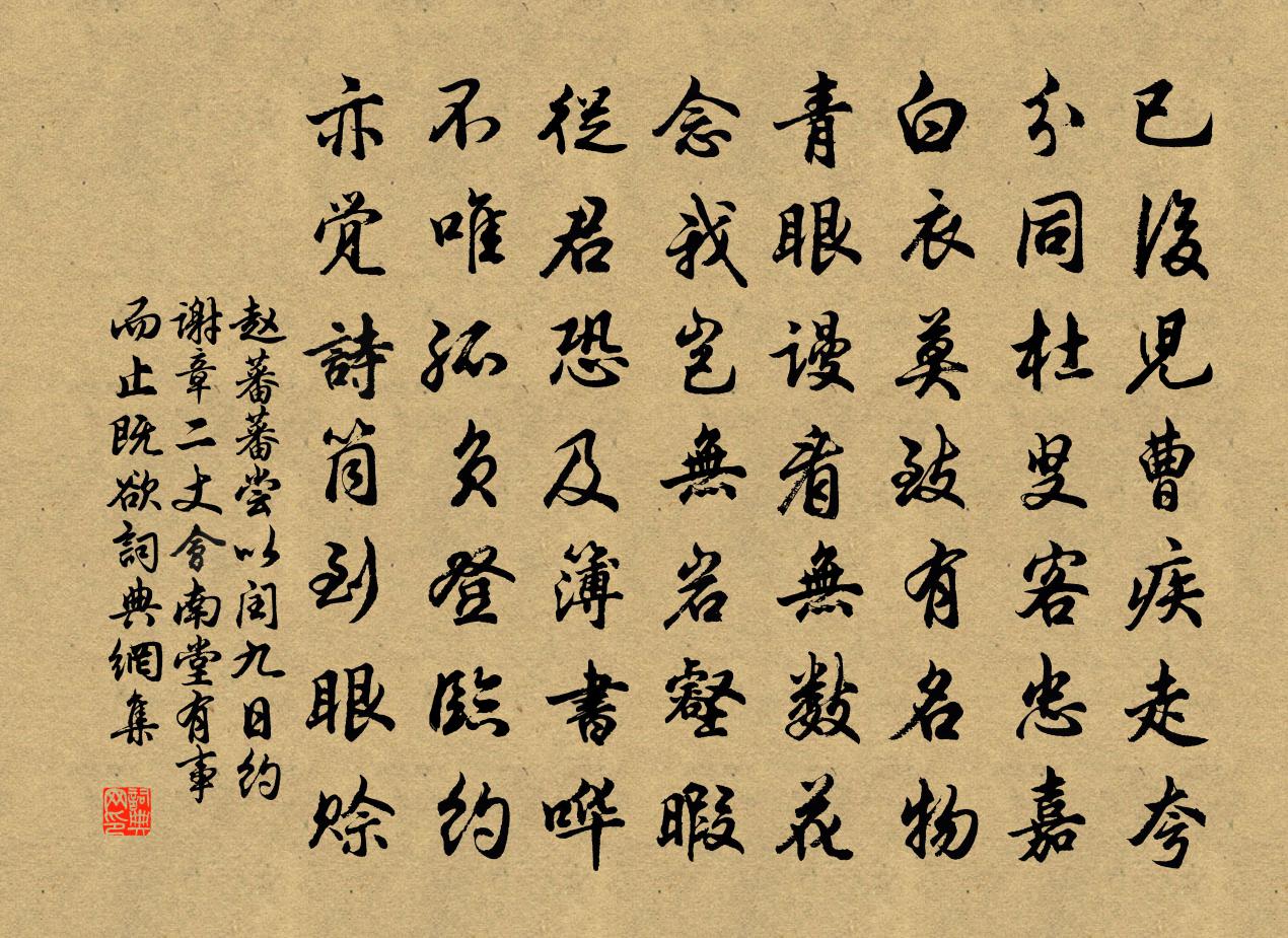詩詞名句歷史字典書法欣賞書法字典國語詞典說文解字康熙字典古漢語字典標 題 作 者 詩 句 蕃嘗以閏九日約謝章二丈會南堂有事而止既欲作者:趙蕃 朝代:宋代原文已後兒曹疾走夸,分同杜叟客忠嘉。白衣莫致有名物,青眼謾看無數花。念我豈無岩壑暇,從君恐及簿書嘩。不唯孤負登臨約,亦覺詩筒到眼賒。詩詞問答問:《蕃嘗以閏九日約謝章二丈會南堂有事而止既欲》的作者是誰?答:趙蕃問:該詩寫於哪個朝代?答:宋代書法欣賞蕃嘗以閏九日約謝章二丈會南堂有事而止既欲書法作品詩文賞析【原題】:蕃嘗以閏九日約謝章二丈會南堂有事而止既欲復理前約乏酒未能因見唱酬嘉字韻詩卷借韻呈章丈詩詞推薦跋汪省乾詩卷二首楊萬里〔宋代〕向來劉翰有詩聲,近日汪經更得名。月在梅花冰在月,與君句子各爭清。滿江紅(清明前三日登清暉作)管鑒〔宋代〕十日狂風,都斷送、杏花紅去。卻是有、海棠枝上,一分春住。桃葉桃根渾未覺,櫻桃楊柳成輕負。強尊前、抖擻宴坐之地籧篨覆之名曰蓬齋陳與義〔宋代〕不須杯勺了三冬,旋作蓬齋待朔風。會有打窗風雪夜,地爐孤坐策奇功。故里羅公升〔宋代〕生長太平日,不識悲歡殊。今晨入故里,萬感忽啟予。人去鳥鼠樂,草長牛羊肥。土花幸無恙,猶作頹垣娛。平生希年初度老友王希宣扁舟遠訪夙誼甚厚貺以十牟巘五〔宋代〕古人歌既醉,其中有五福。如何憔悴者,忍飲但餐菊。點絳唇 病中偶成許有壬〔元代〕酒病詩愁,好春三月常孤負。開門春暮。新綠迷雲樹。一片飛花,綰住遊絲舞。東風妒。等閒吹去。散亂隨紅雨。橫吹曲辭。關山月翁綬〔唐代〕裴回漢月滿邊州,照盡天涯到隴頭。影轉銀河寰海靜,光分玉塞古今愁。笳吹遠戍孤烽滅,雁下平沙萬里秋。況是句張順之〔宋代〕瞻鵲數聲清夢斷,出門一笑遇詩仙。二月十五日趙君實南山別墅俟主客俱不至方回〔宋代〕籬落梅殘野菜青,田間閒看鶴梳翎。主人不到客且去,細雨南山暗畫屏。送魏州李相公王建〔唐代〕百代功勳一日成,三年五度換雙旌。閒來不對人論戰,難處長先自請行。旗下可聞誅敗將,陣頭多是用降兵。當朝題梅仙館孟賓於〔唐代〕仙界路遙雲縹緲,古壇風冷葉蕭騷。後來豈合言淹滯,一尉升騰道最高。江城子(再送盧倅)葉夢得〔宋代〕芙蓉開過雨初晴。曲池平。畫橋橫。耿耿銀河,遙下蘸空明。一舸吳松歸未得,聊共住,小蓬瀛。問君何事引前旌賀新郎(已未九日同季弟子侄飲倉部弟免庵,艮翁、宮教來會。)劉克莊〔宋代〕憶昔俱年少。向斯晨、登高懷古,賦詩舒嘯。追數樽前插花客,人物並皆佳妙。禁幾度、西風殘照。元子寄奴曾富宴胡楚真禁所陳子昂〔唐代〕人生固有命。天道信無言。青繩一相點。白璧遂成冤。請室閒逾邃。幽庭春未暄。寄謝( 一作語 )韓安國。何臨江仙歐陽辟〔宋代〕澗碧山紅粉爛漫,煙蘿遠映霜楓。倚闌人在暮雲東。遙天垂眾壑,平地起孤峰。大好家山重九日,尊前切莫匆匆。詠新竹際智〔清代〕此君志欲擎天碧,聳出雲頭高百尺。只恐年深化作龍,一朝飛去不留跡。邈書寄出與李知哲唱和詩次韻朱槔〔宋代〕邂逅招提頓客輈,十年塵土且休休。三人月下從渠便,二老風流到我不。南北只今無好語,山川如許更悲秋。故應遇仙亭王哲〔元代〕急急回頭。得得因由。物物更不追求。見見分明把個,般般打破優遊。淨淨自然瑩徹,清清至是真修。妙妙中間通大滌洞天留題趙與時〔宋代〕懸知凡骨本難仙,誰遣來登大條天。篝火既容闚洞穴,撫欄又得聽岩泉。頌二首釋慧南〔宋代〕生緣斷處伸驢腳,驢腳伸時佛手開。為報五湖參學者,三關一一透將來。名句推薦眇能視,不足以有明也。跛能履,不足以與行也。佚名《易傳·象傳上·履》 田園寥落干戈後,骨肉流離道路中。白居易《望月有感》 殷勤花下同攜手。更盡杯中酒。美人不用斂蛾眉。葉夢得《虞美人·雨後同乾譽才卿置酒來禽花下作》 夫惡有同方取不取同而已者乎?墨子《墨子·01章 親士》 梨花院落溶溶月,柳絮池塘淡淡風。晏殊《無題·油壁香車不再逢》 躞蹀御溝上,溝水東西流卓文君《白頭吟》 烏絲闌紙嬌紅篆,歷歷春星。納蘭性德《紅窗月·燕歸花謝》 長他人志氣,滅自己威風。張南莊《何典·第十回》 況是清明好天氣,不妨游衍莫忘歸。程顥《郊行即事》 不以智累心,不以私累己;寄治亂於法術,托是非於賞罰。韓非及後人《韓非子·大體》