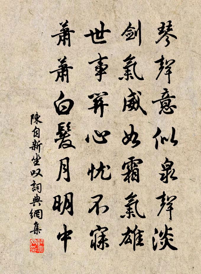 詩詞名句歷史字典書法欣賞書法字典國語詞典說文解字康熙字典古漢語字典標 題 作 者 詩 句 坐嘆作者:陳自新 朝代:宋代坐嘆原文琴聲意似泉聲淡,劍氣威如霜氣雄。世事關心憂不寐,蕭蕭白髮月明中。詩詞問答問:坐嘆的作者是誰?答:陳自新問:坐嘆寫於哪個朝代?答:宋代陳自新坐嘆書法欣賞坐嘆書法作品詩詞推薦挽林法曹實甫二首劉克莊〔宋代〕老學多推誼,諸公孰薦雄。卻行吾日暮,渴睡汝冬烘。宰木經春雨,園花逐曉風。寢門哀未盡,寓在薤歌中。再和孫應時〔宋代〕君詩音節中弦歌,報我英瑤百倍過。江村老人衣缽在,同參今有更人麽。中秋夕無月前兩夕皆明陳宓〔宋代〕四時丹桂年年好,萬歲青娥個個妍。但看世人生與老,不愁玉兔缺仍圓。攻侵屬國雪中節,巧趁鴟夷煙際船。我把雜詠趙蕃〔宋代〕婦有居冢亞,冢富亞則貧。貧知敬尊章,富不親補紉。尊章愛貧婦,富婦讒生鬭。讒巧偽若真,兩婦俱遭詬。貧婦初夏過湖外別業薛嵎〔宋代〕郊原新綠喜初晴,一曲湖光瀲灩明。幾處樓台空鎖鑰,百年人物盡丘塋。好花自分隨春去,惡木寧思擇地生。獨念春晚崔道融〔唐代〕三月寒食時,日色濃於酒。落盡牆頭花,鶯聲隔原柳。送盧次夔赴仲父校書之詔戴栩〔宋代〕離家向京國,客思獨從容。有句詩人讀,無書館吏供。蟄雷先一月,晴嶺沓千峰。馬上思親處,題緘寄所逢。踏莎行 和趙國興知錄韻辛棄疾〔宋代〕吾道悠悠,憂心悄悄,最無聊處秋光到。西風林外有啼鴉,斜陽山下多衰草。長憶商山,當年四老,塵埃也走鹹陽次韻徐惇濟久不食肉蘇簡〔宋代〕舉家食肉跡雖陳,端有寒儒繼後塵。杜老長鑱聊卒歲,顏生陋巷不逢辰。啖氈竊喜全高節,食肉從來鄙要津。捫腹此君軒蘇軾〔宋代〕雲幢煙節十洲人,犀甲檀槍百萬軍。翳薈叢生何足道,此君真是此君君。松關楊萬里〔宋代〕竹林行盡到松關,分付雙松為把門。若放俗人來一個,罰渠老瓦十分盆。題張山人幽居趙庚夫〔宋代〕昔隱君平卜,今聞事又非。肘猶懸蠹簡,身止掛鶉衣。芒屨沿山去,茅檐講易歸。先儒皆若此,切莫嘆時違。挽孫處士陳著〔宋代〕魁閥分根異,充然秀氣儲。少年古心貌,危世舊詩書。鵩怪來何早,熊祥夢竟虛。遙知蕙帳下,晝哭痛何如。秋霽曾紆〔宋代〕木落山明,暮江碧,樓倚太虛寥廓。素手飛觴,釵頭笑取,金英滿浮桑落。鬢雲慢約。酒紅拂破香腮薄。細細酌。絳守居園池歐陽修〔宋代〕嘗聞紹述絳守居,偶來覽登周四隅。異哉樊子怪可吁,心欲獨出無古初。窮荒搜幽入有無,一語詰曲百盤紆。孰雲憶君王·依依宮柳拂宮牆謝克家〔宋代〕依依宮柳拂宮牆,樓殿無人春晝長。燕子歸來依舊忙。憶君王,月破黃昏人斷腸。吐蕃別館送楊七錄事先歸呂溫〔唐代〕愁雲重拂地,飛雪亂遙程。莫慮前山暗,歸人正眼明。贈談命江文魁翁溪園〔宋代〕四十頭顱昨自知,行年懶問鬥牛箕。才如昭緯甘居下,命若夏侯徒抵疑。蟠屈尚懷雲雨志,堅剛猶勵雪霜姿。階前平安文天祥〔宋代〕平原太守顏真卿,長安天子不知名。一朝漁陽動鼙鼓,大河以北無堅城。公家兄弟奮戈起,一十七郡連夏盟。賊聞送南少府歸壽春韓翃〔唐代〕人言壽春遠,此去先秋到。孤客小翼舟,諸生高翅帽。淮風生竹簟,楚雨移茶灶。若在八公山,題詩一相報。名句推薦被酒莫驚春睡重,賭書消得潑茶香,當時只道是尋常。納蘭性德《浣溪沙·誰念西風獨自涼》 春江潮水連海平,海上明月共潮生。張若虛《春江花月夜》 空對著,山中高士晶瑩雪曹雪芹《終身誤》 沾衣欲濕杏花雨,吹面不寒楊柳風。志南《絕句》 應酬都不暇,一嶺是梅花。張道洽《嶺梅》 又是羊車過也,月明花落黃昏黃升《清平樂·宮怨》 昔聞洞庭水,今上岳陽樓杜甫《登岳陽樓》 得饒人處且饒人。曹雪芹《紅樓夢·第五十九回》 古台搖落後,秋日望鄉心。劉長卿《秋日登吳公台上寺遠眺》 獨自淒涼還自遣,自製離愁。龔自珍《浪淘沙·寫夢》