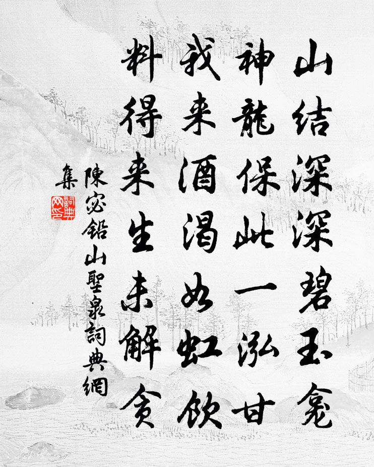 詩詞名句歷史字典書法欣賞書法字典國語詞典說文解字康熙字典古漢語字典標 題 作 者 詩 句 鉛山聖泉作者:陳宓 朝代:宋代鉛山聖泉原文山結深深碧玉龕,神龍保此一泓甘。我來酒渴如虹飲,料得來生未解貪。詩詞問答問:鉛山聖泉的作者是誰?答:陳宓問:鉛山聖泉寫於哪個朝代?答:宋代陳宓鉛山聖泉書法欣賞鉛山聖泉書法作品詩詞推薦簡中朝貴人王志道〔宋代〕場屋辛勤偵未償,又隨宦轍到河陽。米無五斗腰徒折,醋有三升鼻慣嘗。屢典朝衣賙過客,時沽坊酒滌愁腸。此心秋思陸游〔宋代〕眼明尚見蠅頭字,暑退初親雁足燈。歷歷胸中千載事,莫將輕比住庵僧。酒中留上襄陽李相公(李逢吉也)韓愈〔唐代〕濁水污泥清路塵,還曾同制掌絲綸。眼穿長訝雙魚斷,耳熱何辭數爵頻。銀燭未銷窗送曙,金釵半醉座添春。知公梅花喜神譜大開一十四枝宋伯仁〔宋代〕西施無限愁,後人何必佼。只好笑呵呵,不損紅妝貌。諸人頗有和余百梅詩者各賦一首劉克莊〔宋代〕詩至中山不可加,直將幽澹掃穠華。寧依處士墳前竹,不愛都人擔上花。老子騷魂常住世,郎君吟筆又名家。遙知天街曉望許渾〔唐代〕明星低未央,蓮闕迥蒼蒼。疊鼓催殘月,疏鍾迎早霜。關防浮瑞氣,宮館耀神光。再拜為君壽,南山高且長。沙鷗齊己〔唐代〕暖傍漁船睡不驚,可憐孤潔似華亭。晚來灣浦沖平碧,晴過汀洲拂淺青。翡翠靜中修羽翼,鴛鴦閒處事儀形。何如浪淘沙·海底飛塵終有日白居易〔唐代〕海底飛塵終有日,山頭化石豈無時。誰道小郎拋小婦,船頭一去沒回期。南歌子(沈蕙乞詞)朱敦儒〔宋代〕住近沈香浦,門前蕙草春。鴛鴦飛下柘枝新。見弄青梅初著、翠羅裙。怕喚拈歌扇,嫌催上舞茵。幾時微步不生塵雙韻子張先〔宋代〕鳴鞘電過曉闈靜。斂龍旗風定。鳳樓遠出霏煙,聞笑語、中天迥。清光近。歡聲竟。鴛鴦集、仙花斗影。更聞度曲元日二首馮時行〔宋代〕日月新年節,乾坤舊觀還。郁蔥浮曉霧,紫翠動晴山。御氣籠宮闕,朝班雜佩環。遙知王會散,喜色粲天顏。題海鹽南館張祜〔唐代〕故人營此地,台館尚依依。黑夜山魈語,黃昏海燕歸。舊陰楊葉在,殘雨槿花稀。無復南亭賞,高檐紅燭輝。清平樂 九月回至隆興 隆興廳事壁間作六鶴圖劉敏中〔元代〕雲峰咫尺。竹靜芭蕉靜。鶴繞蒼苔行又立。不見高堂素壁。簿書*騎匆匆。暫時留住衰翁。一片歸心難畫,野亭繡題惠崇畫四首夏晁補之〔宋代〕老柳無嘉色,紅蕖羞脈脈,宛在水中洲,雙鵝羽蒼白,何須玩引頸,顛到寫經墨,惟應一臨流,當暑袗絺綌,將至廣州用過韻寄邁迨二子蘇軾〔宋代〕皇天遣出家,臨老乃學道。北歸為兒子,破戒堪一笑。披雲見天眼,回首失海潦。蠻唱與黎歌,餘音猶杳杳。大兒喜事陸游〔宋代〕武夷老子雪垂肩,喜事何曾減少年。鸚鵡螺深翻細浪,辟邪爐暖起微煙。幽花滴露沾紗帽,亂絮憑風撲畫船。虎豹八風從律蔣防〔唐代〕制律窺元化,因聲感八風。還從萬籟起,更與五音同。習習蘆灰上,泠泠玉管中。氣隨時物好,響徹霽天空。自得寄(一作與)周繇(一作為)憲求人參段成式〔唐代〕少賦令才猶強作,眾醫多識不能呼。九莖仙草真難得,五葉靈根許惠無。苦雨吟十首呈同官諸丈吳潛〔宋代〕正直三神列,慈悲一佛尊。須知真實念,是謂吉祥門。巨浸旋歸壑,頑雲漸散屯。更憑驅日馭,揮霍照乾坤。八聲甘州(為遁齊壽)黃機〔宋代〕問訊翁、底事到人間,人間足嬉遊。向文邊書意,詩邊著語,□滿南州。逸韻高情總似,野水盪孤舟。所未能忘者名句推薦夫子循循然善誘人孔子弟子《論語·子罕篇》 今我來思,雨雪霏霏。佚名《採薇》 燕子飛來窺畫棟,玉鉤垂下簾旌。歐陽修《臨江仙·柳外輕雷池上雨》 月華如練,長是人千里。范仲淹《御街行·秋日懷舊》 袨服華妝著處逢,六街燈火鬧兒童。元好問《京都元夕》 來相召、香車寶馬,謝他酒朋詩侶。李清照《永遇樂·落日熔金》 醉折殘梅一兩枝,不妨桃李自逢時。陸游《落梅》 後庭花一曲,幽怨不堪聽。劉禹錫《金陵懷古》 海記憶體知己,天涯若比鄰。王勃《送杜少府之任蜀州 / 送杜少府之任蜀川》 雨打梨花深閉門,忘了青春,誤了青春。唐寅《一剪梅·雨打梨花深閉門》