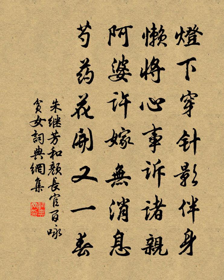 詩詞名句歷史字典書法欣賞書法字典國語詞典說文解字康熙字典古漢語字典標 題 作 者 詩 句 和顏長官百詠貧女作者:朱繼芳 朝代:宋代和顏長官百詠貧女原文燈下穿針影伴身,懶將心事訴諸親。阿婆許嫁無訊息,芍藥花開又一春。詩詞問答問:和顏長官百詠貧女的作者是誰?答:朱繼芳問:和顏長官百詠貧女寫於哪個朝代?答:宋代朱繼芳和顏長官百詠貧女書法欣賞和顏長官百詠貧女書法作品詩詞推薦官俸初罷親故見憂以詩諭之白居易〔唐代〕七年為少傅,品高俸不薄。乘軒已多慚,況是一病鶴。又及懸車歲,筋力轉衰弱。豈以貧是憂,尚為名所縛。今春換骨骰 嘆脫禍不改過王哲〔元代〕昨遇飢年,為甚累增勸教。怎奈向、人人忒*。越貪心,生狠妒,百端奸巧。計較。騁風流賣俏,也兀底。忽爾臨至荊公墓周文璞〔宋代〕野老從余話,文公在半山。蹇驢追不及,落日寺深關。寄題六安縣徐介夫園亭金君卿〔宋代〕峨峨武步對精廬,漱玉寒泉灌石渠。醅腳滿篘先臘釀,茗叢棲塢及春鋤。清風儔侶簾前竹,黃卷生涯加上書。養志泉上胡宏〔宋代〕晨起步林丘,路經泉上頭。天邊日色下,水底浪花浮。沙淨蒲芽綠,風牽荇帶流。澄瀾立白鷺,細浪逐輕鷗。翠鳥二十四詩品司空圖〔唐代〕絕佇靈素,少□清真。如覓水影,如寫陽春。風雲變態,花草精神;海之波瀾,山之嶙峋;俱似大道,妙契同塵。會稽楊梅雄天下其佳者皆出項里相傳項羽鄉里王銍〔宋代〕越山楊梅最珍美,人傑地靈生項里。江東廟食憶至今,應緣似舜重瞳子。南方炎威無時窮,落在故鄉草木中。請看憶太夫人文天祥〔宋代〕三生命孤苦,萬里路酸辛。屢險不一險,無身復有身。不忘聖天子,幾負太夫人。定省今何處,新來夢寐頻。松江陳必復〔宋代〕嗟我賦歸役,憐君尚滯留。江風借行色,山月伴離愁。天地日以肅,星辰夜欲浮。東籬菊花約,莫易負清秋。從辟滬南道中曉征三首李新〔宋代〕人情世事今如此,與作叢林眼目看。髀肉未能鎖犢鼻,溪篁先與斸漁竿。山銜落月金盤缺,馬踏清霜玉佩寒。一十思山居一十首題寄商山石李德裕〔唐代〕綺皓岩中石,嘗經伴隱淪。紫芝呈幾曲,紅蘚閟千春。聊用支琴尾,寧惟倚病身。自知來處所,何暇問嚴遵。追送友人李季允歸蜀三首並寄所懷周南〔宋代〕獨往知心在,晨風憶纜開。江濤寬屢涉,山鬼訊重來。甲子悲麟去,林廬有雁回。贈言吾豈敢,遺藥可無猜。驚雷聚雨陽枋〔宋代〕槎星爛照玉堂明,樓雪晴融白帝城。鷗狎不知菱盪轉,漫隨瀼水泛春聲。歲晚陸游〔宋代〕雲暗郊原雪意稠,天公似欲富來麰。布衾歲久真如鐵,詎取私懷一己憂。朝中措張掄〔宋代〕燈花挑盡夜將闌。斜掩小屏山。一點涼蟾窺慢,釧敲玉臂生寒。起來無緒,爐薰燼冷,桐葉聲乾。都把沈思幽恨,正月十九日四更起讀朱文公年譜至天大明賦十方回〔宋代〕獨能有眼識延平,濂洛淵源集大成。早負性資專問學,後生豈可少先生。魯仲連義不帝秦佚名〔先秦〕秦圍趙之邯鄲。魏安釐王使將軍晉鄙救趙,畏秦,止於盪陰不進。 魏王使客將軍辛垣衍間入邯鄲,因平原君暑中楊伯虎見訪翌日有詩來因走筆次韻張鎡〔宋代〕領取無多話,頻年頓不疎。幽尋塵土外,高韻笑談余。既悟蕉中鹿,寧求木上魚。論詩能避暑,此意復誰如。山水吟華岳〔宋代〕閩之山峨峨,可以接穹蒼。閩士孕其秀,胸次尤難量。閩之水滔滔,可以燭妍醜。閩士生其間,其美不容。君不見湖州歌九十八首 其八十七汪元量〔宋代〕三殿加餐強自寬,內家日日問平安。大元皇后來相探,特賜絲紬二百單。名句推薦晝成淒黯,雁飛過、垂楊轉青。吳文英《慶 * ·秋感》 相逢清露下,流影濕衣襟。袁枚《夜過借園見主人坐月下吹笛》 五嶽尋仙不辭遠,一生好入名山游。李白《廬山謠寄盧侍御虛舟》 近者不親,無務求遠墨子《墨子·02章 修身》 籬落疏疏一徑深,樹頭花落未成陰。楊萬里《宿新市徐公店》 江帆幾片疾如箭,山泉千尺飛如電周德清《塞鴻秋·潯陽即景》 一日不見,如三月兮。佚名《子衿》 黃花深巷,紅葉低窗,淒涼一片秋聲。蔣捷《聲聲慢·秋聲》 君子以見善則遷,有過則改。佚名《易傳·象傳下·益》 己有能,勿自私。人所能,勿輕訾。李毓秀《弟子規·泛愛眾》