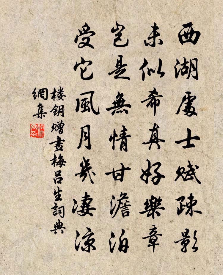 詩詞名句歷史字典書法欣賞書法字典國語詞典說文解字康熙字典古漢語字典標 題 作 者 詩 句 贈畫梅呂生作者:樓鑰 朝代:宋代贈畫梅呂生原文西湖處士賦疎影,未似希真好樂章。豈是無情甘澹泊,受它風月幾淒涼。詩詞問答問:贈畫梅呂生的作者是誰?答:樓鑰問:贈畫梅呂生寫於哪個朝代?答:宋代樓鑰贈畫梅呂生書法欣賞贈畫梅呂生書法作品詩詞推薦奉和趙王遊仙詩庾信〔南北朝〕藏山還採藥。有道得從師。京兆陳安世。成都李意期。玉京傳相鶴。太乙授飛龜。白石香新芋。青泥美熟芝。山精五言四十字奉寄四明禮師道人釋尚能〔宋代〕昔年慚不識,今日羨仍頻。造疏傳他域,談空聚遠人。龕燈孤敵暗,庭柏瘦無春。漸老思山甚,相逢會有因。入黃溪聞猿(溪在永州)柳宗元〔唐代〕溪路千里曲,哀猿何處鳴。孤臣淚已盡,虛作斷腸聲。以李約交遊晚歲重為韻作五絕句別韓二十七晁說之〔宋代〕紅塵歲月晚,白社煙霞交。相思得相間,作底不逍遙。哥舒翰引諺佚名〔唐代〕狐向窟嗥不祥。阮郎歸邵亨貞〔元代〕茂陵多病不勝秋。多情還倚樓。隔江何處泊離舟。有人歌遠遊。清興在,此生浮。老來長是愁。西風吹夢白萍洲。下泉佚名〔先秦〕冽彼下泉,浸彼苞稂。愾我寤嘆,念彼周京。冽彼下泉,浸彼苞蕭。愾我寤嘆,念彼京周。冽彼下泉,浸彼苞蓍。奉和魯望漁具十五詠藥魚皮日休〔唐代〕吾無竭澤心,何用藥魚藥。見說放溪上,點點波光惡。食時競夷猶,死者爭紛泊。何必重傷魚,毒涇猶可作。京口懷古二首釋仲殊〔宋代〕北顧橫江盡,東南第一州。六朝都在望,回首倦登樓。賞梅李龍高〔宋代〕我愛溪橋半樹開,幾回覓句當銜杯。江南不欠花如雪,自是遊人不看來。柬呂太學禎邵知柔〔宋代〕當時欲殺尚憐才,奏稿流傳讀轉哀。一寸丹心朝士愕,十分頭白道州回。汴京今日猶豺虎,陵寢多年沒草萊。聖主村景四首陳著〔宋代〕南陌耕雲脈脈,東風吹雨斜斜。流水滿村春事,炊煙隔岸人家。雜詠一百首寧王劉克莊〔宋代〕智出建成上,賢於子糾多。至今稱讓帝,當日喚寧哥。滿江紅 次韻答暢泊然劉敏中〔元代〕滿紙龍鸞,渾厭倒、來禽青李。黃絹好、朝吟暮玩,愛之無已。玉刻來從千載上,寶珠出自重淵底。每相逢慰淡相石鼓歌蘇軾〔宋代〕冬十二月歲辛丑,我初從政見魯叟。舊聞石鼓今見之,文字鬱律蛟蛇走。細觀初以指畫肚,欲讀嗟如鉗在口。韓公菩薩蠻(十一之五)賀鑄〔宋代〕綠楊眠後拕煙穗。日長掃盡青苔地。香斷入簾風。爐心檀燼紅。蘭溪修祓禊。上巳明朝是。不許放春慵。景陽臨曉頌古二十一首釋心月〔宋代〕聖量凡情淨盡時,轉身無路事還非。屋檐下過粟畲里,馬腹驢胎一道歸。讀史七首於石〔宋代〕莫言世事只如棋,千載是非人共知。吾道廢興時否泰,人才進退國安危。詩書未火秦猶在,黨錮無鉤漢亦衰。覆轍仲晦監簿和放翁七十三吟三篇華予初度走筆□劉克莊〔宋代〕□□下飾墨尤新,以史名官不治民。後死漫為諸老殿,粗完深愧兩翁貧。譬牛山木全高壽,讓馬塍花斗早春。兀坐長持經僧貫休〔唐代〕嘮嘮長夜坐,嘮嘮早起。杉森森,不見長,人聲續續如流水。摐金掙玉,吐宮咽徵。頭低草木,手合神鬼。日消三名句推薦長相思,長相思。晏幾道《長相思·長相思》 父母在,不遠遊,遊必有方。孔子弟子《論語·里仁篇》 春水迷天,桃花浪、幾番風惡。張元乾《滿江紅·自豫章阻風吳城山作》 勝概日相與,思君心鬱陶。岑參《鞏北秋興寄崔明允》 欲渡黃河冰塞川,將登太行雪滿山。李白《行路難·其一》 冰炭不同器而久,寒暑不兼時而至韓非及後人《韓非子·顯學》 苕之華,其葉青青。佚名《苕之華》 德者事業之基,未有基不固而棟宇堅久者洪應明《菜根譚·概論》 梨花最晚又凋零,何事歸期無定準。歐陽修《玉樓春·去時梅萼初凝粉》 樓上黃昏欲望休,玉梯橫絕月中鉤李商隱《代贈二首》