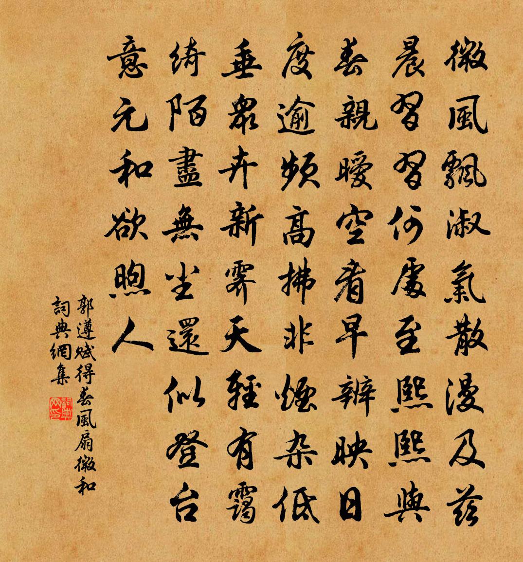 詩詞名句歷史字典書法欣賞書法字典國語詞典說文解字康熙字典古漢語字典標 題 作 者 詩 句 賦得春風扇微和作者:郭遵 朝代:唐代賦得春風扇微和原文微風飄淑氣,散漫及茲晨。習習何處至,熙熙與春親。曖空看早辨,映日度逾頻。高拂非煙雜,低垂眾卉新。霽天輕有靄,綺陌盡無塵。還似登台意,元和欲煦人。詩詞問答問:賦得春風扇微和的作者是誰?答:郭遵問:賦得春風扇微和寫於哪個朝代?答:唐代問:賦得春風扇微和是什麼體裁?答:五排郭遵賦得春風扇微和書法欣賞賦得春風扇微和書法作品注釋全唐詩:卷347-12詩詞推薦潄玉館留怡然〔宋代〕拳石漱芳玉,夢回堪洗耳。客至館於斯,妙處從此始。詠竹雪張玉孃〔宋代〕凍雪霏霏隨九阜,竹枝垂地翠旋鎖。玉龍戰退飛鱗甲,青鳳翻成白羽毛。歲晚餘寒知勁節,夢回佳興訝清剽。隔雲后土廟瓊花詩王禹偁〔宋代〕誰移琪樹下仙鄉,二月輕冰八月霜。若使壽陽公主在,自當羞見落梅妝。晚春陸游〔宋代〕世事紛紛不足論,流年去似海濤翻。莫因齒髮悲殘景,且喜柴荊是故園。千里桑麻無曠土,數家雞犬自成村。鄰翁竹任希夷〔宋代〕數十琅玕足辟塵,何須千畝比封君。一從清士心相許,眼看浮花薄似雲。和張憲吳園山居二首彭龜年〔宋代〕參天喬木鎮山川,栽種成陰知幾年。仰止名園今老矣,卷舒畫軸思悠然。白田馬上聞鶯李白〔唐代〕黃鸝啄紫椹,五月鳴桑枝。我行不記日,誤作陽春時。蠶老客未歸,白田已繅絲。驅馬又前去,捫心空自悲。再送蔣穎叔帥熙河二首蘇軾〔宋代〕使君九萬擊鵬鯤,肯為陽關一斷魂。不用寬心九千里,安西都護國西門。餘刃西屠橫海鯤,應予詩讖是遊魂。歸來渡淮孔武仲〔宋代〕扁舟次淮浦,利涉得春風。脫險黿鼉畔,問津桑枯中。俯窺清奪魄,回望渺吞空。委注雖天力,經論是禹功。縈紆蝶戀花·越女採蓮秋水畔歐陽修〔宋代〕越女採蓮秋水畔。窄袖輕羅,暗露雙金釧。照影摘花花似面。芳心只共絲爭亂。鸂鶒灘頭風浪晚。霧重煙輕,不見吾里前輩林刪定甫六十掛冠夾漈艾軒諸老皆為劉克莊〔宋代〕□定飛仙去不留,惜餘生晚欠從游。種明逸後屈二指,范景仁邊放一頭。有鹿門棲堪遁去,無菟裘計徑歸休。卻憐山中方岳〔宋代〕溪村楊柳好藏鴉,春水池塘已吠蛙。詩外共誰千里月,雨中老卻一山花。蝶將夢去客欹枕,燕寄聲來社到家。數掩用韻呈明叔趙蕃〔宋代〕白鷗自倚占深灣,亦有幽人此照顏。豈但襟斯非世俗,要知吟嘯奪天慳。江天見處從教闊,松竹栽成不要刪。我若題烏程簿廳浮玉亭七首袁說友〔宋代〕一日溪流萬櫓聲,簿書叢里眼偏明。青衫不怕籠朱墨,直下滄浪便濯纓。和大參相公劉過〔宋代〕松深煙鎖逕,月冷水明樓。日漲滄溟窄,山陰古木秋。琴書超物表,氣宇識神遊。突兀東南壯,乾坤第一流。潘吳二察甚振風采劉仲山有詩因次其韻姚勉〔宋代〕國家元氣幾如發,章李以來幾台察。翻盆窺瓮若不聞,射影含沙但潛發。坦途自詫忘羊腸,堅冰恐已在履霜。熙豐送俞太中山人歸終南魏野〔宋代〕俞貫之辭魏仲先,終南歸去落花天。如何相見還相別,早晚溪雲一處眠。僧房陳必復〔宋代〕結廬修竹里,身外世緣輕。滑幾淨如拭,小窗低更明。夜深留佛火,人靜聽鐘聲。共撥爐灰坐,跏趺對短檠。奉和御製讀三國志詩夏竦〔宋代〕白馬當塗兆,黃家得歲興。金符威既重,玉版事堪憑。漢火承前運,誰龍合舊徵。青雲開後葉,下武倍兢兢。江提倉生日二首李新〔宋代〕青鎖沈煙暝著沙,鞭蕖雲帳曉吞霞。南金人物無雙士,宮錦文章自一家。賞過十分銀漢月,采歸千歲海桃花。蜀仙名句推薦舟非水不行,水入舟則沒佚名《孔子家語·六本》 鳳尾森森,龍吟細細。曹雪芹《紅樓夢·第二十六回》 細雨濕衣看不見,閒花落地聽無聲。劉長卿《別嚴士元》 其水,用山水上,江水中,井水下。陸羽《茶經·五之煮》 參差連曲陌,迢遞送斜暉。李商隱《落花》 新啼痕壓舊啼痕,斷腸人憶斷腸人。王實甫《十二月過堯民歌·別情》 捐軀赴國難,視死忽如歸!曹植《白馬篇》 更可惜,雪中高樹,香篝熏素被。周邦彥《花犯·小石梅花》 三五明月滿,四五蟾兔缺。佚名《孟冬寒氣至》 冰雪林中著此身,不同桃李混芳塵;王冕《白梅》