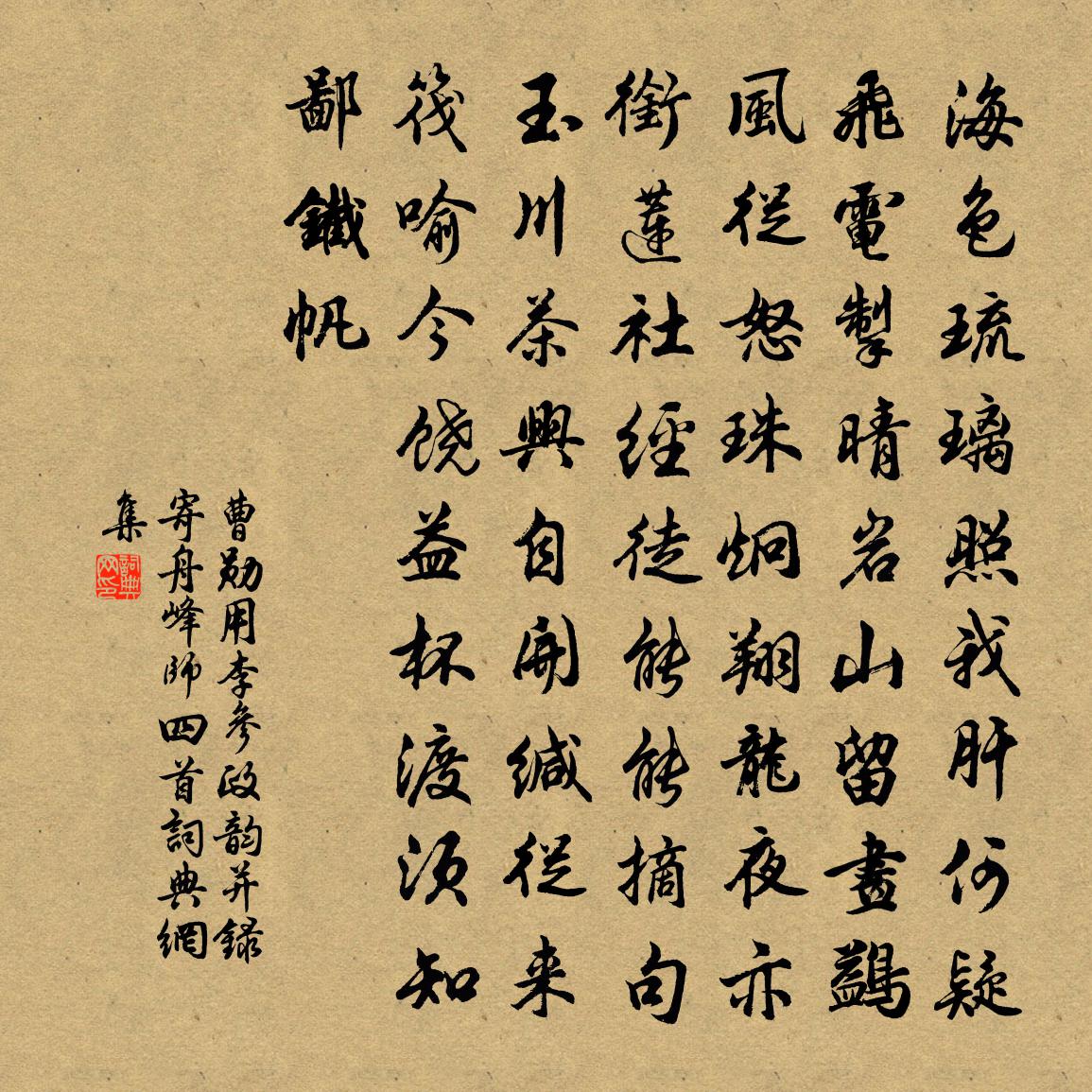 詩詞名句歷史字典書法欣賞書法字典國語詞典說文解字康熙字典古漢語字典標 題 作 者 詩 句 用李參政韻並錄寄舟峰師四首作者:曹勛 朝代:宋代原文海色琉璃照我肝,何疑飛電掣晴岩。山留畫鷁風從怒,珠炯翔龍夜亦銜。蓮社經徒能能摘句,玉川茶興自開緘。從來筏喻今饒益,杯渡須知鄙鐵帆。詩詞問答問:《用李參政韻並錄寄舟峰師四首》的作者是誰?答:曹勛問:該詩寫於哪個朝代?答:宋代書法欣賞用李參政韻並錄寄舟峰師四首書法作品詩詞推薦喜姚郎中自杭州回賈島〔唐代〕路多楓樹林,累日泊清陰。來去泛流水,翛然適此心。一披江上作,三起月中吟。東省期司諫,雲門悔不尋。喜遷鶯·晉師勝淝上李綱〔宋代〕長江千里。限南北、雪浪雲濤無際。天險難逾,人謀克壯,索虜豈能吞噬。阿堅百萬南牧,倏忽長驅吾地。破強敵題清閟堂雪蕉圖楊維楨〔元代〕洛陽城中雪冥冥,袁家竹屋如笄篁。老人僵臥木偶形,不知太守來扣扃。輞川畫得洛陽亭,千載好事圖方屏。寒林韓子華約遊園上馬後雨作遂歸梅堯臣〔宋代〕誰約玩春物,狂風雲驟開。擺叢多落蕊,蔽路足昏埃。逆水燕迎雨,將生鵝怕雷。嵇康今轉懶,騎馬半途回。游峨眉十一首馮時行〔宋代〕攙天元有路,絕俗更無村。孤眺臨崖觜,危升挽木根。渺茫均遠邇,倏忽變明昏。佛現驚搜句,岩前萬口喧。臘月十八日呈子京鄭俠〔宋代〕歲去如奔馬,殘日十有三。侄為當嫁女,甥是未婚男。叢然猥俗並,殊非力所堪。嗟予本支離,塵事素不能。東床禽演贈丁道人楊維楨〔元代〕令威仙人歸故林,白晝飛下天門深。一千年人忽作鶴,二十八宿皆為禽。俯頭垂翅聽驅使,走報禍福不敢諳。南方登紫微崖程珌〔宋代〕富池大信江千里,三日醉臥煙蓬底。曉來推蓬登斷岸,因憶牧之呼屐齒。九華隆隆閘天脊,微雲低度差參是。百喚夜坐戴叔倫〔唐代〕夜靜河漢高,獨坐庭前月。忽起故園思,動作經年別。依韻和賈直孺舍人初春祠左太乙二首王珪〔唐代〕太乙靈宮近帝都,夕迎丹節下層虛。方從宣室承釐後,更約浮丘把袂初。文藻自高鵷掖詔,姓名應冠蕊台書。我慚句熊知至〔宋代〕樓台上下火照火,車馬往來人看人。賀新郎李昴英〔宋代〕元日除書濕。到而今、西風老矣,駕軺初入。自是龍顏深注想,孤鳳翔而後集。久父老、攀留原隰。庾嶺經行梅亦從丘十四借韓文二首黃庭堅〔宋代〕中有先君手澤,丹鉛點勘書詩。莫惜借行千里,他日還君一鴟。送鄭公績赴試金陵朱翌〔宋代〕昨日天子詔,痛念屏州兒。儻有長轂動,何憂折箠笞。似聞當寧嘆,頗牧今何之。豈惟一方痛,其勢又類腓。策士曉望楊萬里〔宋代〕暑退誰當憶,秋生喜此逢。荒林失輕霧,寒日上危峰。忽有吟邊興,忘年鏡里容。不須無鮑謝,始得壇詩宗。邢君才舊宅三怪詩鐵銚〔唐代〕昔日炎炎徒自知,今無烽灶欲何為。可憐國柄全無用,曾見家人下第時。拾得指空笑贊釋智遇〔宋代〕木屐竹帚,粘腳綴手。古佛家風,泥豬疥狗。指天大笑一聲,驚得虛空倒走。沁園春 贈括蒼張希微號幾庵李道純〔元代〕不識不知,無聲無臭,名曰希微。只道個便是,全真妙本,人能透得,即刻知幾。聞法聞經,說禪說道,執象泥文居庸疊翠陳孚〔元代〕斷崖萬仞如削鐵,鳥飛不渡苔石裂。嵯岈枯木無碧柯,六月不陰飄急雪。塞沙茫茫出關道,駱駝夜吼黃雲老。征鴻賀表兄傅仁仲常後院生男王邁〔宋代〕昔君與我夜對床,知君著意選專房。為言東鄰有女寶,胡不貯之芸輝堂。君時為我一慫恿,以斗量金買嬌寵。小君名句推薦天馬徠,龍之媒,游閶闔,觀玉台。劉徹《天馬二首·其二》 故人南燕吏,籍籍名更香。岑參《至大梁卻寄匡城主人》 歡笑情如舊,蕭疏鬢已斑。韋應物《淮上喜會梁川故人 / 淮上喜會梁州故人》 益者三友,損者三友。友直、友諒、友多聞,益矣;友便辟、友善柔、友便佞,損矣。孔子弟子《論語·季氏篇》 保民而王,莫之能御也。孟子《孟子·梁惠王章句上·第七節》 江上小堂巢翡翠,花邊高冢臥麒麟。杜甫《曲江二首》 帝王之道,以寬仁為大。令狐德棻《周書·本紀·卷四》 今年元夜時,月與燈依舊。歐陽修《生查子·元夕》 冰簟銀床夢不成,碧天如水夜雲輕。溫庭筠《瑤瑟怨》 萬里橋西一草堂,百花潭水即滄浪。杜甫《狂夫》