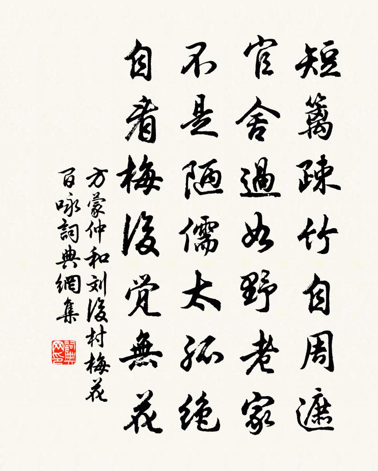 詩詞名句歷史字典書法欣賞書法字典國語詞典說文解字康熙字典古漢語字典標 題 作 者 詩 句 和劉後村梅花百詠作者:方蒙仲 朝代:宋代和劉後村梅花百詠原文短籬疎竹自周遮,官舍過如野老家。不是陋儒太孤絕,自看梅後覺無花。詩詞問答問:和劉後村梅花百詠的作者是誰?答:方蒙仲問:和劉後村梅花百詠寫於哪個朝代?答:宋代方蒙仲和劉後村梅花百詠書法欣賞和劉後村梅花百詠書法作品詩詞推薦酬所知張詠〔宋代〕皇風浩蕩吹天地,天下英髦連鳳起。海鵬一飛一萬里,三尺微風何足謂。思親歌朱元璋〔明代〕苑中高樹枝葉雲,上有慈烏乳雛勤。雛翎少乾呼教飛,騰翔啞啞朝與昏。有時力及隨飛去,有時不及枝記憶體。呼來句釋惠崇〔宋代〕河來天上闊,雲度月邊輕。巫山張子容〔唐代〕巫嶺岧嶢天際重,佳期宿昔願相從。朝雲暮雨連天暗,神女知來第幾峰。阮郎歸(詠春)趙長卿〔宋代〕和風暖日小層樓。人閒春事幽。杏花深處一聲鳩。花飛水自流。尋舊夢,續揚州。眉山相對愁。憶曾和淚送行舟。清明日欲宿石門,未到而風雨大作,泊靈星小楊萬里〔宋代〕波濤端不為君休,風雨何曾管客愁。自古詩人磨不倒,一樽大笑謝陽侯。景德中朝會十四佚名〔宋代〕金奏在庭,群後在位。天威煌煌,鄉明負扆。高拱穆穆,弁冕端委。盛德日新,禮容有燁。跨馬仇遠〔宋代〕跨馬入城去,驅雞上屋飛。閒官差可樂,徒步未為非。杜老平明出,山公倒載歸。晚汀沙水闊,野鶩得相依。再游南華有祖師衣缽曾豐〔宋代〕達磨將身帶履歸,殷勤分付缽和衣。更和衣缽將歸去,免與中原講是非。山中冬思二首鮑溶〔唐代〕山深先冬寒,敗葉與林齊。門巷非世路,何人念窮棲。哀風破山起,夕雪誤鳴雞。巢鳥侵旦出,飢猿無聲啼。晨興贈岩電道人王炎〔宋代〕胸次有藻鑒,聲行朝野間。我來勾踐國,君住少微山。青眼肯相顧,白頭今得閒。窮通無可問,歸去掩雲關。自歸山陳陶〔唐代〕海岳南歸遠,天門北望深。暫為青瑣客,難換白雲心。富貴老閒事,猿猱思舊林。清平無樂志,尊酒有瑤琴。水龍吟劉克莊〔宋代〕當年玉立清揚,屋樑落月偏相照。而今衰颯,形骸百醜,情懷十拗。久已飾巾,尚堪扶杖,聽山東詔。盡後車載汝次太白水西韻陳柄〔宋代〕涇巘翠插天,涇溪清繞郭。巒環松竹里,崖磴自樓閣。是時秋陽驕,三日此棲泊。曉色林端來,晴雲岩際落。飛梯酬別令狐補闕李商隱〔唐代〕惜別夏仍半,回途秋已期。那修直諫草,更賦贈行詩。錦段知無報,青萍肯見疑。人生有通塞,公等系安危。警露宿採石黃庶〔宋代〕秋風宿兼葭,花落岩霜雪。江山古興廢,荊棘壘出沒。水收鳧雁聲,夜靜寒籟發。漁舟自來去,笑語載明月。詩形苦雨吟十首呈同官諸丈吳潛〔宋代〕海鄉多下田,潢潦易 * 。雲腳晚希露,天心朝望穿。壤蚯方惡出,穴蟻又憂遷。翻覆陰晴證,愁腸日幾旋。撥棹子佚名〔宋代〕煙姿媚,冰容薄。芳蕖嫩、隱映新萍池閣。擷英人去後,清香微綻,透真珠簾幕。似無語含情垂彩佩,戲芳陰,漸西江月王哲〔元代〕於已搜尋臧善,慮思絕泯為先。減財節色保丹田。對景須行方便。老幼自然有祿,且休苦苦孜煎。放開一朵白花蓮挽真西山二首曾極〔宋代〕一片誠心並若丹,愛民何止十分寬。不成中國相司馬,空使蒼生望謝安。廣益集思今已晚,以明佐聖古來難。治平名句推薦龜言此地之寒,鶴訝今年之雪。庾信《小園賦》 不怕風狂雨驟,恰才稱,煮酒箋花。李清照《轉調滿庭芳·芳草池塘》 吾於天下,無去也,無就也,惟道之從。王通《中說·卷二·天地篇》 獨行獨坐,獨唱獨酬還獨臥。朱淑真《減字木蘭花·春怨》 不知庭霰今朝落,疑是林花昨夜開。宋之問《苑中遇雪應制》 柘彈何人發,黃鸝隔故宮。溫庭筠《清明日》 徒善不足以為政,徒法不能以自行。孟子《孟子·離婁章句上·第一節》 漢月垂鄉淚,胡沙費馬蹄。岑參《磧西頭送李判官入京》 故人離別盡,淇上轉驂騑。王維《送魏郡李太守赴任》 得天下英才而教育之。孟子《孟子·盡心章句上·第二十節》