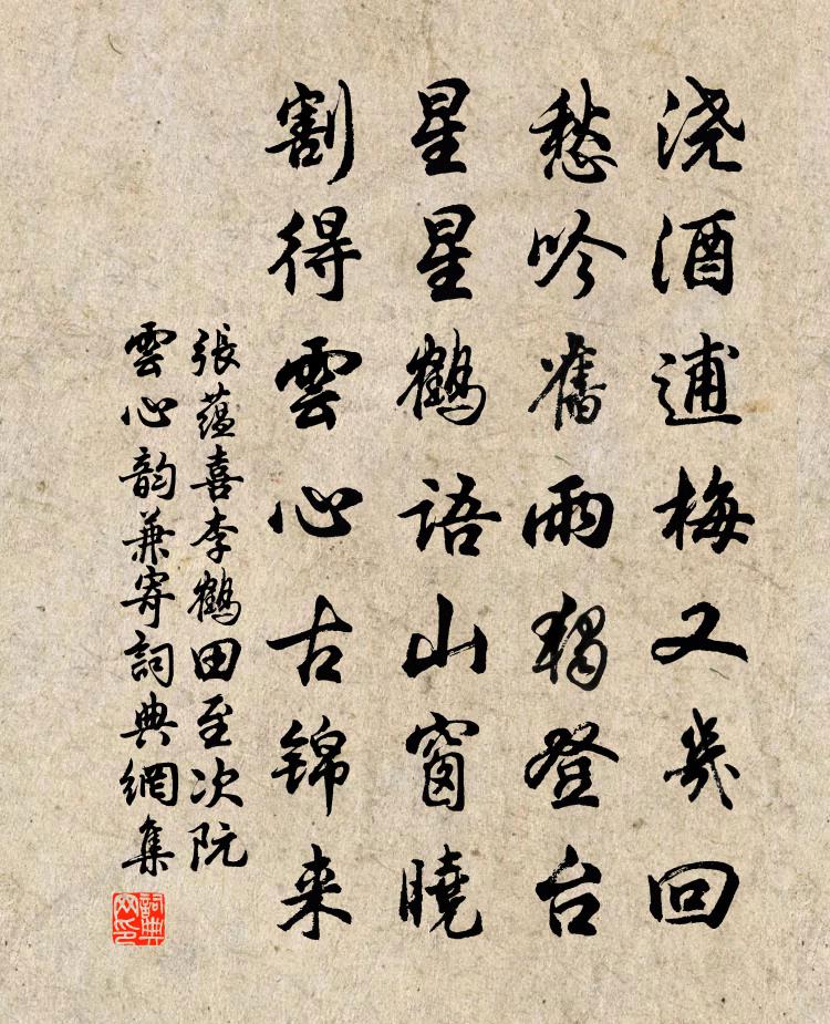 詩詞名句歷史字典書法欣賞書法字典國語詞典說文解字康熙字典古漢語字典標 題 作 者 詩 句 喜李鶴田至次阮雲心韻兼寄作者:張蘊 朝代:宋代喜李鶴田至次阮雲心韻兼寄原文澆酒逋梅又幾回,愁吟舊雨獨登台。星星鶴語山窗曉,割得雲心古錦來。詩詞問答問:喜李鶴田至次阮雲心韻兼寄的作者是誰?答:張蘊問:喜李鶴田至次阮雲心韻兼寄寫於哪個朝代?答:宋代張蘊喜李鶴田至次阮雲心韻兼寄書法欣賞喜李鶴田至次阮雲心韻兼寄書法作品詩詞推薦陳蕃徐鈞〔宋代〕身居一室尚凝塵,天下如何掃得清。須信修齊可平治,絕憐志大竟無成。雜興陸游〔宋代〕靈府寧容一物侵?此身只合老山林。何由挽得銀河水,淨洗群生忿欲心?題曹娥廟趙嘏〔唐代〕青娥埋沒此江濱,江樹颼溜慘暮雲。文字在碑碑已墮,波濤辜負色絲文。李總乾遺詩十四句師於一句之下加頌七句釋印肅〔宋代〕殿堂何所有,夢幻非堅久。竹木從何來,個個人空手。石人解采畫,木女添燈油。此事誰得知,真實泥牛吼。清心鏡 贈王庵主馬鈺〔元代〕養家時,甚情況。被妻男逼得,有如心恙。競利名、來往奔波,忒勞嚷勞踉。學道來,常坦蕩。除性命二字,別無題曾幼度詩集後二首趙蕃〔宋代〕客路東西曾數州,詩成寧免暗中投。我今辦取逢人說,傾蓋懸知勝白頭。雜興張鎡〔宋代〕子云閉門學,非願雕蟲稱。於道實有省,爵位豈所營。洙泗嗟已遠,惜不偕群英。太玄法言書,莫誚徒擬經。壽張京尹十首彭龜年〔宋代〕四百山河朝帝京,紫岩有志未全伸。知公久抱中原略,日日搜羅度外人。玉漏遲 七夕行台諸公見餞 讀畫齋叢書本滕賓〔元代〕問誰爭乞巧。誰知巧處成煩惱。天上佳期,底事別多歡少。雨夢雲情半餉,又早被西風吹曉。愁未了。星橋隔斷,望江南二首(賀毛檢討生辰)廖剛〔宋代〕柯山瑞,雲路玉橋橫。六月天香瓊蕊秀,千年人瑞昂星明。風露濕麒麟。廊廟器,冰雪照精神。妙世文章凌賈馬,聽吳畢聞講杜詩今夕行因郊釋子偈體成一絕陳藻〔宋代〕春秋皆貶事無褒,莊子思之意若保。下筆便為齊物論,大家命酒且高歌。和正仲君子泉舒岳祥〔宋代〕脈來層嶂遠,影到片天清。洗硯雲根起,歸瓢乳味盈。岩花蒙潤澤,水草見分明。已遂投簪志,何須起濯纓。和趙靜樂梅韻鄭清之〔宋代〕伊祁作春私帝力,司花女課千機織。月四十五以為功,化工何嘗停半息。老梅偃蹇傲眾芳,一錢輕視程不識。和羹嘲青女項安世〔宋代〕乾坤成霜水地冰,薄冰頑白厚冰清。阿婆老去鉛華少,西抹東塗畫不成。致仕後即事陸游〔宋代〕湘湖蓴菜勝羊酪,項里楊梅敵荔枝。八帙開來今過半,一杯引滿若為辭。即事鄧深〔宋代〕水夾山圍近,天慳日到遲。塞沙擎巨石,古木障崇祠。黃藁畲田粟,青煙茅舍炊。兩村生理足,樂處幾人知。子產論政寬猛左丘明〔先秦〕鄭子產有疾。謂子大叔曰:“我死,子必為政。唯有德者能以寬服民,其次莫如猛。夫火烈,民望而畏之,故鮮死皇后合春帖子趙湘〔唐代〕紫蘭紅蓼簇香盤,曉逐金壺下太官。朝罷三宮歸已晚,日華明麗雪消殘。題伯量春風堂裘萬頃〔宋代〕未登春風堂,嘗讀春風詩。春風不易得,令人每懷思。一堂誰獨無,所至皆有之。奈何堂中人,此意多背馳。聽雨觀上林垍器謝景初〔宋代〕作灶長如丘,取土深於塹。踏輪飛為模,覆灰色乃紺。力疲手足病,欲憩不敢暫。發窯火以堅,百栽一二占。里中名句推薦想雁空、北落冬深,澹墨晚天雲闊。吳文英《暗香疏影·夾鍾宮賦墨梅》 出其東門,有女如雲。佚名《出其東門》 與君別。相思一夜梅花發。房舜卿《憶秦娥·與君別》 他人有心,予忖度之。佚名《巧言》 鶯花猶怕春光老,豈可教人枉度春?佚名《增廣賢文·上集》 放眼暮江千頃,中有離愁萬斛,無處落征鴻。楊炎正《水調歌頭·把酒對斜日》 斜風細雨不須歸。蘇軾《浣溪沙·漁父》 別浦今朝暗,羅帷午夜愁李賀《七夕》 青春幾何時,黃鳥鳴不歇。李白《江南春懷》 征蓬出漢塞,歸雁入胡天。王維《使至塞上》