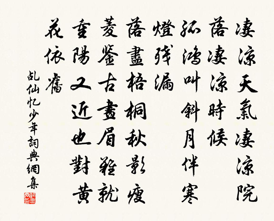 詩詞名句歷史字典書法欣賞書法字典國語詞典說文解字康熙字典古漢語字典標 題 作 者 詩 句 憶少年作者:乩仙 朝代:宋代憶少年原文淒涼天氣,淒涼院落,淒涼時候。孤鴻叫斜月,伴寒燈殘漏。落盡梧桐秋影瘦。菱鑑古、畫眉難就。重陽又近也,對黃花依舊。詩詞問答問:憶少年的作者是誰?答:乩仙問:憶少年寫於哪個朝代?答:宋代問:憶少年是什麼體裁?答:詞乩仙憶少年書法欣賞憶少年書法作品詩詞推薦寄唐稟正字齊己〔唐代〕疏野還如舊,何曾稱在城。水邊無伴立,天際有山橫。落日雲霞赤,高窗筆硯明。鮑昭多所得,時憶寄湯生。奉和竇使君同恭法師詠高僧二首竺佛圖澄慧宣〔唐代〕大誓憫塗炭,乘機入生死。中州法既弘,葛陂暴亦止。乳孔光一室,掌鏡徹千里。道盛咒蓮華,災生吟棘子。埋石憶秦娥 初見桃花袁易〔元代〕春愁淺。窺人忽見桃花臉。桃花臉。輕寒初透,小窗猶掩。東風裙濕湘波*。相逢處處如人面。如人面。劉郎老去章台夜思韋莊〔唐代〕清瑟怨遙夜,繞弦風雨哀。孤燈聞楚角,殘月下章台。芳草已雲暮,故人殊未來。家書不可寄,秋雁又南回。簞醪河徐天佑〔宋代〕往事悠悠逝水知,臨流尚想報吳時。一壺能遣三軍醉,不比商家酒作池。南歌子蘇軾〔宋代〕衛霍元勛後,韋平外族賢。吹笙只合在緱山。閒駕彩巒歸去、趁新年。烘暖燒香閣,輕寒浴佛天。他時一醉畫堂前夏日田園雜興范成大〔宋代〕下田戽水出江流,高壟翻江逆上溝;地勢不齊人力盡,丁男長在踏車頭。木犀落盡有感二首楊萬里〔宋代〕一歲秋香又一空,落英憔悴怨西風。開時占斷西風曉,豈念荷花脫病紅?別句呈庚契呈高士白玉蟾〔宋代〕一笑相逢在翠微,綠槐高柳借涼時。只將水竹煙雲興,說與風花雪月知。日落三杯無事酒,人閒八句自然詩。來朝謁金門(題扇)趙彥端〔宋代〕朱檻曲。妝淺鬢雲吹綠。半尺鵝溪涼意足。手香沾柄玉。午夢已驚難續。說與翠梧修竹。蓬海路遙天六六。乘鸞何挽和靖先生曾班〔宋代〕凜凜河南已百年,維公高行繼前賢。早施帳崇觀師席,晚入金華侍講筵。斯道未傳今逝矣,彼蒼難問竟茫然。回思壽范漕吳泳〔宋代〕豫章富人物,山谷人中豪。雖從老坡來,頗服舂陵高。泰和善鼓琴,涪水不擬騷。安知百世士,於此還一遭。送魏山韋處士一作送田處士西遊於鄴〔唐代〕陰陰亭際間,相顧慘離顏。一片雲飛去,嵯峨空魏山。縱筆陸游〔宋代〕未說無功爵位叨,昔人所畏在功高。印如斗大寧常保,劍拄頤長秪自勞。酒社極知身可隱,獵場猶得氣差豪。世間卜運算元姜夔〔宋代〕家在馬城西,今賦梅屏雪。梅雪相兼不見花,月影玲瓏徹。前度帶愁看,一餉和愁折。若使逋仙及見之,定自成愁金剛隨機無盡頌如理實見分第五釋印肅〔宋代〕如來非所說,要解無說說。將無聞為聞,方達西來訣。四月八日嘗新荔子楊萬里〔宋代〕一點臙脂染蔕旁,忽然紅遍綠衣裳。紫瓊骨骼丁香瘦,白雪肌膚午暑涼。掌上冰丸那忍觸,樽前風味獨難忘。老饕和登安濟亭蔡襄〔宋代〕亭上風吹藤帽簾,為憐情勝得安恬。驚濤觸岸層瀾碎,落日銜山半景尖。遙認犀奔知鹿角,忽逢龍掛見鬍髯。城南嘉泰昭陽大淵獻築室董孝君祠之西下有湖焉某楊簡〔宋代〕惜也天然一段奇,如何萬古罕人知。只今山色連深翠,孔子明言是孝慈。傷春詞白居易〔唐代〕深淺檐花千萬枝,碧紗窗外囀黃鸝。殘妝含淚下簾坐,盡日傷春春不知。名句推薦閣雪雲低,卷沙風急,驚雁失序。吳文英《永遇樂·探梅次時齋韻》 夜來疏雨鳴金井,一葉舞空紅淺。王月山《齊天樂·夜來疏雨鳴金井》 聞道春還未相識,走傍寒梅訪訊息。李白《早春寄王漢陽》 聚斂者,召寇、肥敵、亡國、危身之道也荀子《荀子·王制》 勸君莫惜金縷衣,勸君惜取少年時。杜秋娘《金縷衣》 金柳搖風樹樹,系彩舫龍舟遙岸。柳永《破陣樂·露花倒影》 雲深山塢,煙冷江皋,人生未易相逢。吳文英《聲聲慢·友人以梅蘭瑞香水仙供客曰四香分韻得風字》 山光悅鳥性,潭影空人心。常建《題破山寺後禪院》 立盡黃昏淚幾行,一片鴉啼月。夏完淳《卜運算元·秋色到空閨》 浮天滄海遠,去世法舟輕。錢起《送僧歸日本》