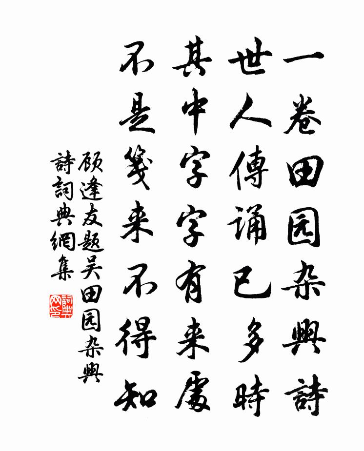 詩詞名句歷史字典書法欣賞書法字典國語詞典說文解字康熙字典古漢語字典標 題 作 者 詩 句 題吳田園雜興詩作者:顧逢友 朝代:宋代題吳田園雜興詩原文一卷田園雜興詩,世人傳誦已多時。其中字字有來處,不是箋來不得知。詩詞問答問:題吳田園雜興詩的作者是誰?答:顧逢友問:題吳田園雜興詩寫於哪個朝代?答:宋代顧逢友題吳田園雜興詩書法欣賞題吳田園雜興詩書法作品詩詞推薦遂金州禪人釋心月〔宋代〕磨磚大士眼覷瞇,歸去市場的喚醒伊。好個打車訊息子,無端錯付馬駒兒。清平樂佚名〔宋代〕阿朗去日。不道長為客。底事桐廬無處覓。卻得廣州訊息。江頭一隻蘭船。風雨湘妃廟前。死恨無情江水,送郎一早朝垂拱殿晚出東省楊萬里〔宋代〕請外天難達,留中日不遑。鳥啼金殿月,鷺集玉階霜。出晚緣堂白,歸時報錄黃。來年六十一,六十鬢蒼蒼。秋晚雜興陸游〔宋代〕渺渺風煙接小江,牛頭山色滿蓬窗。門前西走錢塘路,也有閒人似老龐。菩薩蠻劉翰〔宋代〕去時滿地花陰月。歸來落盡梧桐葉。簾外小梅殘。綠窗幽夢寒。明朝提玉勒。又作江南客。芳草遍長亭。東風吹恨禪人並化主寫真求贊釋正覺〔宋代〕淵默元成,至虛不盈。體天地之含光,十方昭徹;用陰陽之變態,萬像崝嶸。百戰瘢知風雨信,垂頭兀兀老昇平。張良徐鈞〔宋代〕博浪椎揮四海驚,虎狼雖暴已無秦。興劉滅項猶餘事,豈是蕭韓行輩人。廬山石鏡鮑溶〔唐代〕東岩採薇人,岩際朝見月。怪墮幽蘿間,非時更澄徹。綠蘿就玉兔,再與高鳥歇。清光照掌中,始悟石上發。誰傳留西山陳著〔宋代〕老憊無如汗沈何,起看玉宇瀉銀河。殘山剩水淒涼甚,明月清風感愴多。無計閉門遮外事,真成開眼夢南柯。坐來水亭陸游〔宋代〕日淡暑猶薄,雨餘風更清。翛然水亭立,試此葛衣輕。曬粉憐孤蝶,穿枝喜晚鶯。誰知簿書里,也復得吾生!徂徠山齋熟寢家童報征西府從事田集賢張著作石介〔宋代〕滿徑蓬蒿懶自鋤,何人日午叩茅廬。徂徠山下一枕睡,經略府中三紙書。兵謀貴勝縱橫出,海鳥忘機飲啄餘。唯有峽水袁燮〔宋代〕峽石險而怪,峽水清且湍。伊誰剪蒙密,發此奇偉觀。兩龍會為一,激烈不可士。蜿蜒潄鳴玉,千古甘以寒。誰雲木芙蓉歐陽修〔宋代〕種處雪消春始動,開時霜落鴈初過。誰栽金菊叢相近,織出新番蜀錦窠。見率齋王簾使劉鑒〔宋代〕千載河汾兩夫子,一家洙泗幾生徒。長堂房社俱先達,還許程元後至無。贈嚴倉曹乞推命錄陳子昂〔唐代〕少學縱橫術,游楚復游燕。棲遑長委命,富貴未知天。聞道沉冥客,青囊有秘篇。九宮探萬象,三算極重玄。願奉雪窗白玉蟾〔宋代〕素壁青燈暗,紅爐夜火深。雪花窗外白,一片歲寒心。倚樓陸游〔宋代〕減盡朱顏白髮新,高樓徙倚默傷神。未酬馬上功名願,已是人間老大身,太史周南方臥疾,拾遺劍外又逢春。一杯次韻和禮部盧侍郎(一作郎中,一本又多一極字)鄭谷〔唐代〕盧郎到處覺風生,蜀郡留連亞相情。亂後江山悲庾信,夜來煙月屬袁宏。夢歸蘭省寒星動,吟向莎洲宿鷺驚。未脫舟中夜聞讀書李時可〔宋代〕臨谿一舍竹疏疏,舟過時聞夜讀書。姓字是誰何必問,定應不是俗人居。病目作近體詩五首晁說之〔宋代〕愁極猶知吾道尊,尚煩幾許北堂萱。善人在疚鄉評減,老物可憎天意存。謾使楚囚臨澧浦,難教漢使識河源。著書名句推薦明朝又是孤舟別,愁見河橋酒幔青。竇叔向《夏夜宿表兄話舊》 門外垂楊岸側,畫橋誰系蘭舟。万俟詠《木蘭花慢·恨鶯花漸老》 粽包分兩髻,艾束著危冠。陸游《乙卯重五詩》 倚闌凝望,獨立漁翁滿江雪。李綱《六么令·次韻和賀方回金陵懷古鄱陽席上作》 長風萬里送秋雁,對此可以酣高樓。李白《宣州謝朓樓餞別校書叔雲 / 陪侍御叔華登樓歌》 可憎者,人情冷暖;可厭者,世態炎涼。程登吉《幼學瓊林·卷一·歲時》 別愁深夜雨,孤影小窗燈。陳克《臨江仙·四海十年兵不解》 同來不得同歸去,故國逢春一寂寥!杜牧《宣州送裴坦判官往舒州時牧欲赴官歸京》 人方為刀俎,我為魚肉司馬遷《史記·項羽本紀》 鳳凰城闕知何處,寥落星河一雁飛。賀鑄《思越人·紫府東風放夜時》