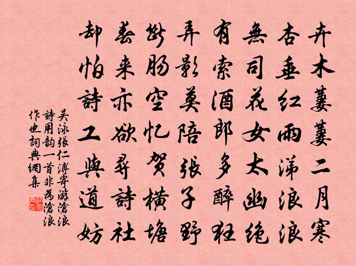 詩詞名句歷史字典書法欣賞書法字典國語詞典說文解字康熙字典古漢語字典標 題 作 者 詩 句 張仁溥寄游滄浪詩用韻一首非為滄浪作也作者:吳泳 朝代:宋代原文卉木萋萋二月寒,杏垂紅雨涕浪浪。無司花女太幽絕,有索酒郎多醉狂。弄影莫陪張子野,斷腸空憶賀橫塘。春來亦欲尋詩社,卻怕詩工與道妨。詩詞問答問:《張仁溥寄游滄浪詩用韻一首非為滄浪作也》的作者是誰?答:吳泳問:該詩寫於哪個朝代?答:宋代書法欣賞張仁溥寄游滄浪詩用韻一首非為滄浪作也書法作品詩詞推薦江城子 五月十二壽萬拙齊謝應芳〔元代〕去年今日瀉天瓢。水滔滔。斷藍橋。阻我群仙,鸞鶴赴蟠桃。獨有商羊偏喜雨,跳且舞,上山椒。今年南極見丹霄句馮杞〔宋代〕人物英雄故沔州,嶓岷千古奉雙流。過鄭司業舊居陳淳祖〔宋代〕司業閒居處,門前煙樹低。見山懷舊隱,撫壁試新題。燕語花初落,蜂衙日自西。一年春事畢,又見子規啼。詠史五首其一陶唐氏范仲淹〔宋代〕純衣黃冕歷星辰,白馬彤車一百春。莫道茅茨無復見,古今時有致堯人。答陳傳道五首之五賀鑄〔宋代〕倒橐黃金盡,方悲行路難。桂薪炊玉粒,可是樂長安。偈頌十七首釋智愚〔宋代〕道人猛利難親近,漾笠中流驗作家。憶昔高人何處去,夜深和月過平沙。醉歌陸游〔宋代〕往時一醉論斗石,坐人飲水不能敵。橫戈擊劍未足豪,落筆縱橫風雨疾。雪中會獵南山下,清曉嶙峋玉千尺;道邊和梅摯北池十詠蔣堂〔宋代〕池上有虛閣,翬檐迅若翔。百壺多盛集,四座仰惟良。蘚印文綦綠,蓮依桂楫香。何由陪嘯詠,敷袵納微涼。六代祖師贊釋文禮〔宋代〕哀哉斷臂,甘受欺瞞。心既不有,何處求安。寂寂少林人不見,一庭風雪夜漫漫。答方佑甫感懷見示之作韓維〔宋代〕壯士何憔悴,寒郊獨掩扉。有親垂素髮,為客化緇衣。風雪燈生暈,塵埃劍失威。多慚佳句贈,無寥助騫飛。題曲阿三昧王佛殿前孤石劉長卿〔唐代〕孤石自何處,對之疑舊遊。氛氳峴首夕,蒼翠剡中秋。迥出群峰當殿前,雪山靈鷲慚貞堅。一片孤雲長不去,莓苔自嘆張鎡〔宋代〕居士年來更覺痴,竹梢雲過望移時。曉窗倦櫛猶思夢,夜榻忘眠尚改詩。匹馬未能隨李廣,一丘端欲效元規。客談辛未中元記夢夢與一僧談世事良久問答中有凡五邁〔宋代〕蘧蘧一夢中,了了三生意。法界如許寬,此生亦特寄。誰言玉局仙,元本是法器。不解自磨礲,因人亦成事。強顏牧童釋智愚〔宋代〕煙暖溪頭草正肥,盡教牛臥晴曦。卷桐又入深深塢,吹盡春風不自知。山中喻峙〔宋代〕我是山中萬戶侯,明知騎馬勝騎牛。晚來馬上看山色,不似騎牛得自由。送何水部蒙出牧袁州王曾〔宋代〕雉省榮遷拜命新,魚符重佩出關頻。停驂卻訪枌榆社,戀闕回瞻析木津。水韭有誰裨政術,江山終日助吟神。一麾白露杜甫〔唐代〕白露團甘子,清晨散馬蹄。圃開連石樹,船渡入江溪。憑几看魚樂,回鞭急鳥栖。漸知秋實美,幽徑恐多蹊。感皇恩 下晉州臥病中,謝故人相訪王惲〔元代〕暴下晉州城,茫然心曲。臥對風軒數竿竹。暑光不受,似我腰圍□束。病機還自忖、非寒燠。力仕難任,居頭不足景靈宮樂章皇帝降殿乾安之曲周麟之〔宋代〕我秩元祀,上推鴻源。展來有侐,祲威肅然。升墄既降,秉心益虔。荷天之休,於千萬年。寓言皎然〔唐代〕人生百年我過半,天生才定不可換。東海釣鰲鰲不食,南山坐石石欲爛。名句推薦天上人間何處去,舊歡新夢覺來時,黃昏微雨畫簾垂。張曙《浣溪沙·枕障薰爐隔繡帷》 銅華滄海,愁霾重嶂,燕北雁南天外。吳文英《永遇樂·乙巳中秋風雨》 一春不識西湖面。翠羞紅倦。許棐《後庭花·一春不識西湖面》 沉憂能傷人,綠鬢成霜蓬。李白《怨歌行》 春風春雨花經眼,江北江南水拍天。黃庭堅《次元明韻寄子由》 漫惹爐煙雙袖紫,空將酒暈一衫青。納蘭性德《浣溪沙·伏雨朝寒愁不勝》 滿街楊柳綠絲煙,畫出清明二月天。韋莊《丙辰年鄜州遇寒食城外醉吟五首》 君實欲民之眾而惡其寡,當蓄私不可不節。墨子《墨子·06章 辭過》 肅肅花絮晚,菲菲紅素輕。杜甫《春遠 / 春運》 是故去智而有明,去賢而有功。韓非及後人《韓非子·主道》