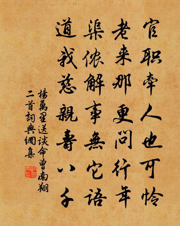詩詞名句歷史字典書法欣賞書法字典國語詞典說文解字康熙字典古漢語字典標 題 作 者 詩 句 送談命曾南翔二首作者:楊萬里 朝代:宋代送談命曾南翔二首原文官職牽人也可憐,老來那更問行年。渠儂解事無它語,道我慈親壽八千。詩詞問答問:送談命曾南翔二首的作者是誰?答:楊萬里問:送談命曾南翔二首寫於哪個朝代?答:宋代問:楊萬里的名句有哪些?答:楊萬里名句大全楊萬里送談命曾南翔二首書法欣賞送談命曾南翔二首書法作品詩詞推薦燕堂春夜陸游〔宋代〕南樓紞紞下疏更,一點紗籠滿院明。映月疏梅入簾影,讀書樨子隔窗聲。呻吟藥裹身寧久?汛掃胡塵意未平。草檄送新酒糟蟹與賈之奇五首曹勛〔宋代〕小酢銀槽新撥醅,帶糟郭索佐樽罍。一時送上天台友,助對梅花人舉杯。閒居即事陸翱〔唐代〕衰柳迷隋苑,衡門啼暮鴉。茅廚煙不動,書牖日空斜。悔下東山石,貧於南阮家。沈憂損神慮,萱草自開花。避寇入銀山貫休〔唐代〕草草穿銀峽,崎嶇路未諳。傍山為店戍,永日繞溪潭。燒地生芚蕨,人家煮偽蠶。翻如歸舊隱,步步入煙嵐。癸卯歲始春懷古田舍 其二陶淵明〔魏晉〕先師有遺訓,憂道不憂貧。瞻望邈難逮,轉欲志長勤。秉耒歡時務,解顏勸農人。平疇交遠風,良苗亦懷新。雖未謝翁子亨惠詩曾協〔宋代〕為愛高門足鳳麟,恂恂濟濟燕雙親。和聲自得壎箎樂,巧思爭裁錦繡新。句裹直須希鮑謝,客來今復見荀陳。要知悼東陽許誠之父卷剛中〔宋代〕昔同令子業膠癢,知有德行厥後昌。開廓襟懷雖善富,堅持氣節亦剛陽。掩棺往事成千古,刻石高文冠一鄉。梅峴山居十三首蔡格〔宋代〕野花幽草滿庭除,生意綿綿接太虛。獨坐空齋無一事,呼童三徑樂教鋤。詠史詩細腰宮胡曾〔唐代〕楚王辛苦戰無功,國破城荒霸業空。唯有青春花上露,至今猶泣細腰宮。白水山佛跡岩蘇軾〔宋代〕何人花守蓬萊,夜半失左股。浮山若鵬蹲,忽展垂天羽。根株互連絡,崖嶠爭吞吐。神工自爐鞲,融液相綴補。至虹出鄭清之〔宋代〕輕紅澆翠抹弓腰,高映斜陽跨碧霄。半似一條瓊玉帶,合成五色水晶橋。舟上徐照〔宋代〕小船停槳逐潮還,四五人家住一灣。貪看曉光侵月色,不知雲氣失前山。神照禪師同宿白居易〔唐代〕八年三月晦,山梨花滿枝。龍門水西寺,夜與遠公期。晏坐自相對,密語誰得知?前後際斷處,一念不生時。瑞鶴仙哀長吉〔宋代〕天基佳節後。又詩詠嵩生,賢歌天佑。千齡運非偶。慶一堂風虎,雲龍感召,相門華胄。盛少屈、一錢太守。聽吏謝襄陽鄭帥送酒項安世〔宋代〕有如雍府今方伯,無乃吾家古鄭君。鼻祖向人元不負,耳孫於我尚能勤。三更月冷冰如水,五日風調麥似雲。更有舟次吳興二首林景熙〔宋代〕釣舟遠隔菰蒲雨,酒幔輕飄菡萏風。彷佛層城鰲背上,萬家簾幕水晶宮。重遊草堂次韻三首王安石〔宋代〕野寺真蘭若,山僧老病多。疏鍾挾谷響,悲梵入樵歌。水映茅篁竹,雲埋蔦女蘿。拂塵書所見,因得擬陰何。木蘭花周紫芝〔宋代〕語人曰:相馬失之肥,相士失之瘦,世亦豈可以是論人物乎!戲作此詞,為花衢狹客一笑嫦娥天上人誰識。家在蓬讀楞嚴經釋智圓〔宋代〕案上楞嚴典,時看浣病愁。階閒移短影,窗冷值高秋。眼病花無果,心狂照失頭。指空期識月,認指更悠悠。浰陽早發蘇軾〔宋代〕富貴本無定,世人自榮枯。囂囂好名心,嗟我豈獨無。不能便退縮,但使進少徐。我行念西國,已分田園蕪。南來名句推薦朱門酒肉臭,路有凍死骨。杜甫《自京赴奉先縣詠懷五百字 / 自京赴奉先詠懷五百字》 傷情燕足留紅線,惱人鸞影閒團扇。張可久《塞鴻秋·春情》 上林訊息好,鴻雁已歸來。張元乾《臨江仙·送宇文德和被召赴行在所》 落花夜雨辭寒食。塵香明日城南陌。吳文英《菩薩蠻·落花夜雨辭寒食》 孤花片葉,斷送清秋節。納蘭性德《清平樂·孤花片葉》 月出於東山之上,徘徊於鬥牛之間。蘇軾《前赤壁賦》 誰知道,斷煙禁夜,滿城似愁風雨劉辰翁《永遇樂·璧月初晴》 波瀾誓不起,妾心古井水。孟郊《列女操 / 烈女操》 槐葉初勻日氣涼,蔥蔥鼠耳翠成雙。范成大《夏日田園雜興》 花果山福地,水簾洞洞天。吳承恩《西遊記·第一回》