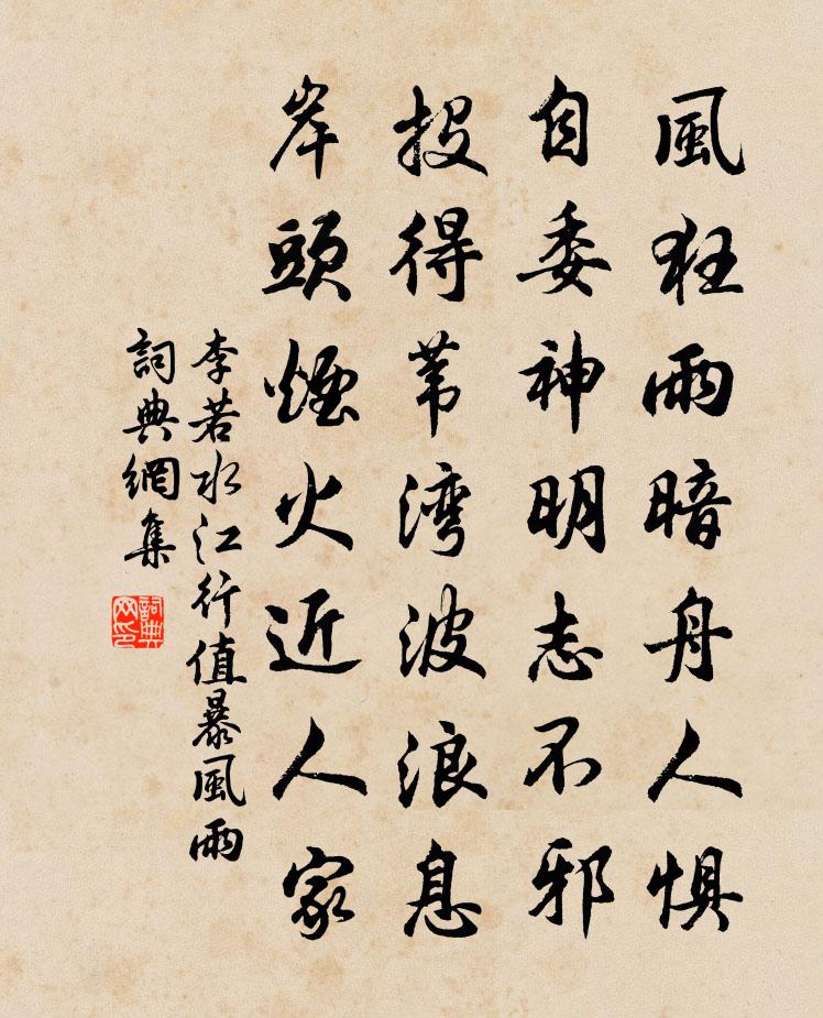 詩詞名句歷史字典書法欣賞書法字典國語詞典說文解字康熙字典古漢語字典標 題 作 者 詩 句 江行值暴風雨作者:李若水 朝代:宋代江行值暴風雨原文風狂雨暗舟人懼,自委神明志不邪。投得葦灣波浪息,岸頭煙火近人家。詩詞問答問:江行值暴風雨的作者是誰?答:李若水問:江行值暴風雨寫於哪個朝代?答:宋代問:江行值暴風雨是什麼體裁?答:七絕李若水江行值暴風雨書法欣賞江行值暴風雨書法作品詩詞推薦陽春曲李白〔唐代〕芣苡生前徑,含桃落小園。春心自搖盪,百舌更多言。 煉丹砂王玠〔元代〕學道不難知。都在人為。須憑玄牝立根基。以坎填離無間斷,得造希夷。神*靜相依。龍虎皈隨。無中養就個嬰兒題潘大臨東軒賀鑄〔宋代〕陳公少荒誕,一室未遽掃。事功竟何成,老魅死不早。潘郎治寓舍,箒禿無遺蚤。庭砌蒔蘭萱,未霜除惡草。明窗杜城茅齋二首張舜民〔宋代〕已分長招湘水魂,安知卻返杜陵村。陸居無屋舟無水,坐看南山飛白雲。陶朱公廟陳師道〔宋代〕千篇奏牘漫多知,百戰收功未出奇。名下難居身可辱,郤將湖海換西施。外舅莊子尚生辰仲並〔宋代〕荊溪之山環千峰,摩空巉絕相爭雄。與公萬仞俱壁立,祗有爽氣蟠胸中。荊溪之流碧滿野,寒光秀色兼天瀉。與公明招雜詩四首呂祖謙〔宋代〕鳥聲報僧眠,鐘聲報僧起。靜中輕白日,邈視東流水。風月有逢迎,出門聊徙倚。傳遍南北村,松間橫屐齒。水龍吟 清明後浹日,過子方小飲,廉櫳靚深史藥房〔元代〕韻蕭遠。主人出侍 * 琵琶侑觴,酒未終,上馬徑去,恍然藍橋湓浦之遇也,賦水龍吟以記其事,呈子方一笑等閒四十二叔祖母劉氏太孺人輓詞楊萬里〔宋代〕夫人自七十,有母尚期頤。不遣千山訃,猶應一病遲。孝留天下口,身立女中師。到得君羹美,翻令穎谷悲。秋夜雨吳潛〔宋代〕晚來小雨鳴檐角。又還煙障雲幕。四明窗透盪,漸夜永、綀衫輕薄。候蟲但要吟教老,不管人、老欠歡樂。閒看燭緣識宋太宗〔宋代〕夜醮星壇海岳飛,龍車搖曳羽雲衣。紅霞影里輕煙色,玉燭風清皓月輝。三島花明鋪錦繡,千年鶴送下金扉。仙家蓮花峰次敬夫韻林用中〔宋代〕十丈花開自白蓮,峰頭花色更鮮妍。分明會得濂溪趣,強作新詩續古篇。寄子蒙授常寧令黃庶〔宋代〕號隱疑名福,貪歸似姓陶。常寧邑難小,應合得牛刀。中秋日簡同盟諸公廖行之〔宋代〕風囊嘯谷獵塵衫,雨鬣行天駕玉驂。一洗蠻煙渾逐北,全提商令似征南。佳時不負中秋約,雙桂能同一夜談。我亦禪人並化主寫真求贊釋正覺〔宋代〕白髮顱上,青瞳眉底。雪點疏林,秋明野水。萬像自相投,一靈還不倚。默默一塵入正受,歷歷諸塵三昧起。送江子我歸嚴陵張元乾〔宋代〕久客驚秋晚,懷歸更送君。亂來俱避地,老去惜雜群。山閣杯浮菊,江城雁度雲。行行經釣瀨,時事不須聞。闌乾韓偓〔唐代〕掃花雖恨夜來雨,把酒卻憐晴後寒。吳質謾言愁得病,當時猶不憑闌乾。和鮑守次韻林德祖十四首傅察〔宋代〕對代勤民豈外輕,聲名今已播邊亭。風搖鈴閣終晨靜,雨鎖棠陰滿地青。賜表殊功宜冕服,榮分從吏亦緹屏。如公謁金門陳克〔宋代〕春漏促。誰見兩人心曲。罨畫屏風銀蠟燭。淚珠紅蔌蔌。懊惱歡娛不足。只許夢中相逐。今夜月明何處宿。畫橋春臘日四首張耒〔宋代〕日暖村村路,人家迭送迎。婚姻須歲暮,酒醴幸年登。簫鼓兒童集,衣裳婦女矜。敢辭雞黍費,農事及春興。名句推薦紗廚藤簟,玉人羅扇輕縑。白樸《天淨沙·夏》 十年重見,依舊秀色照清眸。王以寧《水調歌頭·呈漢陽使君》 大凡物不得其平則鳴韓愈《送孟東野序》 螢飛秋窗滿,月度霜閨遲。李白《塞下曲六首》 千里馬常有,而伯樂不常有。韓愈《馬說》 四海十年兵不解,胡塵直到江城。陳克《臨江仙·四海十年兵不解》 世所相信,在能行,不在能言。王永彬《圍爐夜話·第九九則》 目前貧富非為準,久後窮通未可知。馮夢龍《醒世恆言·卷一》 雁過孤峰曉,猿啼一樹霜。賈島《送天台僧》 上善若水,水善利萬物而不爭。老子《老子·道經·第八章》