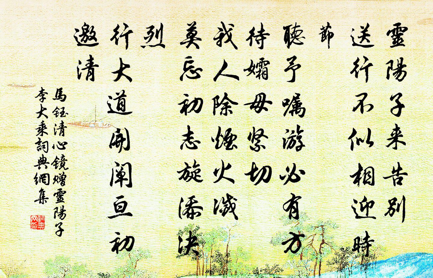 詩詞名句歷史字典書法欣賞書法字典國語詞典說文解字康熙字典古漢語字典標 題 作 者 詩 句 清心鏡 贈靈陽子李大乘作者:馬鈺 朝代:元代清心鏡 贈靈陽子李大乘原文靈陽子,來告別。送行不似,相迎時節。聽予囑、遊必有方,待孀毋緊切。我人除,煙火滅。莫忘初志,旋添決烈。行大道、開闡亘初,邀清詩詞問答問:清心鏡 贈靈陽子李大乘的作者是誰?答:馬鈺問:清心鏡 贈靈陽子李大乘寫於哪個朝代?答:元代問:清心鏡 贈靈陽子李大乘是什麼體裁?答:詞馬鈺清心鏡 贈靈陽子李大乘書法欣賞清心鏡 贈靈陽子李大乘書法作品詩詞推薦卜運算元(公赴召命道過延平,郡宴有歌妓,追誦舊事,即席賦此。)黃公度〔宋代〕寒透小窗紗,漏斷人初醒。翡翠屏間拾落釵,背立殘釭影。欲去更踟躕,離恨終難整。隴首流泉不忍聞,月落雙溪已亥雜詩 61龔自珍〔清代〕軒後孤虛縱莫尋,漢官戊己兩言深。著書不為丹鉛誤,中有風雷老將心。宿太平宮葆清庵自和少年壁間戊辰歲所作韻是岳珂〔宋代〕書閣新宮記五雲,祠官來奉帝台珍。卜鄰岩穴無公事,拜賜江硝作散人。玩月吟風閒詠客,看雲管竹系官身。從今茭白許景迂〔宋代〕翠葉森森劍有棱,柔條忪甚比輕冰。江湖若借秋風便,好與蓴鱸伴季鷹。寄慈林交講師舒岳祥〔宋代〕有意西林尋小隱,無田東瀼可隣家。聞師投謁不入巷,知我無人能點茶。山色一豀連雨色,雪花十里糝松花。秋聲卜居舒岳祥〔宋代〕丹青不用畫吾廬,小小茅茨住近湖。欲探春風先插柳,要看雪景更栽蘆。野船搖處水亂疊,海雁眠來草似鋪。妝點自金山放船至焦山蘇軾〔宋代〕金山樓觀何眈眈,撞鐘擊鼓聞淮南。焦山何有有修竹,採薪汲水僧兩三。雲霾浪打人跡絕,時有沙戶祈春蠶。我來晚晴項安世〔宋代〕一雨草木潤,新晴天地明。山川未改色,鳥雀已歡聲。客子喜相語,田家尤未平。似聞陂偃拆,掘井得深坑。鄭僉判取蘇黃門圖史園囿文章鼓吹之語為韻見方岳〔宋代〕我觀眾草樹,等是氣所囿。蓬茅一何荒,桃李一何秀。榮悴固不齊,受命了無繆。所以山中人,翩然拂歸袖。丁寧留別定襄盧軍事馬戴〔唐代〕行行與君別,路在雁門西。秋色見邊草,軍聲聞戍鼙。酣歌擊寶劍,躍馬上金堤。歸去鹹陽里,平生志不迷。過江徐鉉〔唐代〕別路知何處,離腸有所思。登樓望城遠,搖櫓過江遲。斷岸煙中失,長天水際垂。此心非橘柚,不為兩鄉移。題定林壁懷李叔時王安石〔宋代〕雲與淵明出,風隨禦寇還。燎爐無伏火,蕙帳冷空山。暗思聯句皎然〔唐代〕斜風飄雨三十夜, ——疾(失姓)鄰女餘光不相借。 ——巨川(失姓)跡滅塵生古人畫, ——皎然洞房重扉江亭晚眺王安石〔宋代〕日下崦嵫外,秋生沆碭閒。清江無限好,白鳥不勝閒。雨過雲收嶺,天空月上灣。歸鞍侵調角,回首六朝山。緣識宋太宗〔宋代〕大道常恭謹,明靈不降威。少言知有信,多事自招非。年壽看松柏,冠簪短布衣。我心忙也樂,清淨得同歸。躬耕鄧深〔宋代〕靖節田園興,子真岩谷情。古人雖不見,今代有同清。道義丘山重,軒裳羽翮輕。蕭然無俗累,心地湛虛明。次韻王適食茅栗蘇轍〔宋代〕相從萬里試南餐,對案長思苜蓿盤。山栗滿籃兼白黑,村醪入口半甜酸。久聞牛尾何曾試,竊比雞頭意未安。故國又題牡丹上主人司空孫魴〔唐代〕一年芳勝一年芳,愛重賢侯意異常。手辟紅房看闊狹,自張青幄蓋馨香。白疑美玉無多潤,紫覺靈芝不是祥。只恐魏昭父惠新刻李西台諸公帖二首趙蕃〔宋代〕翰墨要知真有種,怪來下筆每多姿。不如家學相傳授,玉軸錦囊皆得師。晚春出箭溪二首陸九淵〔宋代〕長蹊窈窕晴沙暖,綠樹交加細草香。歸去不緣吾興盡,月明應得更褰裳。名句推薦馬色雖不同,人心本無隔。李白《君馬黃》 不求見面惟通謁,名紙朝來滿敝廬。文徵明《拜年》 貧家而學富家之衣食多用,則速亡必矣。墨子《墨子·47章 貴義》 宿空房,秋夜長,夜長無寐天不明。白居易《上陽白髮人》 知者不惑,仁者不憂,勇者不懼。孔子弟子《論語·子罕篇》 休說鱸魚堪膾,盡西風,季鷹歸未?辛棄疾《水龍吟·登建康賞心亭》 改章難於造篇,易字艱於代句劉勰《文心雕龍·附會》 碧野朱橋當日事,人不見,水空流。秦觀《江城子·西城楊柳弄春柔》 昔聞洞庭水,今上岳陽樓杜甫《登岳陽樓》 美言可以市尊,美行可以加人。老子《老子·德經·第六十二章》