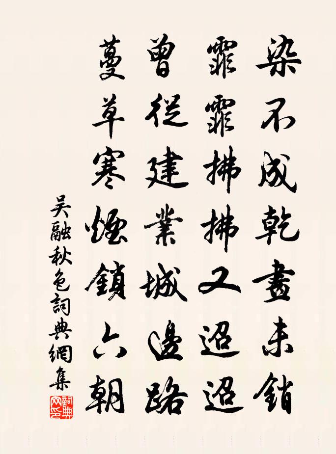 詩詞名句歷史字典書法欣賞書法字典國語詞典說文解字康熙字典古漢語字典標 題 作 者 詩 句 秋色作者:吳融 朝代:唐代秋色原文染不成乾畫未銷,霏霏拂拂又迢迢。曾從建業城邊路,蔓草寒煙鎖六朝。詩詞問答問:秋色的作者是誰?答:吳融問:秋色寫於哪個朝代?答:唐代問:秋色是什麼體裁?答:七絕吳融秋色書法欣賞秋色書法作品注釋全唐詩:卷686-36詩詞推薦階筍易士達〔宋代〕綠筍行春競著鞭,喜添嫩行護階前。兒童未識清風味,鋤取新苗供晚筵。題烏江丘氏昆仲歲寒亭賀鑄〔宋代〕新甫移根遠,蒼然對兩翁。閉門三尺雪,仰枕一亭風。東郭顏何厚,西來意莫窮。未應輸狹小,釀酒待春叢。雲際寺前山頂卻望幡竿、鷓鴣諸山二首楊萬里〔宋代〕遠近青山列盡屏,近山濃抹遠山輕。高屏已出低屏外,更有孤峰出一層。濮妃袝廟挽二首陳襄〔宋代〕天子徽柔德,神資鞠育仁。來歸聲子室,去錫大任身。白日佳城啟,黃麾法杖新。行觀升袝l禮,簫鼓鳳台春。望子嶺梅花方開用黃道韻張舜民〔宋代〕木海亭前花似錦,嶺頭梅蕊怯風沙。正如隱者歸幽谷,鶴版徵書未到家。隱父見示和章再用前韻郭印〔宋代〕關西千戶侯,分此霜根獨。幾年用幽意,列屋攢蒼玉。如聞手自種,培養非一掬。高標邈何所,於焉識面目。驗笑送寇元弼王文舉賀鑄〔宋代〕無端嵇氏叟,早結曹家偶。不遂龍蛇藏,翻從牛馬走。東西只強顏,清鏡照人頑。攲枕知歸路,開屏認舊山。甘心對月用促句換韻格胡仔〔宋代〕青玻璃色瑩長空,爛銀盤掛屋山東,晚涼徐度一襟風。天分風月相管領,對之技癢誰能忍,吟喔自恨詩才窘。掃寬禪人並化主寫真求贊釋正覺〔宋代〕湛而不渾,妙而長存。秋水何色,野雲無根。半夜天空何漢淨,老兔濯濯明月魂。寄如皋葉尉劉過〔宋代〕借馬石莊去,天寒曉出門。亂崗行兔窟,數點入鴉村。欲醉酒力薄,如迷海氣昏。客游無限事,端的向誰言。西浦曾極〔宋代〕珠璫錯落江皋佩,羅襪輕盈洛浦妝。欲采蘋花擲春信,停橈難覓杜蘭香。沁園春 寄劉光裔都事張之翰〔元代〕有手拿雲,有背摩空,相期昔年。記南方初下,送君硬語,東曹未滿,寄我奇篇。二十年間,數千里外,底事曾無滿庭芳 贈爨公馬鈺〔元代〕蓬頭面垢面,秘面奧埋名。面頤神養氣忘形。並沒纖塵掛染,意靜心明。逍遙自然快樂,握玄機、修進長生。清閒春夜書懷釋紹嵩〔宋代〕海內艱難各飽更,鬢毛寧與化工爭。春宵思極蘭燈暗,曉角初吹客夢驚。壯思不逢韓吏部,絕交益愧孔方兄。到頭憶秦娥(邯鄲道上望叢台有感)曾覿〔宋代〕風蕭瑟。邯鄲古道傷行客。傷行客。繁華一瞬,不堪思憶。叢台歌舞無訊息。金尊玉管空塵跡。空塵跡。連天草樹題汪水雲詩卷祝從龍〔宋代〕竹杖芒鞋短後衣,抱琴何處覓鍾期。百年爛醉烏程酒,千首新吟晉宋詩。京洛風塵如昨日,湖山水月此何時。近來往回臨安口號八首蘇泂〔宋代〕戒子橋南白塔西,青桐新長蓋樓枝。輕風忽向樓前過,不似長安店裡時。續演雅曾豐〔宋代〕臨川戰戰渴飲水,行道遲遲飽食牛。促織貪為先具計,提壺欠作豫防謀。知風鵲備全無患,報雨鳩言半不酬。惟有水調歌頭張祥〔宋代〕為愛龍山勝,小隊一登臨。馮仙洞府安在,抉石試幽尋。商略生平事業,擺脫人間塵土,欲與斫絲苓。泉響似相答獻外台王侍御宋祁〔宋代〕濫陪坐諾已三年,始望霜威紺弩前。舊業久辭南郡帳,深恩獨戴故人天。頭欹解散慚星弁,腹飽侏儒費月錢。欲托名句推薦睡里消魂無說處。覺來惆悵消魂誤。晏幾道《蝶戀花·夢入江南煙水路》 何處可為別,長安青綺門。李白《送裴十八圖南歸嵩山二首》 晨起開門雪滿山,雪晴雲淡日光寒。鄭燮《山中雪後》 越鳥巢乾後,歸飛體更輕。李商隱《晚晴》 功名萬里外,心事一杯中。高適《送李侍御赴安西》 器乏雕梁器,材非構廈材。趙彥昭《奉和元日賜群臣柏葉應制》 琵琶金翠羽,弦上黃鶯語。韋莊《菩薩蠻》 務本節用財無極。荀子《荀子·成相》 君命無違,榮之本也,智者捨身亦存續。來俊臣《羅織經·固榮卷第六》 讀書不下苦功,妄想顯榮,豈有此理?王永彬《圍爐夜話·第一一四則》