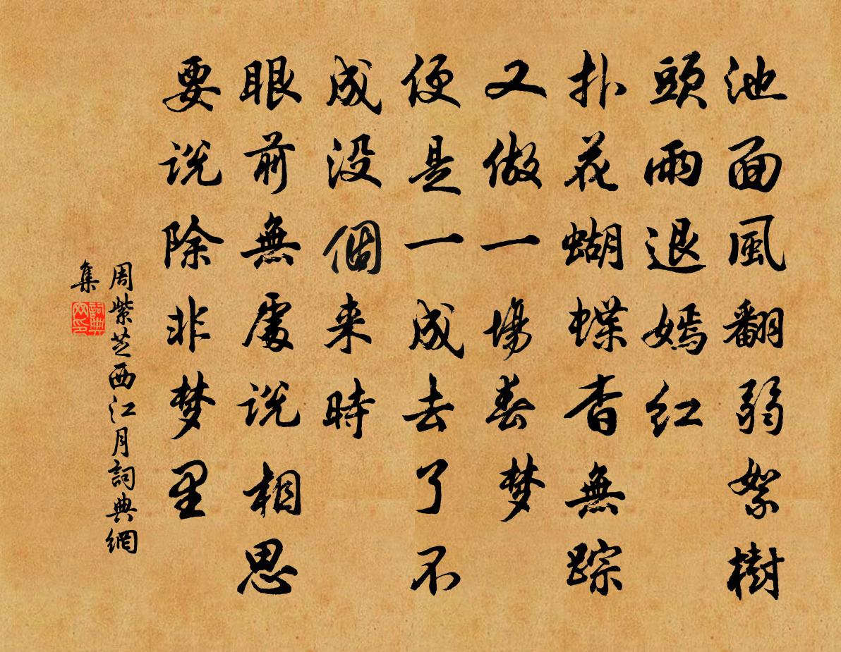 詩詞名句歷史字典書法欣賞書法字典國語詞典說文解字康熙字典古漢語字典標 題 作 者 詩 句 西江月作者:周紫芝 朝代:宋代西江月原文池面風翻弱絮,樹頭雨退嫣紅。撲花蝴蝶杳無蹤。又做一場春夢。便是一成去了,不成沒個來時。眼前無處說相思。要說除非夢裡。詩詞問答問:西江月的作者是誰?答:周紫芝問:西江月寫於哪個朝代?答:宋代問:西江月是什麼體裁?答:詞問:周紫芝的名句有哪些?答:周紫芝名句大全周紫芝西江月書法欣賞西江月書法作品詩詞推薦論語絕句一百首張九成〔宋代〕夫子何為發問初,答雲寡過未能無。斯言可謂深而宛,所以重嗟累嘆乎。道次舂陵懷古二首宋庠〔宋代〕鬱郁舂陵舊帝家,黍離千古此興嗟。蕭王何事為天子,本愛金吾與麗華。送學士汪大奠歸鄞趙汝愚〔宋代〕尚書天官貴,持經侍帷幄。青冥欲無際,白首非故約。連檣動南浦,父老望岩壑。下車入里門,孰手問歡樂。十年翫庭柳詩沈約〔南北朝〕輕陰拂建章。夾道連未央。因風結復解。沾露柔且長。楚妃思欲絕。班女淚成行。遊人未應去。為此還故鄉。春秋戰國門少孺周曇〔唐代〕寶貴親仁與善鄰,鄰兵何要互相臻。螳螂定是遭黃雀,黃雀須防挾彈人。同林擇之姚宏甫游鼓山趙汝愚〔宋代〕幾年奔走厭塵埃,此日登臨亦快哉。江月不隨流水去,天風直送海濤來。故人契闊情何厚,禪客飄零事已灰。堪嘆送同年鄭祥先輩歸漢南 時恩門相公鎮山南。趙嘏〔唐代〕年來驚喜兩心知,高處同攀次第枝。人倚繡屏閒賞夜,馬嘶花徑醉歸時。聲名本是文章得,藩閫曾來筆硯隨。家去蘆花動耿湋〔唐代〕連素穗,翻秋氣,細節疏莖任長吹。共作月中聲,孤舟發鄉思。緣識宋太宗〔宋代〕愛老及憐貧,逢迎善者親。道高明似日,世有幾般人。盛暑觀蚊蚋,窊魚探海津。閒忙皆自得,冬去後知春。賀新郎 題錢楞仙同年玉堂歸娶圖二首曾國藩〔清代〕寂寞深閨里。憶東風,泥金乍報,若何歡喜?撤帳筵圍停燭夜,細問當時原委。更密詢燒香詩婢。西舍東鄰多士女小憩陸游〔宋代〕徐行散腰膂,小憩嗇精神。休養觀書眼,調娛宴坐身。青氈我家舊,紅粟太倉陳。溫飽無餘事,寒龜息自勻。送謝錄事之越孟浩然〔唐代〕清旦江天迥,涼風西北吹。白雲向吳會,征帆亦相隨。想到耶溪日,應探禹穴奇。仙書倘相示,予在北山陲。河間王安石〔宋代〕北行麻出河間,麻千歲想賢麻王。胡麻生蓬中,詰曲終自傷。好德尚如此,恃材宜見戕。乃知陰自修,彼不為傾商崖邊積雪取食清甚賦此張栻〔宋代〕陰崖積雪射寒光,入齒清甘得味嘗。應是山神知客意,故將瓊液沃詩腸。夏日荊渚書懷齊己〔唐代〕嵩岳去值亂,匡廬回阻兵。中途息瓶錫,十載依公卿。不那猿鳥性,但懷林泉聲。何時遂情興,吟繞杉松行。雜詩龔自珍〔清代〕故人橫海拜將軍,側立南天未蕆勛。我有陰符三百字,蠟丸難寄惜雄文。惜分飛(次韻丁希閔)張綱〔宋代〕年少春心花里轉。只恐飛花片片。沈醉歸深院。妓衣何用令高卷。要看梁州初入遍。放出樓中舞燕。有眼何曾見。送田處士歐陽修〔宋代〕秦士多豪俠,未君久遁名。青山對高臥,白首喜論兵。氣古時難合,詩精格入評。公車不久召,歸袖夕風生。三老堂胡彥國〔宋代〕歷陽賓主昔多賢,三老風流二十年,獬豸冠中曾補袞,鳳凰池上迭擎天。存方寸地胡仲弓〔宋代〕此心僅方寸,去天唯咫尺。欲付子孫耕,先自竭吾力。名句推薦民感桑林雨,雲施李靖龍。趙汝愚《雨後送李將軍還祠偕同寅飲一杯亭》 微雨靄芳原,春鳩鳴何處。韋應物《東郊》 還怕兩人俱薄命,再緣慳、剩月零風裡。納蘭性德《金縷曲·亡婦忌日有感》 倦遊京洛風塵,夜來病酒無人問。晁端禮《水龍吟·詠月》 寵錫從仙禁,光華出漢京。張九齡《奉和聖制送尚書燕國公赴朔方》 欲說還休,卻道“天涼好個秋”!辛棄疾《醜奴兒·書博山道中壁》 水滿田疇稻葉齊,日光穿樹曉煙低。徐璣《新涼》 且看欲盡花經眼,莫厭傷多酒入唇。杜甫《曲江二首》 夜中不能寐,起坐彈鳴琴。阮籍《詠懷八十二首·其一》 可憐白骨攢孤冢,盡為將軍覓戰功。張蠙《吊萬人冢》