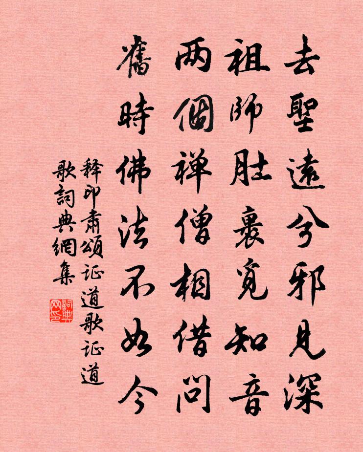 詩詞名句歷史字典書法欣賞書法字典國語詞典說文解字康熙字典古漢語字典標 題 作 者 詩 句 頌證道歌證道歌作者:釋印肅 朝代:宋代頌證道歌證道歌原文去聖遠兮邪見深,祖師肚裹覓知音。兩個禪僧相借問,舊時佛法不如今。詩詞問答問:頌證道歌證道歌的作者是誰?答:釋印肅問:頌證道歌證道歌寫於哪個朝代?答:宋代釋印肅頌證道歌證道歌書法欣賞頌證道歌證道歌書法作品詩詞推薦梧桐樹牧常晁〔元代〕世間人,須覺悟。難得人身休辜負。莫把時虛度。不離方寸蓬萊島。多少時人行不到。勸君早覓長生路。杏塘劉學箕〔宋代〕境接江東界,郵程是杏塘。雨喧茅屋小,泥滑草橋長。曠野人稀少,平田水渺茫。半生遊歷地,未若此荒涼。賀曾幼張中漕舉尹直卿〔宋代〕官樣文章曾靖州,計台一鶚再橫秋。雖為竹使年殊少,要續荷囊意未休。丹陛行尋螭陛舊,清香仍裛桂香浮。二千香積寺午齋程公許〔宋代〕峻陟龍門路,來參雞骨師。樓台春雨霽,魚鼓午齋時。倦憩僧留話,荒尋僕僮隨。一筇支野步,且以暮為期。紹興祀岳鎮海瀆四十三首佚名〔宋代〕禮樂既成,肅容有常。奄留消搖,申畢重觴。仰臚所求,降福滂洋。師象山則,以況皇帝。正蒙主文教授大著寵示佳章輒繼嚴韻仰酬盛意度正〔宋代〕珍重知音審五聲,也從紙上得張程。設科久矣何曾見,想像雙瞳萬古驚。蔡子強挽章劉子翬〔宋代〕擢秀詞林少也奇,星軺榮耀更分麾。世傳清德名方盛,生不長年理可疑。蘇晉逃禪心淡泊。孔融好客酒淋漓。眼看訪僧法通不遇姚合〔唐代〕訪師師不遇,禮佛佛無言。依舊將煩惱,黃昏入宅門。西昌陳誠之送黃樓芍藥仍枉長篇老懶不能次韻周必大〔宋代〕芍藥名先記鄭風,那因嘉木辨雌雄。姚黃後出今亡矣,合把黃樓列上公。寄題王亞夫檢正不啻足齋楊萬里〔宋代〕既得宮隴,復望宮蜀,未求宮寶劍先求玉。秦相後車一千谷,唐相宮八百斛。黃金肘邛駕黃鵠,身前佞佛身後福。偈頌一百四十一首釋師範〔宋代〕剋期取證,系縛盲驢。休夏自陳,且莫鬼語。陳氏童子草書歌皎然〔唐代〕書家孺子有奇名,天然大草令人驚。僧虔老時把筆法,孺子如今皆暗合。飆揮電灑眼不及,但覺毫端鳴颯颯。有時雜曲歌辭行路難二首僧齊己〔唐代〕行路難,君好看,驚波不在黤黮間,小人心裡藏奔湍。七盤九折寒崷崪,翻車倒蓋猶堪出。未似是非唇舌危,暗中偈頌一百六十首釋宗杲〔宋代〕今朝八月十有五,顧兔天邊誰不睹。若非東土小釋迦,放過長水管老虎。東坡引(九日)曹冠〔宋代〕涼飈生玉宇。黃花曉凝露。汀苹岸蓼秋將暮。登高開宴俎。傳杯興逸,分詠得句。思戲馬、長懷古。東籬候酒人何東郡懷古二首王京兆李德裕〔唐代〕河水昔將決,衝波溢川潯。崢嶸金堤下,噴薄風雷音。投馬災未弭,為魚嘆方深。惟公執珪璧,誓與身俱沉。誠信雨中水閣閒眺蘇泂〔宋代〕兩山正作修眉綠,一水猶如疋練橫。竟日書窗覽今古,幾年人世少豪英。次韻斯遠二十六日三絕趙蕃〔宋代〕春風去我孰能留,寒疾聞君頓已瘳。示以斜斜並整整,故知莫莫復休休。孤雁舒岳祥〔宋代〕憂心悄悄睡示能,開門看月一片冰。竅木相磨作鬼語,凍星入牖如螢青。孤雁哀號向何處,老夫掩耳不欲聽。爾從贈王副伴袁說友〔宋代〕將軍年少時,束髮在行伍。西方頃多事,二十勇如虎。一身殆百戰,手足瘡四五。征行久邊戍,肯憚服役苦。西陲名句推薦朔方正月雪澌澌,單于策馬至京西沈約《昭君辭》 落盡梨花春又了。滿地殘陽,翠色和煙老。梅堯臣《蘇幕遮·草》 舞殿冷袖,風雨淒淒。杜牧《阿房宮賦》 水激則悍,矢激則遠劉向《說苑·談叢》 不求見面惟通謁,名紙朝來滿敝廬。文徵明《拜年》 萬國奔騰,兩宮幽陷,此恨何時雪。黃中輔《念奴嬌·炎精中否》 見而不見,聞而不聞,知而不知。韓非及後人《韓非子·主道》 己有能,勿自私。人所能,勿輕訾。李毓秀《弟子規·泛愛眾》 去時梅萼初凝粉。不覺小桃風力損。歐陽修《玉樓春·去時梅萼初凝粉》 海畔風吹凍泥裂,枯桐葉落枝梢折。陳羽《從軍行》
