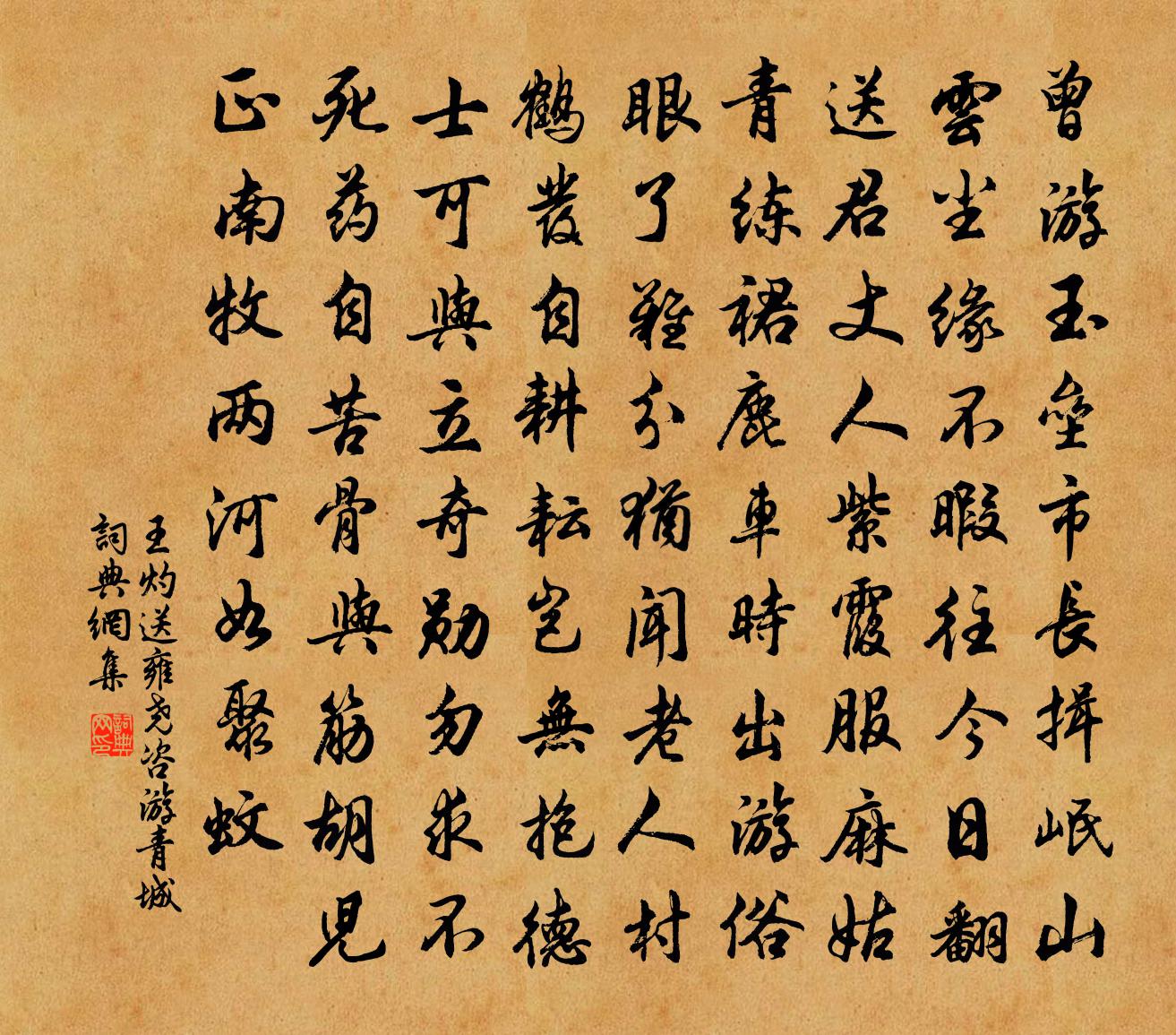 詩詞名句歷史字典書法欣賞書法字典國語詞典說文解字康熙字典古漢語字典標 題 作 者 詩 句 送雍堯咨游青城作者:王灼 朝代:宋代送雍堯咨游青城原文曾游玉壘市,長揖岷山雲。塵緣不暇往,今日翻送君。丈人紫霞服,麻姑青練裙。鹿車時出遊,俗眼了難分。猶聞老人村,鶴髮自耕耘。豈無抱德士,可與立奇勳。勿求不死藥,自苦骨與筋。胡兒正南牧,兩河如聚蚊。詩詞問答問:送雍堯咨游青城的作者是誰?答:王灼問:送雍堯咨游青城寫於哪個朝代?答:宋代王灼送雍堯咨游青城書法欣賞送雍堯咨游青城書法作品詩詞推薦牡丹柳渾〔唐代〕近來無奈牡丹何,數十千錢買一顆。今朝始得分明見,也共戎葵不校多。發商水道中陳與義〔宋代〕商水西門語,東風動柳枝。年華入危涕,世事本前期。草草檀公策,茫茫杜老詩。山川馬前闊,不敢計歸時。答人問仁者安仁林光朝〔宋代〕千年古道萬年堤,老牯循循不解迷。牧子不知何處在,亂山荒草鷓鴣啼。相思兒令晏殊〔宋代〕春色漸芳菲也,遲日滿煙波。正好艷陽時節,爭奈落花何。醉來擬恣狂歌。斷腸中、贏得愁多。不如歸傍紗窗,有頌十玄談演教釋印肅〔宋代〕鶴樹終談理未玄,口中吐露白如蓮。一花五葉親分付,只恐眾生眼著攣。東林寺陳舜俞〔宋代〕白髮老僧安住處,青衫司馬愛閒來。松嫌天近株株短,花待春歸款款開。堪信壺中藏日月,誰知雲外有樓台。官卑漁父詞(其四)佚名〔宋代〕滿湖飛雪攪長空。急起呼兒上短篷。蓑笠具,晝圖同。釺笛聲長曲未終。游楊梓岩白玉蟾〔宋代〕天半秋風鳴萬松,芫花半落夕陽紅。寮煙暗鎖仙壇古,野意深藏丹灶空。人採紫芝何處覓,我來白晝不相逢。一聲賀新郎王奕〔宋代〕復不淮楚,往復六千里,共賦此詞,括盡山川所歷之妙,真所謂茲行平生者也有客過東魯。自葛水、泛舟西下,帆戲友人買侍兒歸林尚仁〔宋代〕幾扣吟窗多不遇,識君雖久會君稀。近聞行李擔書去,添得明珠伴劍歸。開瓮酒香春繞屋,倚欄人醉月侵衣。野夫雜題十首劉克莊〔宋代〕淑妃寒食語,千載尚堪哀。不念同光帝,□□□□□。紹興以後祀五方帝六十首佚名〔宋代〕太微呈祥,炎德克彰。佑我基命,格於明昌。一純二精,有嚴典祀。於以奠之,以介繁祉。病中詩十五首。送嵩客白居易〔唐代〕登山臨水分無期,泉石煙霞今屬誰。君到嵩陽吟此句,與教二十六峰知。題王校書山齋劉滄〔唐代〕猿鳥無聲晝掩扉,寒原隔水到人稀。雲晴古木月初上,雪滿空庭鶴未歸。藥囿地連山色近,樵家路入樹煙微。棲遲避寇劉黻〔宋代〕戊午九月十,洶洶群寇生。疋枹與赤水,參會童石氓。烹牛飫凶豎,剚人諂妖靈。長驅無齟齬,四境騰沸羹。野廬蘭郭印〔宋代〕幽人紉為佩,不為香與色。秋菊暨江南,未可比君德。歸國遙·春欲晚韋莊〔五代〕春欲晚,戲蝶游蜂花爛熳。日落謝家池館,柳絲金縷斷。睡覺綠鬟風亂,畫屏雲雨散。閒倚博山長嘆,淚流沾皓腕本無師與槐徑弟交遊二十年矣古人謂百篇詩盡薛嵎〔宋代〕中年為此別,悲動故交情。案上雲林卷,山中風木聲。夢回驚復喜,詩在死如生。幾番西郊路,逢師獨自行。水仙花項安世〔宋代〕意濃態遠十洲人,歲晏天寒七澤濱。奕奕雲冠疑映月,僛僛翠帶欲搖春。梅稍枉為行人瘦,柳眼虛隨酒市新。林下古梅無名釋〔唐代〕火虐風饕水漬根,霜皴雪皺古苔痕。東風未肯隨寒暑,又櫱清香與返魂。名句推薦機中錦字論長恨,樓上花枝笑獨眠。皇甫冉《春思》 風暖鳥聲碎,日高花影重。杜荀鶴《 * 怨》 五月天山雪,無花只有寒。李白《塞下曲六首·其一》 借得山東煙水寨,來買鳳城春色施耐庵《念奴嬌·天南地北》 長安一片月,萬戶搗衣聲。李白《子夜吳歌·秋歌》 巧言令色,鮮矣仁。孔子弟子《論語·學而篇》 回樂烽前沙似雪,受降城外月如霜。李益《夜上受降城聞笛》 水遠煙微,一點滄洲白鷺飛歐陽修《採桑子·何人解賞西湖好》 冰合井泉月入閨,金缸青凝照悲啼。李白《夜坐吟》 及茲春未深,數畝猶足佃。王守仁《謫居糧絕請學於農將田南山詠言寄懷》