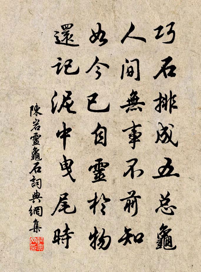 詩詞名句歷史字典書法欣賞書法字典國語詞典說文解字康熙字典古漢語字典標 題 作 者 詩 句 靈龜石作者:陳岩 朝代:宋代靈龜石原文巧石排成五總龜,人間無事不前知。如今已自靈於物,還記泥中曳尾時。詩詞問答問:靈龜石的作者是誰?答:陳岩問:靈龜石寫於哪個朝代?答:宋代陳岩靈龜石書法欣賞靈龜石書法作品詩詞推薦鷓鴣天 元夕有所夢姜夔〔宋代〕肥水東流無盡期,當初不合種相思。夢中未比丹青見,暗裡忽驚山鳥啼。春未綠,鬢先絲,人間別久不成悲。誰教書丁謂〔宋代〕始向龜圖妙,爰從鳥跡成。偃波如制妙,例薤更難精。蔡表崩雲重,曹章綴露輕。憶曾思刻玉,瓊簡鏤金英。舟中見月郭印〔宋代〕濮上今秋月,於人太有情。銀盤隨水涌,素練截江橫。岸闊且猶近,船虛夜自明。寒光連上下,萬里一心清。嶼贈白雲先生王迥孟浩然〔唐代〕悠悠清水江,水落沙嶼出。回潭石下深,綠筿岸傍密。鮫人潛不見,漁父歌自逸。憶與君別時,泛舟如昨日。夕陽禪人並化主寫真求贊釋正覺〔宋代〕淵默而明,湛存而妙。三世齊平,十方圓照。月隨水而流,風入松而嘯。相逢會有知音,向道自然同調。偈頌七首釋亮〔宋代〕說參禪,彌一過,緣是見成行貨。可憐背覺合塵,飯籮邊忍屆餓。江上春嘆岑參〔唐代〕臘月江上暖,南橋新柳枝。春風觸處到,憶得故園時。終日不如意,出門何所之。從人覓顏色,自笑弱男兒。詩二首方回〔宋代〕一牝猶嫌將兩雄,趨新背舊片時中。陡忘前主能為叛,乍事他人更不忠。玉碗空亡無易馬,絳桃猶在未隨風。何須水仙子佚名〔宋代〕晚節寒花猶帶蕊。隱映老人星瑞世。綠衣初是政成歸,真盛事。誰可比。那更新來孫又子。煙細金爐香旖旎。想像悠然堂和致明絕句劉子翬〔宋代〕清霜一夜倒蒹葭,放出湖光徹遠沙。漠漠浮煙收欲盡,晚風輕浪蹴銀花。送趙樞寺丞宰虔化縣陶弼〔宋代〕路入虔雲去,如何輕解攜。人煙五嶺北,星斗大江西。暖雪梅花樹,晴雷贛石溪。青衫欲無淚,不奈鷓鴣啼。江城子(德久同醉,子似出新置佐酒,和德久詞)韓淲〔宋代〕天孫應為織雲裳。試宮妝。問劉郎。湖上波寒,依舊遠山蒼。自是老來心事懶,空落拓,少年場。揮豪閒與細端相送別劉商〔唐代〕灞岸青門有弊廬,昨來聞道半丘墟。陌頭空送長安使,舊里無人可寄書。望漢月/憶漢月李遵勗〔宋代〕 * 一叢臨砌。顆顆露珠裝綴。獨教冷落向秋天,恨東君不曾留意。雕闌新雨霽。綠蘚上,亂鋪金蕊。此花開後更感春十三首張耒〔宋代〕沈陰涉春仲,積潦斷行跡。浮雲起南山,商羊未休息。壅涸無宿滯,芬芳有新摘。燈明休間齊,鳥靜山靄夕。濁醪揚州后土祠瓊花鮮于侁〔宋代〕百花天下多,瓊花天上稀。結根吒靈祠,地著不可移。八蓓冠群芳,一株攢萬枝。孤生淮海上,晚秀清百時。攜賞江上客懷黃庚〔宋代〕鏡裹從渠白髮添,吟邊抵掌復掀髯。十年為客甘清苦,一枕忘情付黑甜。短褐怯風綿未絮,破窗漏月紙重粘。梅花鵲橋仙(雨中賞酴醿,次周監稅韻)郭應祥〔宋代〕杯盤草草,園亭小小,不用羅帷錦幄。酴醿本是殿餘春,更風雨、無端趲卻。有詞可和,有棋可賭,雜以詼諧戲謔題公美庭前蘆黃庶〔宋代〕長安只說誰花好,君把青蘆砌下栽。鳴雁也知人好事,幾時銜得入關來。臨江仙·大風雨過馬當薛時雨〔清代〕雨驟風馳帆似舞,一舟輕度溪灣。人家臨水有無間。江豚吹浪立,沙鳥得魚閒。絕代才人天亦喜,借他只手回瀾。名句推薦三千年事殘鴉外,無言倦憑秋樹。吳文英《齊天樂·與馮深居登禹陵》 君看蕭蕭只數葉,滿堂風雨不勝寒。李東陽《柯敬仲墨竹》 十年種木,一年種穀,都付兒童。元好問《人月圓·重岡已隔紅塵斷》 報導先生歸也,杏花春雨江南。虞集《風入松·寄柯敬仲》 兒女紛紛夸結束,新樣釵符艾虎。劉克莊《賀新郎·端午》 昨別今已春,鬢絲生幾縷。韋應物《長安遇馮著》 還將兩行淚,遙寄海西頭。孟浩然《宿桐廬江寄廣陵舊遊》 宮衣亦有名,端午被恩榮。杜甫《端午日賜衣》 接漢疑星落,依樓似月懸。盧照鄰《十五夜觀燈》 一騎紅塵妃子笑,無人知是荔枝來。杜牧《過華清宮絕句三首》