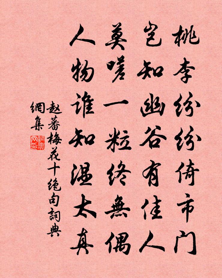 詩詞名句歷史字典書法欣賞書法字典國語詞典說文解字康熙字典古漢語字典標 題 作 者 詩 句 梅花十絕句作者:趙蕃 朝代:宋代梅花十絕句原文桃李紛紛倚市門,豈知幽谷有佳人。莫嗟一粒終無偶,人物誰知溫太真。詩詞問答問:梅花十絕句的作者是誰?答:趙蕃問:梅花十絕句寫於哪個朝代?答:宋代趙蕃梅花十絕句書法欣賞梅花十絕句書法作品詩詞推薦送羽人王錫歸羅浮曹唐〔唐代〕風前整頓紫荷巾,常向羅浮保養神。石磴倚天行帶月,鐵橋通海入無塵。龍蛇出洞閒邀雨,犀象眠花不避人。最愛玉樓春石孝友〔宋代〕一陽不受群陰壅。殘歷行間冬破仲。雲低吹白臘寒濃,梅小綻紅春意重。湖山千里勤飛控。淑氣沖融披水凍。笑攜史敷文輓詞樓鑰〔宋代〕學問源流遠,樂哉賢父兄。人琴亡舊曲,風木愴寒聲。深痛幾成毀,沉痾汔喪生。孝恭無可憾,猶得傍佳城。夜宴觀妓薛逢〔唐代〕燈火熒煌醉客豪,捲簾羅綺艷仙桃。纖腰怕束金蟬斷,鬢髮宜簪白燕高。愁傍翠蛾深八字,笑回丹臉利雙刀。無因題從伯舍人道正里南園劉得仁〔唐代〕帝里余新第,朱門面碧岑。曙堂增爽氣,喬木動清陰。直去親瑤陛,朝回在竹林。風流才子調,好尚古人心。薜荔得舍弟觀書自中都已達江陵,今茲暮春月末,杜甫〔唐代〕爾到江陵府,何時到峽州。亂離生有別,聚集病應瘳。颯颯開啼眼,朝朝上水樓。老身須付託,白骨更何憂。喜聞中丞包公稱職有書楊蟠〔宋代〕薛宣執法動朝廷,丙魏如今亦有聲。公道未亡猶可立,世人不慣卻須驚。幅員潤澤嘉謀進,台閣風流故事明。時論贈郭功父吳則禮〔宋代〕兒童疇昔看揮毫,未覺雄辭愧廣騷。談塵縱橫走雷電,詩壇磊落建麾旄。捐身魚鳥黃塵遠,隱几江湖白浪高。短褐山居雜詩九十首曹勛〔宋代〕門前露草嫩,極目遨青龍。策杖不知遠,看山兼別峰。曉廚尋晚筍,客供摘新菘。舌下清肥足,何勞細肋供。頌古釋道顏〔宋代〕不假文殊神通,休要罔明彈指。爾時靈山會中,女子從定而起。表弟周明道工於傅神而山水亦佳,久別來訪,楊萬里〔宋代〕儂家有軸郭熙山,墮在水溪雪嶺間。有弟新來眼如月,為儂洗手拾將還。石過青渠壁間有何人者詩欲梓潼神君戒殺以從李石〔宋代〕香茗粗蔬肯破慳,相公日食萬羊山。夫君何厚神何薄,自取懸鶉一水間。仙學堂李仲光〔宋代〕天人異所稟,事物皆生知。強名仙學堂,此語將誰欺。我欲借隙地,虛檐敞茅茨。琅琅誦玉章,勉力探希夷。周蒼崖入吾山作圖詩贈之文天祥〔宋代〕三生石上結因緣,袍笏橫斜學米顛。漁父幾忘山下路,仙人時訪嶺頭船。烏猿白鶴無根樹,淡月疏星一線天。為我即事二首司空圖〔唐代〕茶爽添詩句,天清瑩道心。只留鶴一隻,此外是空林。御禮征奇策,人心注盛時。從來留振滯,只待濟臨危。虞師晉師滅夏陽穀梁赤〔先秦〕非國而曰滅,重夏陽也。虞無師,其曰師,何也?以其先晉,不可以不言師也。其先晉何也?為主乎滅夏陽也。夏杜門絕俸呈陳倅虞儔〔宋代〕家食年來嘆不充,支離受粟信無功。白頭慈母須微祿,青眼何人到寓公。未辦殺雞留郭泰,更能給俸助盧仝。半生幽成四景蛩音張玉孃〔宋代〕落木舊山寺,霜清葉掃風。已無雞犬聲,虛殿鳴秋蛩。奚大卿許賦生香亭詩以促之吳晦之〔宋代〕暗香浮動月初斜,彷佛西湖處士家。誰道廣平心似鐵,不將佳句賦梅花。游寺雲觀劉應龍〔宋代〕雨絕春風和,沉棲慕遐矚。野火開叢荊,遙岑路徑熟。極頂如掌平,群峰四環矗。人言古觀基,突兀此有屋。半嶺名句推薦盡道有些堪恨處,無情,任是無情也動人。秦觀《南鄉子·妙手寫徽真》 秋波落泗水,海色明徂徠。李白《魯郡東石門送杜二甫》 獨善其身盡日安,何須千古名不朽!羅貫中《三國演義·第三十七回》 歡言得所憩,美酒聊共揮。李白《下終南山過斛斯山人宿置酒》 怠慢忘身,禍災乃作。荀子《荀子·勸學》 愁無限,消瘦盡,有誰知?閒教玉籠鸚鵡念郎詩。納蘭性德《相見歡·落花如夢淒迷》 道私者亂,道法者治。韓非及後人《韓非子·詭使》 遠雁下平沙,嘹亮遺淒唳。劉道著《湘江秋曉》 非其地而樹之,不生也。劉向《說苑·雜言》 本來無一物,何處惹塵埃!惠能《菩提偈》
