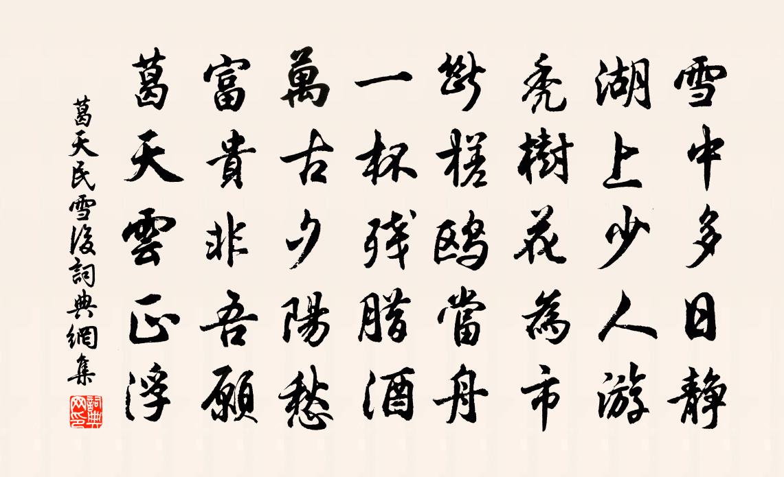 詩詞名句歷史字典書法欣賞書法字典國語詞典說文解字康熙字典古漢語字典標 題 作 者 詩 句 雪後作者:葛天民 朝代:宋代雪後原文雪中多日靜,湖上少人游。禿樹花為市,斷槎鷗當舟。一杯殘臘酒,萬古夕陽愁。富貴非吾願,葛天雲正浮。詩詞問答問:雪後的作者是誰?答:葛天民問:雪後寫於哪個朝代?答:宋代葛天民雪後書法欣賞雪後書法作品詩詞推薦初秋行圃四首楊萬里〔宋代〕今年六月不勝涼,七月炎蒸不可當。一陣秋風初過雨,個般天氣好燒香。浪出丘葵〔宋代〕浪出鬼揶揄,歸來失故吾。庭空榕落子,人靜鳥呼雛。潮退石自出,天高日正晡。寥寥誰與語,懷古一長吁。句陸堅〔唐代〕風移覃土宇,雲上浹群臣。(千秋節應制,《海錄碎事》)寄柳舍人宗元賈島〔唐代〕格與功俱造,何人意不降。一宵三夢柳,孤泊九秋江。擢第名重列,沖天字幾雙。誓為仙者仆,側執馭風幢。秋日懷松溪趙宰經父章粲〔宋代〕晴窗靜繙書,凝塵掩行跡。花影晝簾閒,苔痕秋徑寂。憑高招遠風,緣流弄寒碧。緘情寄天涯,杳杳江閩隔。過昭君村賦詩李壁〔宋代〕王嬙南郡良家子,靚飾丰容照江水。何人引入光明宮,綠鬢雲鬟朝暮理。增成亦擬備充依,反向陰山嫁胡兒。陰山挽李漕二首洪咨夔〔宋代〕翰墨多推轂,功名早著鞭,風行青草外,春到白鹽邊。老去心猶壯,歸來意正便,如何天不憗,煙雨閟新阡。觀吳偃畫松施肩吾〔唐代〕君有絕藝終身寶,方寸巧心通萬造。忽然寫出澗底松,筆下看看一枝老。清遠峽四首楊萬里〔宋代〕清遠望峽山,山腳無半里。小舟行其間,五日翠未已。並馳兩蒼龍,中夾一玉水。送我到英州,渠當自回轡。寒食清明十首劉克莊〔宋代〕唐朝知制誥,多付與詩人。豈有飛花句,虛為起草臣。寄劉成道戴栩〔宋代〕歸淮方向浙,度盡一年寒。想見添詩卷,傳聞攝酒官。雨多江漵暗,米賤客愁寬。舊友參台幕,應留看牡丹。送林袞侍御東陽秩滿赴上都劉商〔唐代〕幾年烏府內,何處逐鳧歸。關吏迷驄馬,銅章累繡衣。野亭山草綠,客路柳花飛。況復長安遠,音書從此稀。蘇幕遮 贈張善道馬鈺〔元代〕耳門聞,心煩惱。日日憂愁,不覺容顏老。眼做看門招病早。口是禍門,德喪身亡了。鼻玄門,通大道。日用不勤奉和魯望秋日遣懷次韻皮日休〔唐代〕高蹈為時背,幽懷是事兼。神仙君可致,江海我能淹。共守庚申夜,同看乙巳占。藥囊除紫蠹,丹灶拂紅鹽。與物送張起、崔載華之閩中劉長卿〔唐代〕朝無寒士達,家在舊山貧。相送天涯里,憐君更遠人。次韻喜陳吉老還家二絕黃庭堅〔宋代〕夜寒客枕多歸夢,歸得黃柑紫蔗秋。小雨對談揮塵尾,青燈分坐寫蠅頭。外孫文九伏中入村曬麥蘇轍〔宋代〕春田不雨憂無麥,入囷得半猶足食。伏中一曬不可緩,旱田蒼耳猶難得。人言春旱夏當潦,入伏未保天日好。老農奉使登終南山王灣〔唐代〕常愛南山游,因而盡原隰。數朝至林嶺,百仞登嵬岌。石壯馬徑窮,苔色步緣入。物奇春狀改,氣遠天香集。虛洞命子 其一陶淵明〔魏晉〕悠悠我祖,爰自陶唐。邈焉虞賓,歷世重光。御龍勤夏,豕韋翼商。穆穆司徒,厥族以昌。挽王侍郎陳宓〔宋代〕天台雄秀萃方岩,仙骨童時已不凡。才傑少魁金榜第,年高猶帶侍臣銜。蚤因名節成閒退,晚等薰蕕謝謗讒。衰老名句推薦雙飛燕子幾時回?夾岸桃花蘸水開。徐俯《春遊湖》 尊賢使能,俊傑在位,則天下之士皆悅而願立於其朝矣。孟子《孟子·公孫丑章句上·第五節》 無我原非你,從他不解伊。曹雪芹《紅樓夢·第二十二回》 君子養心莫善於誠荀子《荀子·不苟》 天地玄黃,宇宙洪荒。周興嗣《千字文·全文》 行人莫問當年事,故國東來渭水流。許渾《鹹陽城東樓 / 鹹陽城西樓晚眺 / 西門》 侯門一入深如海,從此蕭郎是路人。崔郊《贈去婢》 羊腸白道穿雲出,雁齒紅橋亞水低。許德溥《西橋柳色》 無言獨上西樓,月如鉤。李煜《相見歡·無言獨上西樓》 桃未芳菲杏未紅,沖寒先喜笑東風。曹雪芹《詠紅梅花得“紅”字》