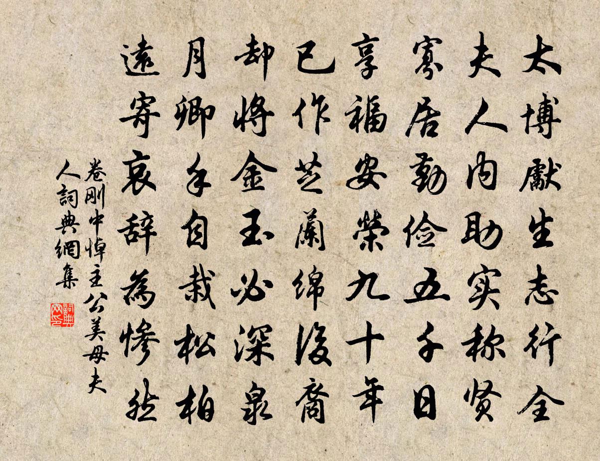 詩詞名句歷史字典書法欣賞書法字典國語詞典說文解字康熙字典古漢語字典標 題 作 者 詩 句 悼主公美母夫人作者:卷剛中 朝代:宋代悼主公美母夫人原文太博先生志行全,夫人內助實稱賢。寡居勤儉五千日,享福安榮九十年。已作芝蘭綿後裔,卻將金玉必深泉。月卿手自栽松柏,遠寄哀辭為慘然。詩詞問答問:悼主公美母夫人的作者是誰?答:卷剛中問:悼主公美母夫人寫於哪個朝代?答:宋代卷剛中悼主公美母夫人書法欣賞悼主公美母夫人書法作品詩詞推薦春晴白玉蟾〔宋代〕宿靄縈余凍,鬆陰挾嫩晴。朝來花萬福,鶯奏起居聲。文宣王及其弟子贊宋高宗〔宋代〕東平子產,性著盛時。奉師於塾,講道之微。答問其敏,婉妙以思。升降陛廉,尚想英姿。梧葉兒徐再思〔元代〕芳草思南浦,行雲夢楚陽,流水恨瀟湘。花底春鶯燕,釵頭金鳳凰,被面繡鴛鴦:是幾等兒眠思夢想!自詠白居易〔唐代〕悶發每吟詩引興,興來兼酌酒開顏。欲逢假日先招客,正對衙時亦望山。勾檢簿書多鹵莽,堤防官吏少機關。誰能留別安鳳徐侃〔唐代〕君寄長安久,恥不還故鄉。我別長安去,切在慰高堂。不意與離恨,泉下亦難忘。題范伯詩顧齋蔡沈〔宋代〕時人慾作聖賢歸,反己由來自不欺。談話每虞無十步,持循長恐有虛辭。砼砼固不為茲必,踽踽寧求可善斯。吃緊昭武太守王子文日舉李賈嚴羽共觀前輩一兩家戴復古〔宋代〕詩本無形在窈冥,網羅天地運吟情。有時忽得驚人句,費盡心機做不成。菩薩蠻(夜宿余家樓聞笛聲)韓元吉〔宋代〕薄雲卷雨涼成陣。雨晴陡覺荷香潤。波影澹寒星。水邊鐙火明。白苹洲上路。幾度來還去。敧枕恨茫茫。笛聲依夜次韻外舅黃虞卿為愛山園好八首喻良能〔宋代〕為愛山園好,蕭齋竹逕通。疏簾卷雌霓,曲檻倚雄風。愛酒杜陵老,煎茶桑薴翁。菟裘真得計,蹤跡免飄蓬。思山居一十首清明後憶山中李德裕〔唐代〕遙思寒食後,野老林下醉。月照一山明,風吹百花氣。飛泉與萬籟,仿佛疑簫吹。不待曙華分,已應喧鳥至。記顏六言三首劉克莊〔宋代〕謗之則喪家狗,譽之則人中龍。華發去周柱下,深衣立魯門東。次韻劉淳叟見寄二首喻良能〔宋代〕出處雙青鬢,生涯一釣舟。淺深山遠近,濃淡樹稀稠。隱几晝逾靜,捲簾春更幽。便當乘興去,艤棹向汀洲。感皇恩王惲〔元代〕日日午餐余,即須幽討。拄杖長行覓周老。三杯兩*,不致玉山傾倒。與君何處去、乾*好。松影閒庭,長吟藉草句王珪〔唐代〕朱門深鎖不知春,苒苒年光暗中換。田家春日二首黃彥平〔宋代〕緯竹梁溪面,誅茅舍道旁。臘收冰下紙,春課社前姜。露草牛羊長,風花杖屢香。人生但如此,官獨為誰忙。和安國天缽拈香韓維〔宋代〕杖策乘緣利有生,聞風猶得耳根清。去年俱是凝然體,存歿徒傷妄者情。靈骨不隨煙共盡,真心常與月孤明。世人述懷劉沆〔宋代〕虎生三日便窺牛,獵犬寧能掉尾求。若不去登黃閣貴,便須來伴赤松游。奴顏婢舌誠堪恥,羊狠狼貪自合羞。三尺游谷山寺齊己〔唐代〕城裡尋常見碧棱,水邊朝暮送歸僧。數峰雲腳垂平地,一徑松聲徹上層。寒澗不生浮世物,陰崖猶積去年冰。此身春日即事危稹〔宋代〕麥風翻隴潑濃綠,花露滴枝粘老紅。小立樓頭檢春事,一絲暖日墜青蟲。雪竹於石〔宋代〕君子亭亭操,剛強能自持。夷齊餓欲死,巡遠守方危。大節不可屈,真心終莫移。人心與物理,每向歲寒枝。名句推薦錦江近西煙水綠,新雨山頭荔枝熟。張籍《成都曲》 莫聽穿林打葉聲,何妨吟嘯且徐行。蘇軾《定風波·莫聽穿林打葉聲》 君子遵道而行,半途而廢:吾弗能已矣。子思《中庸·第十一章》 驅馬天雨雪,軍行入高山。杜甫《前出塞九首》 風也蕭蕭,雨也蕭蕭,瘦盡燈花又一宵。納蘭性德《採桑子·誰翻樂府淒涼曲》 交朋友增體面,不如交朋友益身心王永彬《圍爐夜話·第四五則》 為有雲屏無限嬌,鳳城寒盡怕春宵。李商隱《為有》 願學秋胡婦,貞心比古松。李白《湖邊採蓮婦》 況是青春日將暮,桃花亂落如紅雨。李賀《將進酒》 夜深風竹敲秋韻,萬葉千聲皆是恨。歐陽修《玉樓春·別後不知君遠近》