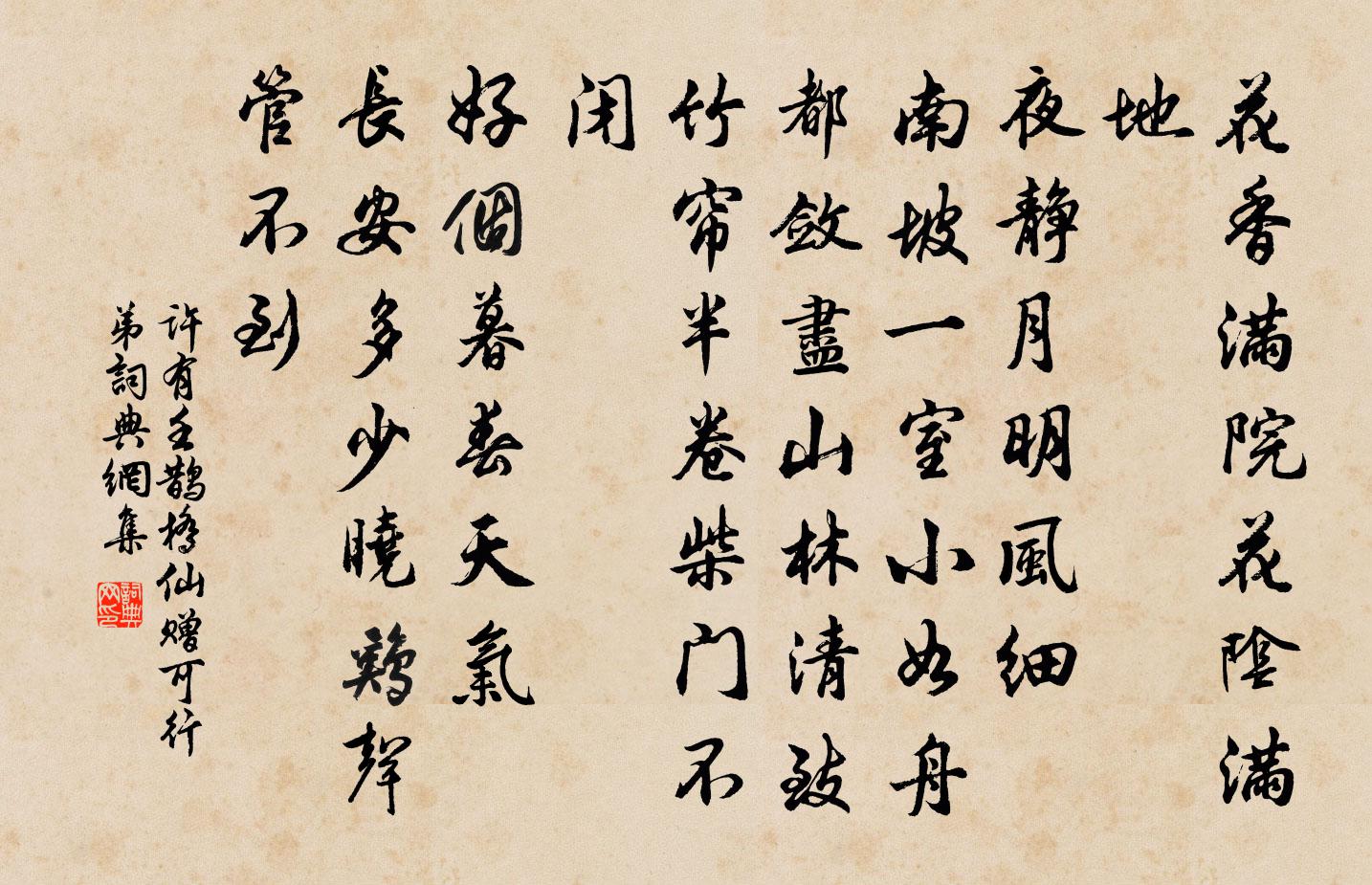 詩詞名句歷史字典書法欣賞書法字典國語詞典說文解字康熙字典古漢語字典標 題 作 者 詩 句 鵲橋仙 贈可行弟作者:許有壬 朝代:元代鵲橋仙 贈可行弟原文花香滿院,花陰滿地。夜靜月明風細。南坡一室小如舟,都斂盡、山林清致。竹簾半卷,柴門不閉。好個暮春天氣。長安多少曉雞聲,管不到詩詞問答問:鵲橋仙 贈可行弟的作者是誰?答:許有壬問:鵲橋仙 贈可行弟寫於哪個朝代?答:元代問:鵲橋仙 贈可行弟是什麼體裁?答:詞許有壬鵲橋仙 贈可行弟書法欣賞鵲橋仙 贈可行弟書法作品詩詞推薦惜芳時 贈無欲盧守慈馬鈺〔元代〕清清淨淨祥雲腳。九竅內、往來交錯。誰知妙用緣無作。自然理煉成丹藥。驪龍吐出神珠爍。現萬道霞光罩卻。虛追和叔祖自術韻胡震雷〔宋代〕伯祖剛簡公榕陰圖,先君肯堂翁常欲鑱石,因循至今。一日震雷從家弟震載觀,則名公巨筆聯編盈軸,益知我公大除夜方岳〔宋代〕幸有牛衣暖似春,可曾半字日邊人。不知相國何為者,撩得諸公屋大嗔。藍田溪雜詠二十二首潺湲聲錢起〔唐代〕亂石跳素波,寒聲聞幾處。颼颼暝風引,散出空林去。嘆魯二首白居易〔唐代〕季桓心豈忠,其富過周公。陽貨道豈正,其權執國命。由來富與權,不系才與賢。所託得其地,雖愚亦獲安。彘肥玉樓春(文縝、倪巨濟、王元衷、蘇叔黨宴張子實家。侍人賀全真妙絕一時)向子諲〔宋代〕雲窗霧閣春風透。蝶繞蜂圍花氣漏。惱人風味恰如梅,倚醉腰肢全是柳。細傳一曲情偏厚。淡掃兩山緣底皺。歸時出郭詩呈張守劉子翬〔宋代〕出郭籃輿載酒隨,林邊蕭寺趁幽期。雲依石度遙看久,路繞田分欲去疑。落日悲風滄海外,黃化翠竹晚秋時。憑詩挽鄭大監陳宓〔宋代〕鴞鷙天生異,鵬摶世擬遙。軺麾三錫命,省監兩登朝。報國丹心皦,浮生兩鬢凋。受恩知幾士,雨泣楚魂招。偈頌一百六十首釋宗杲〔宋代〕如天普蓋,似地普擎。一念相應,一時清淨。雙松亭徐僑〔宋代〕雙松如老虬,拜然俯於地。山下草細微,降從所非類。昂藏烈丈夫,肯與樵牧比。樛枝若欲頹,直乾固不倚。外柔宿韋津山居劉得仁〔唐代〕永夕見招宿,詩書盈草堂。靜吟傾美酒,高論出名場。窗颯松篁韻,庭兼雪月光。心期身未老,一去泛瀟湘。宮女圖高啟〔明代〕 * 扶醉踏蒼苔,明月西園侍宴回。小犬隔花空吠影,夜深宮禁有誰來?十二時/憶少年洪邁〔宋代〕璧門雙闕轉蒼龍。德壽儼祗宮。軒屏正坐,天子親拜天公。儀紳笏,羅鵷鷺,粲庭中。仙家歡不盡,人世壽無窮。晚泊二絕葛立方〔宋代〕晚泊牛羊已下來,清泉為我洗塵埃。解顏客裹無卮酒,壁上尋詩笑幾回。石佛清長老請贊釋普濟〔宋代〕東山毛之源,東毛磵之淵毛。截流毛之機,驗人之眼。揚清激濁,地覆天翻。六代祖師,豎毛呵手。三生大像,頓依韻奉和司徒侍中中秋筵散雨餘微見月色強至〔宋代〕待月開筵細雨侵,月來賓去意空深。未容午夜瞻全璧,先隔微雲漏碎金。萬戶漸宜歸一望,重樓恨不起千尋。應須海山樓陳瓘〔宋代〕勝事荒湮久,高城觀閣宜。均勞青瑣客,餘事海山詩。追送友人李季允歸蜀三首並寄所懷周南〔宋代〕西州餘一老,六月上窮山。仲子何時到,三吳說鬢斑。土風添藥費,新地有生還。歸夢商於近,音書報是間。搗練子 贈李舍人馬鈺〔元代〕張都料,最奔波。蓋因手作忒僂羅,惹僂羅,沒奈何。聽予勸,離巢窩。閒閒閒里煉沖和。得真修,止大羅。綺羅香(前題)王沂孫〔宋代〕夜滴研朱,晨妝試酒,寒樹偷分春艷。賦冷吳江,一片試霜猶淺。驚漢殿、絳點初凝,認隋苑、彩枝重翦。問仙丹名句推薦有情不管別離久。情在相逢終有。晏幾道《秋蕊香·池苑清陰欲就》 遠送從此別,青山空復情。杜甫《奉濟驛重送嚴公四韻》 春風桃李花開日,秋雨梧桐葉落時。白居易《長恨歌》 波上馬嘶看棹去,柳邊人歇待船歸。溫庭筠《利州南渡》 還作江南會,翻疑夢裡逢。戴叔倫《客夜與故人偶集 / 江鄉故人偶集客舍》 雲移雉尾開宮扇,日繞龍鱗識聖顏。杜甫《秋興八首》 休別有魚處,莫戀淺灘頭。佚名《增廣賢文·上集》 君不見,高堂明鏡悲白髮,朝如青絲暮成雪。李白《將進酒》 北窗高臥,莫教啼鳥驚著。辛棄疾《念奴嬌·賦雨岩》 讀書好處心先覺,立雪深時道已傳。袁枚《隨園詩話·卷三》