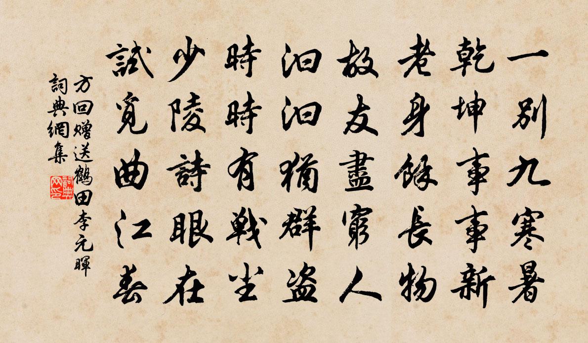 詩詞名句歷史字典書法欣賞書法字典國語詞典說文解字康熙字典古漢語字典標 題 作 者 詩 句 贈送鶴田李元暉作者:方回 朝代:宋代贈送鶴田李元暉原文一別九寒暑,乾坤事事新。老身余長物,故友盡窮人。汩汩猶群盜,時時有戰塵。少陵詩眼在,試覓曲江春。詩詞問答問:贈送鶴田李元暉的作者是誰?答:方回問:贈送鶴田李元暉寫於哪個朝代?答:宋代方回贈送鶴田李元暉書法欣賞贈送鶴田李元暉書法作品詩詞推薦東興鋪二首趙文〔宋代〕老人無淚與君啼,夢裡相逢路竟迷。二十三年崇勝寺,對床今夜是江西。嘲蛇傷足鄧肅〔宋代〕責官只得林泉幽,也有曲膂潛相讎。肆毒不知分彼是,後身那解癖春秋。我嬰逆鱗龍不怒,誰和蠢蠢取當路。要我田將軍書院賈島〔唐代〕滿庭花木半新栽,石自平湖遠岸來。筍迸鄰家還長竹,地經山雨幾層苔。井當深夜泉微上,閣入高秋戶盡開。行背三閭大夫贊王柏〔宋代〕愛國憂民感慨深,沅湘浩浩魄沈沈。懷沙哀郢成何事,日月爭光只此心。送裴秀才往會稽山讀書皎然〔唐代〕一身齎萬卷,編室寄煙蘿。硯滴穿池小,書衣種楮多。吟詩山響答,泛瑟竹聲和。鶴板求儒術,深居意若何。秋夜宴王郎中宅賦得露中菊劉灣〔唐代〕眾芳春競發,寒菊露偏滋。受氣何曾異,開花獨自遲。晚成猶有分,欲采未過時。勿棄東籬下,看隨秋草衰。奉使契丹回出上京馬上作歐陽修〔宋代〕紫貂裘暖朔風驚,潢水冰光射日月。笑語同來向公子,馬頭今日向南行。寒夜觀雪范成大〔宋代〕靜極孤鴻響,寒疑萬籟喑。眼花燈下字,髭斷雪中吟。頗似償前債,非關惜寸陰。可憐蝴蝶夢,翩作蠹書蟫。太常引舒頔〔元代〕□□山色共承宣。君秩滿、我遲延。幾度醉花前。曾怪殺、春山杜鵑。菱花再照,鸞膠再續,應笑雪盈顛。深夜語杭州秋日別故友長孫佐輔〔唐代〕相見又相別,大江秋水深。悲歡一世事,去住兩鄉心。淅瀝籬下葉,淒清階上琴。獨隨孤棹去,何處更同衾。臨江仙(阿方初出)趙令畤〔宋代〕枝上粉香吹欲盡,依前庭院春風。更誰同繞摘芳叢。漏殘金獸冷,信斷錦屏空。看結燈花愁不睡,酒闌無夢相逢。居厚弟和七十四吟再賦劉克莊〔宋代〕占斷溪山不紀年,俗開謗道是呆仙。馬遲甘殿他人後,棋劣常輸敵手先。飢咬菜根美熊掌,窮燒柏子當龍涎。可憐勸酒李敬方〔唐代〕不向花前醉,花應解笑人。只憂連夜雨,又過一年春。日日無窮事,區區有限身。若非杯酒里,何以寄天真。贈郭相士俊夫劉克莊〔宋代〕東郭無全履,南轅似轉蓬。自慚老中壘,莫誤小林宗。若見同胞子,為言禿鬢翁。衰年不堪玩,一病一龍鍾。詩一首龔茂良〔宋代〕千章古木轉頭空,去與人間作棟隆。未必真能庇寒士,不如留此貯清風。送史純夫出疆王銍〔宋代〕悠悠遠水季膺舟,漠漠余寒季子裘。隔歲梅花新舊恨,入春山色古今愁。重遊梁宋三千里,看復關河四百州。辯舌題虛照堂彭仲剛〔宋代〕宇空發天光,所患在自窒。機乘不容穟,事至紛若櫛。是中有物橫,滿眼皆墨漆。斯堂亦空歟,為我作虛室。成父期以十八日至已而爽約趙蕃〔宋代〕已是跫然誤足音,更堪疎雨過平林。呼燈自舉一卮酒,顛倒海濤尋破衾。滴滴金佚名〔宋代〕當初親下求言詔。引得都來胡道。人人招是駱寶王,並洛陽年少。自訟監宮並岳廟。都一時閒了。誤人多是誤人多烏夜啼釋文珦〔宋代〕東家屋樹與雲齊,夜夜有烏來上棲。明月照樹棲烏啼,愁殺窗中戰士妻。名句推薦憶年十五心尚孩,健如黃犢走復來。杜甫《百憂集行》 正護月雲輕,嫩冰猶薄。辛棄疾《瑞鶴仙·賦梅》 國無三年之食者,國非其國也墨子《墨子·05章 七患》 強龍不壓地頭蛇。吳承恩《西遊記·第四十五回》 事無終始,無務多業。墨子《墨子·02章 修身》 藍橋何處覓雲英。只有多情流水、伴人行。蘇軾《南歌子·寓意》 偶參伍之驗,以責陳言之實韓非及後人《韓非子·備內》 江帶峨眉雪,川橫三峽流。李白《經亂離後天恩流夜郎憶舊遊書懷贈江夏韋太守良宰》 朔吹飄夜香,繁霜滋曉白。柳宗元《早梅》 自從明宰投巫後,直至如今鬼不神汪遵《西河》