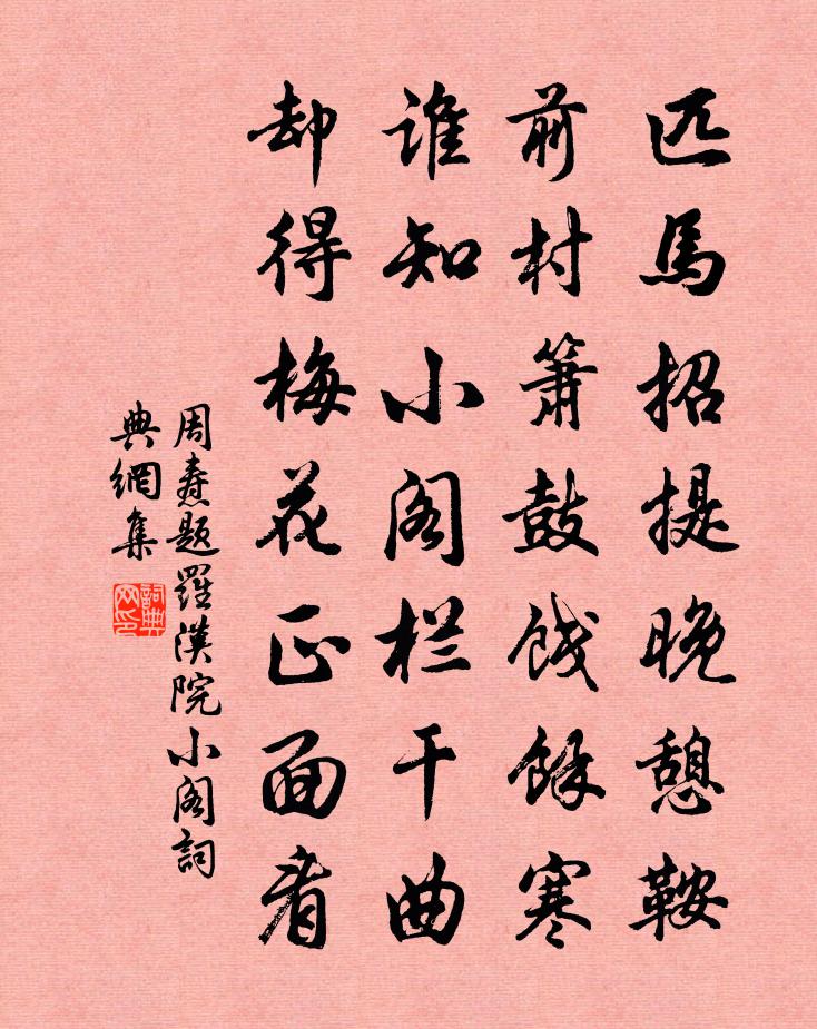 詩詞名句歷史字典書法欣賞書法字典國語詞典說文解字康熙字典古漢語字典標 題 作 者 詩 句 題羅漢院小閣作者:周燾 朝代:宋代題羅漢院小閣原文匹馬招提晚憩鞍,前村簫鼓餞余寒。誰知小閣欄乾曲,卻得梅花正面看。詩詞問答問:題羅漢院小閣的作者是誰?答:周燾問:題羅漢院小閣寫於哪個朝代?答:宋代周燾題羅漢院小閣書法欣賞題羅漢院小閣書法作品詩詞推薦偈頌七十六首釋師觀〔宋代〕光陰何太疾,如白駒過隙。惟有衲僧家,日日是好日。和叔夏十絕一宿雲峰寺二到韓公莊三飯草衣岩胡寅〔宋代〕莫笑田翁不任真,好賢留客意殊親。海棠半拆山丹重,京洛何曾遠客身。晚寒熾炭楊萬里〔宋代〕老子平生不附炎,雪間爐炭晚間添。紅光亂拆銀花碎,翠焰雙抽柳葉尖。愛惜麒麟牢禁手,驅除鹽絮密垂簾。急分東村步歸陸游〔宋代〕野渡霜風冷,茆檐夕照明。催科醉亭長,聚學老書生。山果紛丹漆,村醪任濁清路回家忽近,柳外小橋橫。逢謝師直梅堯臣〔宋代〕昔歲南陽道中別,今向華亭水上逢。把酒語君悲且喜,流光冉冉去無蹤。贈紫岩潘庭堅四首白玉蟾〔宋代〕富貴非足羨,貧賤不足羞。張儀但有舌,周朴不惜頭。我少亦學劍,到此萬年休。知君耿素抱,曷不遠行游。新元二首劉克莊〔宋代〕朝三暮四昔尚童,逾七望八今成翁。見佛未肯右肩袒,對客嘗稱左耳聾。叩額有疏拜墀下,斷腕無麻納禁中。自憐雨後郭印〔宋代〕氣候西南異,山川自一方。暑殘秋更熱,雨過夜初涼。燈火容緗帙,詩書有錦囊。更深猶不寐,暗露襲衣裳。題白雲岩韓京〔宋代〕良辰尋勝到禪閣,盡日澄懷水石間。白酒黃花聊自若,盛游何必羨龍山。將到金陵投宿烏江寺李彌遜〔宋代〕閱世真成一夢闌,塵埃誰復共開顏。辛壬癸甲常為客,南北東西只問山。縈樹遠雲高作蓋,護田流水曲於環。秋風贈徐希仁石硯別盧仝〔唐代〕靈山一片不靈石,手斫成器心所惜。鳳鳥不至池不成,蛟龍乾蟠水空滴。青松火煉翠煙凝,寒竹風搖遠天碧。今日和李公擇赴歷下道中雜詠十二首其十梁山洎見蘇轍〔宋代〕行到平湖意自寬,繁花仍得就船看。回頭卻向吳儂說,從此遠遊心未闌。賦揚州伯父海檜樓鑰〔宋代〕潛虬拔地徑矢矯,騰拿勢出青雲表。為誰猶向此中蟠,坐閱春秋昏復曉。團團高蓋月輪平。矗矗蒼叢眾星小。枯槎用夾穀子括吳山晚眺韻十首方回〔宋代〕一錐無地百弓寬,萬事須分兩眼觀。仙子樓居凌到景,野人卉服耐奇寒。金釵玉斝春帷滿,黃卷青燈曉漏殘。興廢張守唱和紅字韻詩八首劉子翬〔宋代〕斷虹明晚井,煙靄半隨風。岸柳霜收綠,庭榴日貸紅。酒酣腸有海,棋戰手興戎。賡唱逢勍敵,方知比興功。真宗奉聖祖玉清昭應宮十一首真宗〔宋代〕精心既過,真游允臻。禮容斯舉,福應惟醇。將整佃騷,言還上旻。永存嘉貺,用泰屢民。和向監廟紅梅王洋〔宋代〕已屢春風一醉來,不知妝鏡為誰開。慮妃只解如飄雪,也費陳王八斗才。筍何應龍〔宋代〕泥中莫怪出頭遲,歷盡冰霜只自知。昨夜震雷轟渭畝,請君來看化龍枝。浣溪沙周密〔宋代〕不下珠簾怕燕瞋。旋移芳檻引流鶯。春光卻早又中分。杏火無煙然綠暗,梨雲如雪冷清明。冶遊天氣冶遊心。題法海平闍黎秦觀〔宋代〕寒食山州百色喧,春風花雨暗川原。因循移病依香火,寫得彌陀七萬言。名句推薦尺蠖之屈,以求信也;龍蛇之蟄,以存身也。佚名《易傳·繫辭傳下·第五章》 一人飛升,仙及雞犬。蒲松齡《聊齋志異·卷四·促織》 歲寒無與同,朗月何朧朧。潘安《悼亡詩三首》 寄語天涯客,輕寒底用愁。于謙《除夜太原寒甚》 至人天隱,其次地隱,其次名隱。王通《中說·卷四·事君篇》 山無陵,江水為竭。佚名《上邪》 春朝秋夜思君甚,愁見繡屏孤枕。魏承班《滿宮花·雪霏霏》 寧為百夫長,勝作一書生。楊炯《從軍行》 多謝月相憐,今宵不忍圓。朱淑真《菩薩蠻·山亭水榭秋方半》 拱把之桐梓,人苟欲生之,皆知所以養之者。孟子《孟子·告子章句上·第十三節》
