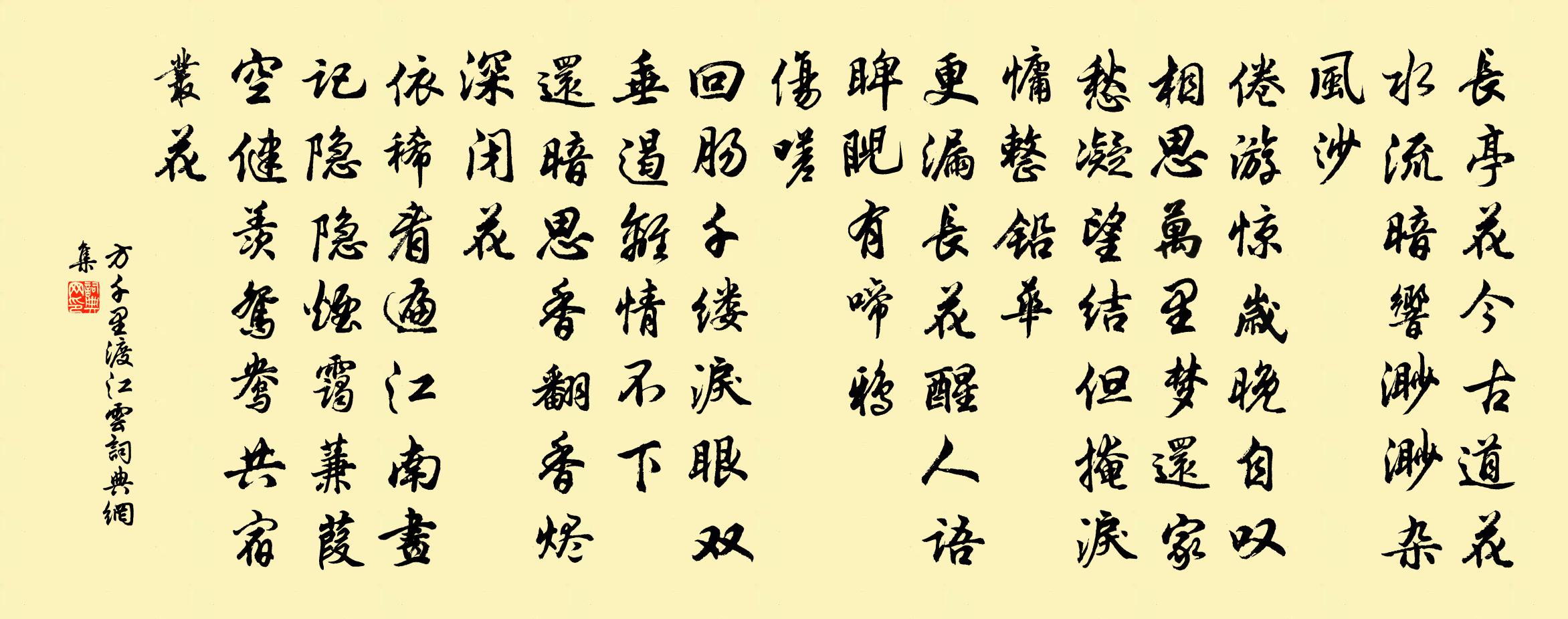 詩詞名句歷史字典書法欣賞書法字典國語詞典說文解字康熙字典古漢語字典標 題 作 者 詩 句 渡江雲作者:方千里 朝代:宋代渡江雲原文長亭花今古道,花水流暗響,渺渺雜風沙。倦遊驚歲晚,自嘆相思,萬里夢還家。愁凝望結,但掩淚、慵整鉛華。更漏長,花醒人語,睥睨有啼鴉。傷嗟。迴腸千縷,淚眼雙垂,遏離情不下。還暗思、香翻香燼,深閉花。依稀看遍江南畫,記隱隱、煙靄蒹葭。空健羨,鴛鴦共宿叢花。詩詞問答問:渡江雲的作者是誰?答:方千里問:渡江雲寫於哪個朝代?答:宋代問:渡江雲是什麼體裁?答:詞方千里渡江雲書法欣賞渡江雲書法作品詩詞推薦水調歌頭(九日多景樓用吳侍郎韻)方岳〔宋代〕醉我一壺玉,了此十分秋。江濤還此,當日擊楫渡中流。問訊重陽煙雨,俯仰人間今古,此意渺滄洲。天地幾今夕醜奴兒/採桑子陳允平〔宋代〕歲寒時節千林表,獨耐風霜。妒粉欺黃。澹澹衣裳薄薄妝。西湖十二闌乾曲,倚遍寒香。白鷺橫塘。一片孤山幾夕句鮑溶〔唐代〕萬里岐路多,一身天地窄。(見張為《主客圖》)如夢令許有壬〔元代〕有淚綠窗偷灑。有恨錦箋難寫。消瘦不勝春,玉骨都無一把。風雅。風雅。正值文君新寡。苦旱六首陳造〔宋代〕枯旱歲十九,無若今歲酷。日色雖許赤,苗心尚余綠。舉觴勸睡龍,雄飛勝雌伏。作意收桑榆,前愆儻容贖。泊舟都梁亭二首張耒〔宋代〕旅枕無眠客夢勞,五更旁舍一雞號。汴淮水闊浮梁小,城郭霜晴寶塔高。梅鎖冷香通雀啄,水翻新綠出漁篙。君恩晚步溪上呂祖謙〔宋代〕疎疎屐齒印平堤,露著烏紗客未知。別浦歸舟爭占岸,橫林宿鳥自分枝。開張漁父胸中趣,漏泄騷人句外悲。會與荔厄一首劉克莊〔宋代〕怒潦浮槎去,狂飆拔木飛。不饒後村荔,如奪首陽薇。任土包茅闕,過時碩果稀。誰言長卿渴,且咽上池肥。除夜陸游〔宋代〕野水楓林屋數椽,寒爐無火坐無氈。殘燈耿耿愁孤影,小雪霏霏送舊年。椒酒辟瘟傾瀲灩,藍袍俘鬼舞跰躚。從今為章道祖頗及葛藤踴山閣葛立方〔宋代〕橫空復闔面嵯峨,影墮前溪瑟瑟波。九坂端疑築梁第,二山應恐負夸娥。凌雲北固俗塵遠,採菊東籬真意多。會取代作五首項安世〔宋代〕晝漏如今天共永,壽辰於此數難量。三千花實桃猶小,五日春秋木未長。羲宅巧占堯火正,娥宮新學羿弦張。兩輪初夏旅中五首楊公遠〔宋代〕每憶吾廬隱者居,天然景物足清娛。樹林陰翳鶯求友,簾幕深沈燕引雛。可釣可耕盤谷序,堪詩堪畫輞川圖。何當匣中琴於鄴〔唐代〕世人無正心,蟲網匣中琴。何以經時廢,非為娛耳音。獨令高韻在,誰感隙塵深。應是南風曲,聲聲不合今。失調名張耒〔宋代〕水團冰浸砂糖裹。有透明角黍松兒和。鵲橋仙(己未七夕)吳潛〔宋代〕銀河半隱,玉蟾高掛,已覺炎光向後。穿針樓上未眠人,應自把、荷花挼揉。雙星縹緲,霎時聚散,肯向鵲橋回首方仙翁祠方有開〔宋代〕真仙祠館鎖層嵐,下瞰平疇十里寬。譜牒尚標唐篆額,風儀仍是漢衣冠。紫芝白兔靈如昨,石碣丹湖事不刊。千古久不見竹堂篇輒以湘窣索之兩詩繼至因用其韻袁燮〔宋代〕往時{賸月換貝}喜親標格,今日無因款話言。兀坐書齋飽蔬食,想公飲客厭熊蹯。念奴嬌(登平江齊雲樓,夜飲雙瑞堂,呈雷吏部)張鎡〔宋代〕東吳名勝,有高樓直在,浮雲齊處。十二闌乾邀遠望,歷歷斜陽煙樹。香徑人稀,屧廊山繞,往事今何許。一天和游洞霄陸卿〔宋代〕名山長錶冠東南,一柱屹然天與參。玉府從來通六六,金扃寧竟鎖三三。千岩深處標馴虎,萬乘當時幸秣驂。撫掌李士舉見寄次韻為謝二首晁公溯〔宋代〕想見山靈喜,如看柱史來。江清無急硤,野潤失飛埃。行攬孟博轡,再然安國灰。相過忍遽別,莫放錦帆開。名句推薦南朝千古傷心事,猶唱後庭花。吳激《人月圓·南朝千古傷心事》 感時花濺淚,恨別鳥驚心。杜甫《春望》 柳徑無人,墮絮飛無影。張先《翦牡丹(舟中聞雙琵琶·般涉調)》 白雲江上故鄉,月下風前吟處。子蘭《秋日思舊山》 財不患其不得,患財得,而不能善用其財王永彬《圍爐夜話·第四四則》 東武望餘杭,雲海天涯兩渺茫。蘇軾《南鄉子·和楊元素時移守密州》 起望衣冠神州路,白日銷殘戰骨。辛棄疾《賀新郎·用前韻送杜叔高》 天不老,情難絕。張先《千秋歲·數聲鶗鴂》 鄰國相望,雞犬之聲相聞,民至老死不相往來。老子《老子·德經·第八十章》 奸不容細,私告任坐使然也。韓非及後人《韓非子·制分》