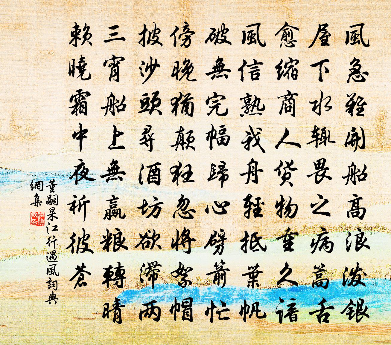 詩詞名句歷史字典書法欣賞書法字典國語詞典說文解字康熙字典古漢語字典標 題 作 者 詩 句 江行遇風作者:董嗣杲 朝代:宋代江行遇風原文風急難開船,高浪潑銀屋。下水輒畏之,病篙舌愈縮。商人貨物重,久諳風信熟。我舟輕抵葉,帆破無完幅。歸心劈箭忙,傍晚猶顛狂。忽將絮帽披,沙頭尋酒坊。欲滯兩三宵,船上無贏糧。轉晴賴曉霜,中夜祈彼蒼。詩詞問答問:江行遇風的作者是誰?答:董嗣杲問:江行遇風寫於哪個朝代?答:宋代董嗣杲江行遇風書法欣賞江行遇風書法作品詩詞推薦游羅浮林俛〔宋代〕此日鵝城第一山,我來登鑒足清歡。心灰久不作春夢,食淡何須輟晚餐。寶積山中多佛剎,藥槽峰外是仙壇。憑誰和孟世功秋日吳江見寄吳芾〔宋代〕扁舟西去氣凌雲,坐看魚龍躍浪紋。風起白苹初日晚,霜雕紅葉欲秋分。忘機鷗鷺情相狎,入筆江山句不群。正恐詠華林書院錢易〔宋代〕旌表華林盛,儒官寄翠微。科名新伯仲,孝行舊光輝。雲影陰書幌,松花濕道衣。自慚方試吏,爭得去忘機。次韻楊廷秀待制寄題朱氏渙然書院周必大〔宋代〕日出杲杲安問螢,弨掛翻翻誰受檠。大哉風行水上渙,一夕泮盡峨峨冰。招董彥文以下十二人小酌道舊曾豐〔宋代〕鶴髮雞皮十二人,非親非故即比鄰。觥籌交錯情初洽,舌本瀾翻事半陳。父祖艱難猶在耳,兒孫憤悱可書紳。主人薌岩山居孟夏二十絕舒岳祥〔宋代〕雨雲冒山頭,晴雲出塢口。東峰有龍湫,雨我私百畝。六月一日始熱二首趙蕃〔宋代〕落日看籬腳,晚風占樹頭。庭荒雖惹咫,步繞亦頻周。我老自投網,民愚還坐囚。相哀莫相釋,點點更悠悠。蓮花峰陳岩〔宋代〕風動雲開淨客顏,三千丈石錦爛斑。淤泥不是花開處,擢出天河綠水間。寄遷客張祜〔唐代〕萬里南遷客,辛勤嶺路遙。溪行防水弩,野店避山魈。瘴海須求藥,貪泉莫舉瓢。但能堅志義,白日甚昭昭。七夕陳造〔宋代〕龍旌鳳扇一相迎,知費青禽幾寄聲。天上經年才舊約,人間轉盼便深更。涼河只向樽前落,微月偏來酒面明。後夜眠睡晁說之〔宋代〕病夫不睡情須怨,老子難眠思卻清。況復斗橫催角引,梅花爛熳散秋聲。上丞相壽戴栩〔宋代〕帝里熙熙笑語閒,新春勝事總相關。眼看長樂鴻名建,心愛淳熙盛象還。雪曉萬家沾廩玉,月宵九陌涌燈山。昇平問鶴白居易〔唐代〕烏鳶爭食雀爭窠,獨立池邊風雪多。盡日踏冰翹一足,不鳴不動意如何?海翻高駢〔唐代〕幾經人事變,又見海濤翻。徒起如山浪,何曾洗至冤?真娘墓周弼〔宋代〕青鳥傳書渡海遲,亂山衰草葬蛾眉。錦囊消歇余香在,狼藉春風荳營蔻枝。丁寺丞輓詞樓鑰〔宋代〕嚴冷不可向,其中實曠然。行藏暌素志,燕樂了餘年。鶴化人何處,鸞孤影自憐。才高不盡用,流慶尚綿綿。桃源官罷芸居以唐詩拙作贈別朱繼芳〔宋代〕自作還相送,唐詩結伴來。歸裝攜此重,笑口為君開。蓮上巢難穩,桃頭鬱壘神。何須千歲上,即此是新陳。出城所見賦五題宋祁〔宋代〕二月風堪愛,悠悠天際生。向空鳴籟細,乘暝作寒輕。拂水紋層浪,穿條杌紫莖。煩君期素魄,相伴倒春清。送丁元珍峽州判官歐陽修〔宋代〕為客久南方,西遊更異鄉。江通蜀國遠,山閉楚祠荒。油幕無軍事,清猿斷客腸。惟應陪主諾,不費日飛觴。綠水詞李賀〔唐代〕今宵好風月,阿侯在何處?為有傾人色,翻成足愁苦。東湖採蓮葉,南湖拔蒲根。未持寄小姑,且持感愁魂。名句推薦平生不下淚,於此泣無窮。李白《江夏別宋之悌》 嘆江山如故,千村寥落。岳飛《滿江紅·登黃鶴樓有感》 晨昏滾滾水東流,今古悠悠日西墜。錢福《明日歌》 寺憶曾游處,橋憐再渡時。杜甫《後游》 世間珍果更無加,玉雪肌膚罩絳紗。丘浚《詠荔枝》 無端聽畫角,枕畔紅冰薄。納蘭性德《菩薩蠻·朔風吹散三更雪》 砌下落梅如雪亂,拂了一身還滿。李煜《清平樂·別來春半》 所謂伊人,在水一方。佚名《蒹葭》 天下難事,必作於易;天下大事,必作於細。老子《老子·德經·第六十三章》 鳳凰台上鳳凰游,鳳去台空江自流。李白《登金陵鳳凰台》