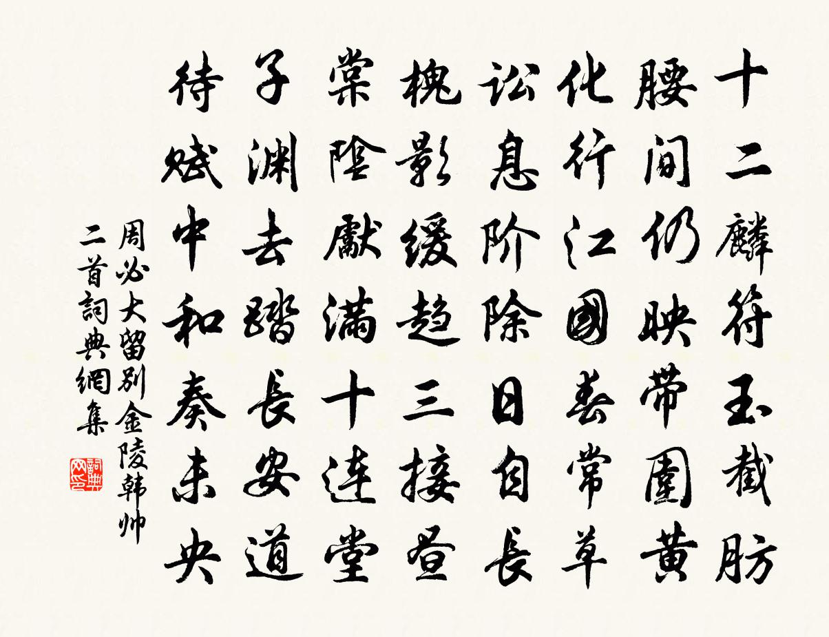 詩詞名句歷史字典書法欣賞書法字典國語詞典說文解字康熙字典古漢語字典標 題 作 者 詩 句 留別金陵韓帥二首作者:周必大 朝代:宋代留別金陵韓帥二首原文十二麟符玉截肪,腰間仍映帶圍黃。化行江國春常草,訟息階除日自長。槐影緩趨三接晝,棠陰先滿十連堂。子淵去踏長安道,待賦中和奏未央。詩詞問答問:留別金陵韓帥二首的作者是誰?答:周必大問:留別金陵韓帥二首寫於哪個朝代?答:宋代周必大留別金陵韓帥二首書法欣賞留別金陵韓帥二首書法作品詩詞推薦峽中春感寇準〔宋代〕二年窮峽外,不見帝城春。覽照知年老,逢花感恨頻。浮榮何足貴,幽別轉難伸。終憶歸清渭,林泉卜舊鄰。沁園春(紹興丁巳五月六夜,夢與一道人對歌數曲,遂成此詞)張元乾〔宋代〕神水華池,汞鉛凝結,虎龍往來。問子前午後,陽銷陰長,自然爐鼎,何用安排。靈寶玄門,煙蘿真境,三日庚生酴醾陳松龍〔宋代〕布葉敷條翠作圍,自生芒刺護裳衣。莫嫌野興難拘束,只伴春風亦見幾。丙申元日五絕方回〔宋代〕送寒迎暖柳梢知,風自東來著意吹。百萬人家賀新歲,幾家荼壘有新詩。送駕部俞員外良孺知江州宋祁〔宋代〕朝弁辭清曉,齋艎汎暮秋。官華飛雉省,地劇左魚州。湓水遙浮郭,天章近占樓。知君乘月夕,不淺是風流。先主廟次唐貞元中張儼詩韻陸游〔宋代〕吳蜀本唇齒,悲哉乃連兵。盡銳下三硤,誰使復兩京?聽僧彈琴貫休〔唐代〕家近吳王古戰城,海風終日打牆聲。今朝鄉思渾堆積,琴上聞師大蟹行。苕溪雜興四首蘇泂〔宋代〕美人樓上曉梳頭,人映清波波映樓。來往舟行看不足,此中風景勝揚州。葉濤致遠見和二詩,複次其韻蘇軾〔宋代〕聞公少已悟,拄杖久倚床。笑我老而痴,負鼓欲求亡。庶幾東門子,柱史安敢望。嗜毒戲猛獸,慮患先不詳。囊破寄尉遲侍御李昭象〔唐代〕我眠青嶂弄澄潭,君戴貂蟬白玉篸。應向謝公樓上望,九華山色在西南。送陸判官往琵琶峽李白〔唐代〕水國秋風夜,殊非遠別時。長安如夢裡,何日是歸期。八月三日即事白玉蟾〔宋代〕煙冷渾沾水,溪清可數魚。鴉翻千點墨,雁草數行書。今日征帆下,前年上國初。詩盟寒復講,無酒興何如。耍蛾兒王哲〔元代〕不會修行空養肚。腎肺心肝脾祖。五團臭肉怎為主。先把黃婆咄去。趕退青龍兼 * 。不用嬰兒奼女。諸公要覓長古意十四首章雲心〔宋代〕百川畢東注,兩丸盡西頹。二物常汲汲,未嘗少徘徊。短生亦如斯,逝者良可哀。自昔青雲士,皆為黃土堆。何如西岩勝水蔣晉〔宋代〕柘川之西有削石,屹立巍巍峻如壁。下有滄浪百尺深,澄清恰似秋天碧。逝者如斯竟不停,孺子長歌堪濯纓。故知木蘭花慢(壽秋壑)吳文英〔宋代〕記瓊林宴起,軟紅路、幾西風。想漢影千年,荊江萬頃,槎信長通。金狨。錦韉賜馬,又霜橫、漢節棗仍紅。細柳飲酒二十首同蘇翰林先生次韻追和陶淵明四晁補之〔宋代〕園林日夕好,花繁時鳥飛。少年玩芳物,不飲成坐悲。只今未白髮,念昔已依依。紛華戰吾道,決勝當有歸。挫銳和裴仲謀雨中自石塘歸黃庭堅〔宋代〕裴友西來詠古風,驅馳萬象筆端空。尚將物色留分我,遠近青山煙雨中。次韻俞子文感事朱長文〔唐代〕我曾折桂向蟾宮,君有文華似彩虹。連蹇未酬平日願,笑歌猶得故鄉同。不才甘作耕岩叟,有志宜為結駟翁。窮達凝露堂木犀惡人二首楊萬里〔宋代〕夢騎白鳳上青空,徑度銀河入月宮。身在廣寒香世界,覺來簾外木犀風。名句推薦北風其涼,雨雪其雱。佚名《北風》 大漠風塵日色昏,紅旗半卷出轅門。王昌齡《從軍行七首》 勞歌一曲解行舟,紅葉青山水急流。許渾《謝亭送別》 寂寂聞猿愁,行行見雲收李白《尋高鳳石門山中元丹丘》 少年俠氣,交結五都雄。賀鑄《六州歌頭·少年俠氣》 民之歸仁也,猶水之就下、獸之走壙也。孟子《孟子·離婁章句上·第九節》 金槳木蘭船,戲采江南蓮。劉孝威《採蓮曲·金槳木蘭船》 夫兵權者,是三軍之司命,主將之威勢。諸葛亮《將苑·卷一·兵權》 弱柳青槐拂地垂,佳氣紅塵暗天起。盧照鄰《長安古意》 楚鄉飛鳥沒,獨與碧雲還。錢起《送夏侯審校書東歸》