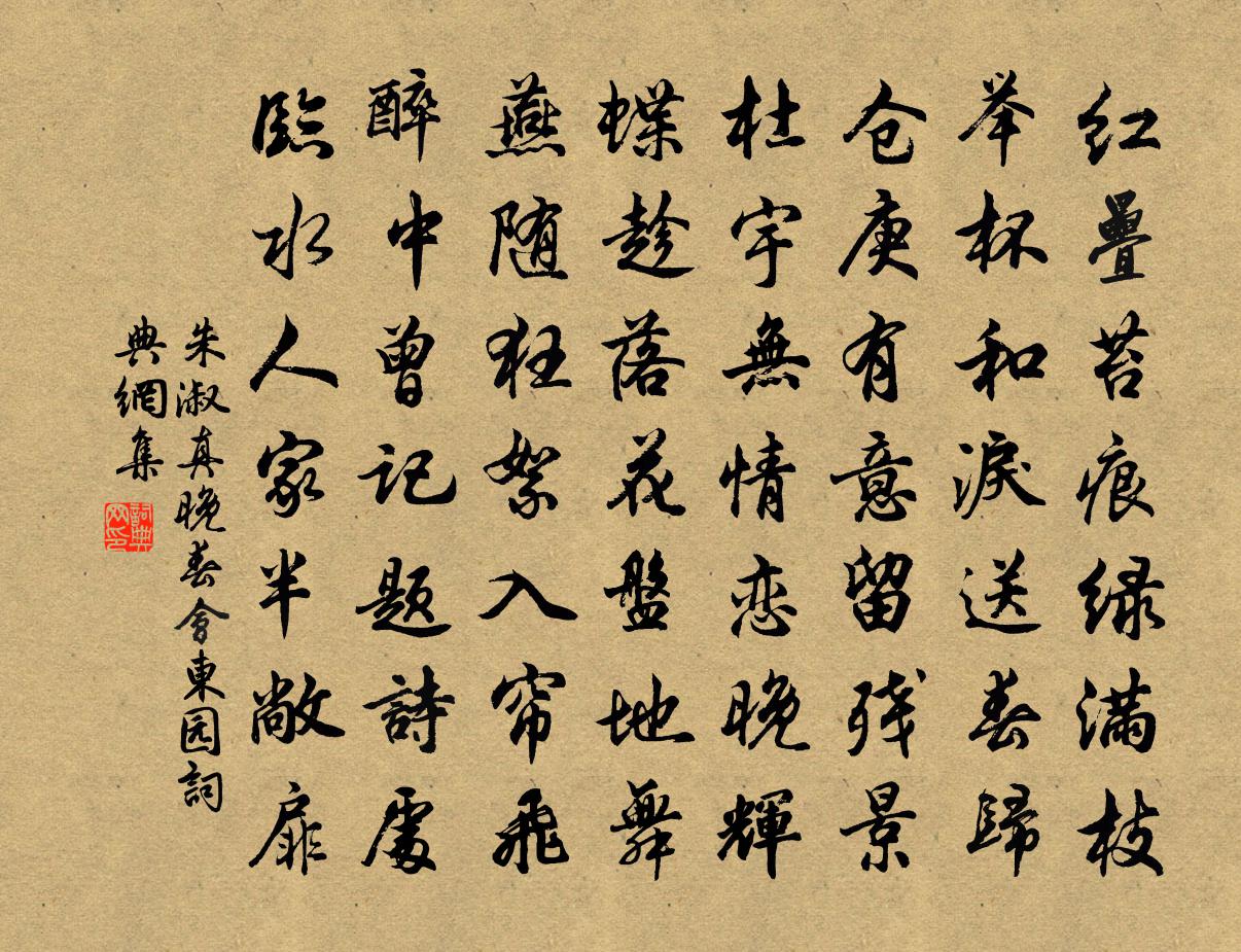 紅疊苔痕綠滿枝,舉杯和淚送春歸。倉庚有意留殘景,杜宇無情戀晚輝。