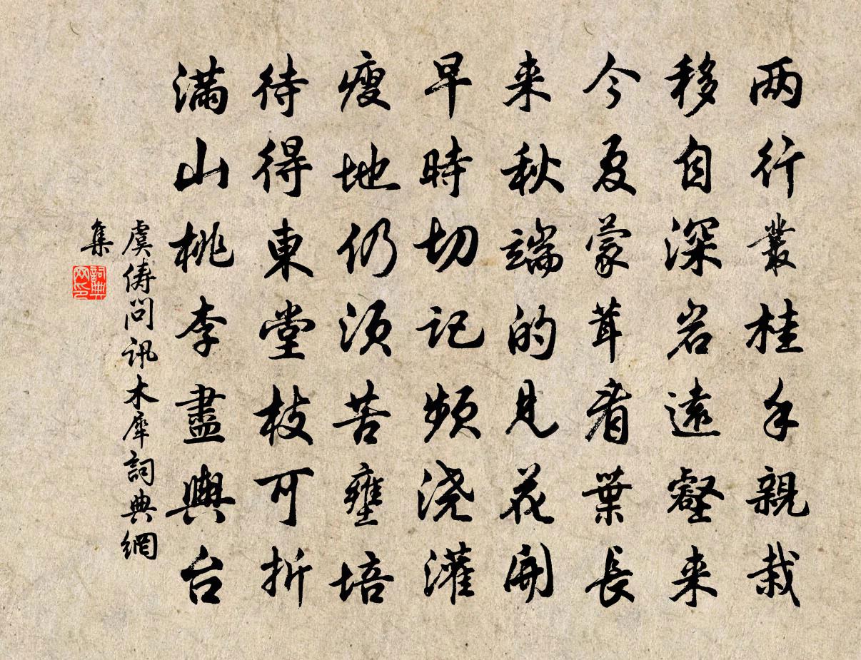 詩詞名句歷史字典書法欣賞書法字典國語詞典說文解字康熙字典古漢語字典標 題 作 者 詩 句 問訊木犀作者:虞儔 朝代:宋代問訊木犀原文兩行叢桂手親栽,移自深岩遠壑來。今夏蒙茸看葉長,來秋端的見花開。早時切記頻澆灌,瘦地仍須苦壅培。待得東堂枝可折,滿山桃李盡輿台。詩詞問答問:問訊木犀的作者是誰?答:虞儔問:問訊木犀寫於哪個朝代?答:宋代虞儔問訊木犀書法欣賞問訊木犀書法作品詩詞推薦南至日隔仗望含元殿爐香裴次元〔唐代〕冕旒初負扆,卉服盡朝天。暘谷初移日,金爐漸起煙。芬馨流遠近,散漫入貂蟬。霜仗凝逾白,朱欄映轉鮮。始看句趙必范〔宋代〕幸有漁樵同此樂,苦無車馬自如諠。請息齋書事范成大〔宋代〕覆雨翻雲轉手成,紛紛輕薄可憐生!天無寒暑無時令,人不炎涼不世情。栩栩算來俱蝶夢,喈喈能有幾雞鳴!冰山送耿山人歸湖南(一作送耿逸人南歸)周賀〔唐代〕南行隨越僧,別業幾池菱。兩鬢已垂白,五湖歸掛罾。夜濤鳴柵鎖,寒葦露船燈。去此應無事,卻來知不能。從軍詩五首·其二王粲〔兩漢〕涼風厲秋節,司典告詳刑。我君順時發,桓桓東南征。泛舟蓋長川,陳卒被隰埛。征夫懷親戚,誰能無戀情。拊衿歸自謠馮延巳〔唐代〕寒山碧,江上何人吹玉笛?扁舟遠送瀟湘客。蘆花千里霜月白,傷行色,來朝便是關山隔。江樓寫望釋文珦〔宋代〕晨登江上樓,周覽竟遐目。江天渺無際,清致如可匊。初日明遠峰,微煙消廣麓。平波淨如鏡,群象印寒淥。浦漵和如祖弟二首李處權〔宋代〕綠樹黃鸝陰復晴,春風何處不堪行。野煙著草錦錦色,江日浮花灩灩明。故國音書添夢想,異鄉節物減心情。逢人染絲上春機許玠〔宋代〕錦江之水來蜀西,女紅染絲上春機。可憐欲織未織時,思君意緒如亂絲。亂絲尚可理,妾愁渺無際。寒窗軋軋千萬太常樂章三十首其十一皇帝飲福酒奏禧安之曲楊億〔宋代〕嘉栗旨酒,博腯牲牷。神鑒孔昭,享茲吉蠲。夙夜毖祀,孝以奉先。永錫純嘏,功格於天。唐昌觀玉蕊花折有仙人游,悵然成二絕嚴休復〔唐代〕終日齋心禱玉宸,魂銷目斷未逢真。不如滿樹瓊瑤蕊,笑對藏花洞裡人。羽車潛下 * 山,塵世何由睹蕣顏。唯有菩薩蠻(江乾)王炎〔宋代〕遠風江急潮來晚。晚來潮急江風遠。橫岸斷山青。青山斷岸橫。寄書無雁系。系雁無書寄。歸夢只江西。西江只夢漁家傲(次丹陽憶故人)毛並〔宋代〕楊子津頭風色暮。孤舟渺渺江南去。憶得佳人臨別處。愁返顧。青山幾點斜陽樹。可忍歸期無定據。天涯已聽邊鴻逢故人杜牧〔唐代〕故交相見稀,相見倍依依。塵路事不盡,雲岩閒好歸。投人銷壯志,徇俗變真機。又落他鄉淚,風前一滿衣。瑞鷓鴣(京口有懷山中故人)辛棄疾〔宋代〕暮年不賦短長詞。和得淵明數首詩。君自不歸歸甚易,今猶未足足何時。偷閒定向山中老,此意須教鶴輩知。聞道送趙富文粹洪州三首周必大〔宋代〕南浦飛雲繞棟桴,西山爽氣入魚須。公庭吏散文書靜,許我他時解榻無。楊白花舒岳祥〔宋代〕楊白花,懊惱隨風渡江水。將心莫托少年郎,少年一去輕萬里。楊條插地便生根,花性飄揚似夢塵。恨不築城高萬元豐癸亥秋季赴官郴嶺艤舟樊口與潘彥明範亨張舜民〔宋代〕江上秋風九日寒,故人樽酒暫相歡。如何塞北無窮雪,卻坐樊山竹萬竿。晚春客愁五絕方回〔宋代〕十載干戈後,辛勤蒔牡丹。豈知身是客,借與別人看。四月二十七日與王正仲飲梅堯臣〔宋代〕我來自楚君自吳,相遇泛波銜舳艫。時時舉酒共笑樂,莫問罌盎有與無。醉憶曩同吾永叔,倒冠落佩來西都。是時名句推薦獨上小摟春欲暮,愁望玉關芳草路。韋莊《木蘭花·獨上小樓春欲暮》 大樹無枝向北風,十年遺恨泣英雄。高啟《吊岳王墓》 天明登前途,獨與老翁別。杜甫《石壕吏》 江心雲帶蒲帆重,樓上風吹粉淚香。嚴仁《鷓鴣天·惜別》 任賢勿貳,去邪勿疑。佚名《尚書·虞書·大禹謨》 洞庭葉未下,瀟湘秋欲生徐禎卿《在武昌作》 遮莫圓明似前度,不知誰續廣寒游。慧霖《閏中秋玩月》 可憐今夜月,不肯下西廂。王庭筠《絕句·竹影和詩瘦》 巴山重疊相逢處。燕子占巢花脫樹。張先《漁家傲·和程公辟贈》 天下者非一人之天下,唯有道者處之。姜子牙《六韜·武韜·順啟》