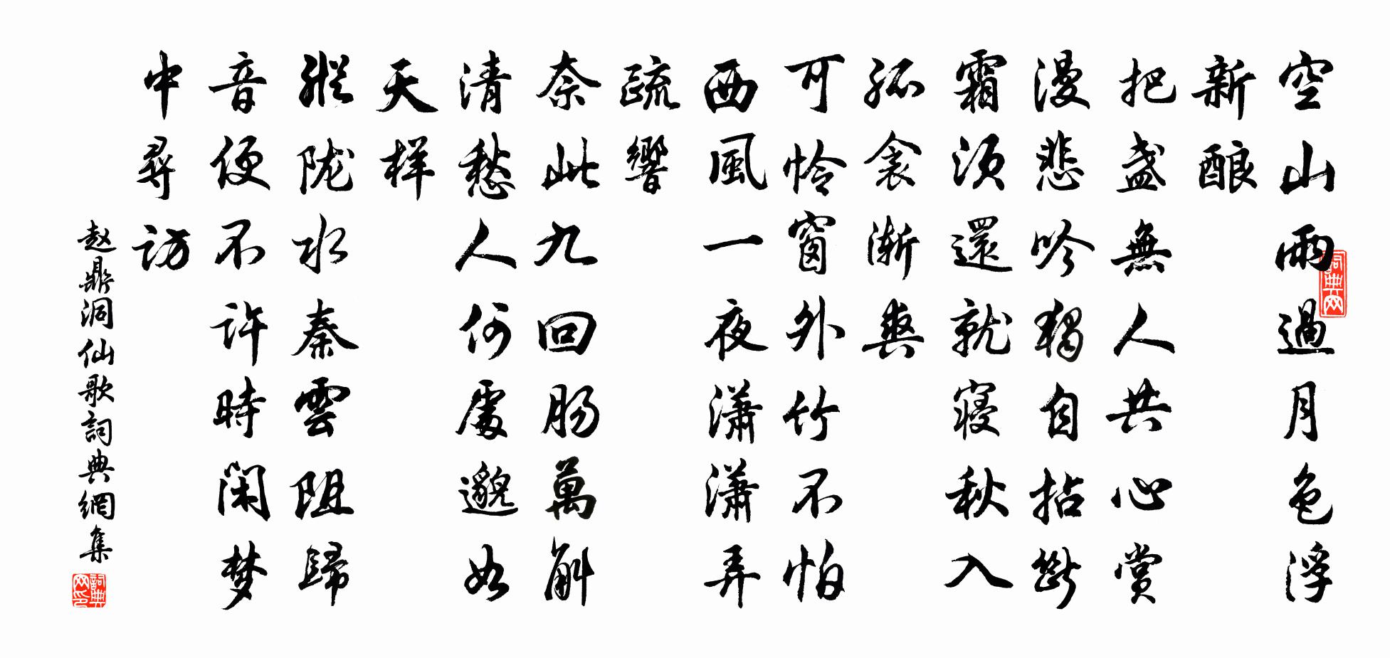 此詞不以剪裁巧妙取勝,而以描寫深刻細膩見長。全詩基本上採用了賦的寫法,敘述與描寫的成分占很大的比重。首先是按時間順序從空山雨過,獨飲無緒,悲吟斷須,孤衾獨臥,一直寫到夜闌不寐,聞風吹竹,一懷愁緒,夢尋舊鄉。這樣詞人寫出了一個淒涼人難度淒涼夜的全過程,真實感人。其次是描寫頗有層次,上片全是行動描寫,下片先是景物描寫,後是心理描寫,描寫層層深入,而且每一種描寫都作了精細的刻畫。如月色、杯影反襯無人與之共賞良辰美景,以拈斷霜須表明悲吟的深切,以“萬斛清愁”形容愁恨之多,以“邈如天樣”以形容朝廷之遠,以“隴水秦檜”暗指秦檜一類掌權奸臣等等。正因為有這些精細的刻畫,此詞才避免了一般用鋪敘法寫成的作品容易犯的平鋪直敘、平淡無味的毛病,它同樣是那樣鮮明、輕巧、含吐不露。