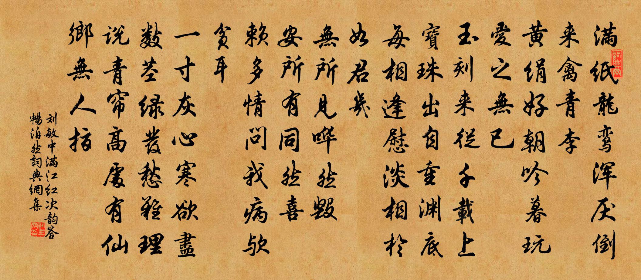 詩詞名句歷史字典書法欣賞書法字典國語詞典說文解字康熙字典古漢語字典標 題 作 者 詩 句 滿江紅 次韻答暢泊然作者:劉敏中 朝代:元代滿江紅 次韻答暢泊然原文滿紙龍鸞,渾厭倒、來禽青李。黃絹好、朝吟暮玩,愛之無已。玉刻來從千載上,寶珠出自重淵底。每相逢慰淡相於,如君幾。無所見,譁然毀。安所有,同然喜。賴多情問我,病歟貧耳。一寸灰心寒欲盡,數莖綠髮愁難理。說青簾高處有仙鄉,無人指。詩詞問答問:滿江紅 次韻答暢泊然的作者是誰?答:劉敏中問:滿江紅 次韻答暢泊然寫於哪個朝代?答:元代問:滿江紅 次韻答暢泊然是什麼體裁?答:詞劉敏中滿江紅 次韻答暢泊然書法欣賞滿江紅 次韻答暢泊然書法作品詩詞推薦金盞子(四時懷古秋詞)陳著〔宋代〕眼底時光,奈老來、如何奈得秋何。黃葉最多情,天分付、涼意一聲先做。是處著露莎蛩,也酸吟相和。新雁想,題壁老笑庵樓鑰〔宋代〕笑甚底,笑甚底,若要笑時笑殺你。說夢夢中,洗泥泥里。頭上安頭,以水濟水。個個一般,滔滔皆是。我也要笑送李四清吳可〔宋代〕連侯愛畫魚,李侯愛畫山。詩情動幽懷,摹寫不少閒。騷雅移丹青,妙寄雲水間。翻然欲登涉,試尋芷與蘭。我不次韻陳叔易三首李處權〔宋代〕草碧波復綠,南浦愁送君。君行將何之,愴指南北雲。相思無早晚,生離無近遠。悠悠關塞阻,杳杳音信斷。青燈眉僧曉岑仆未之識也持缽求施既辭以貧則願丐馮時行〔宋代〕門前剝啄遺兒應,客是平生不識僧。檀施咄嗟貧未可,詞場馳逐老猶能。識凌風月收孤思,乞與雲山伴曲肱。我亦成都杜五一府君之葬某新有喪不得為文以侑虞魏了翁〔宋代〕尚記維川死,今年又哭公。琴聲辭夜月,書葉臥春風。兒女數行淚,親朋十九空。我翁方念母,忍淚課兒沖。春日山居好十首舒岳祥〔宋代〕春日山居好,柴門愛客過。連朝恣泥飲,隨意有山歌。句小從人學,才衰覺氣和。情懷依分足,好景不須多。集杜工部句詠寒亭杜汪〔宋代〕湖南清絕地,長夏想為情。六月風日冷,炎天冰雪生。蓬萊如可到,心跡喜雙清。去郭軒楹敞,幽居不用名。台州郡治十二詩太守尤延之命賦匿峰亭林憲〔宋代〕千嶺隨指顧,一峰不可匿。如何超逸士,勘破造化跡。隱然胸中奇,盤礴岩煙碧。夜半秋月寒,人境俱峻極。宿錢塘尉廨黃庭堅〔宋代〕平湖繞舍山無盜,官事長閒俸有金。安得終身為禦寇,不辭兒女作吳音。燕余寄月窗兄三首陳著〔宋代〕葉葉征衫來自東,相逢笑語竹窗中。傍人底死催人去,細雨吹涼一夜風。李太尉文同〔宋代〕昏雺翳紫極,橫霓勢光大。妖威集凶冀,忍穢實中賴。奸鋩日增剡,誰汝觸取害。驕根愈自固,所植利孱昧。容容水調歌頭劉辰翁〔宋代〕此夕酹江月,猶記濯纓秋。濯纓又去如水,安得主人留。舊日登樓長笑,此日新亭對泣,禿鬢冷颼颼。木落下極浦紙鳶顧逢〔宋代〕只是憑風力,飛騰自不知。轉來高處去,肯顧此身危。雲外搖雙翼,空中寄一絲。每愁吹斷後,欲覓意何之。燭蛾誡釋智圓〔宋代〕有蟲名燭蛾,翱翔近燈光。舉手再三遮,彼意終不可。驅去復飛來,防護更勞我。汝無縱所見,自取燋肌禍。水口行舟二首朱熹〔宋代〕昨夜扁舟雨一蓑,滿江風浪夜如何?今朝試卷孤篷看,依舊青山綠樹多。鬱郁層巒夾岸青,春山綠水去無聲。煙波奉和魯望樵人十詠樵歌皮日休〔唐代〕此曲太古音,由來無管奏。多雲采樵樂,或說林泉候。一唱凝閒雲,再謠悲顧獸。若遇采詩人,無辭收鄙陋。歸來 其二王冕〔元代〕某水某丘在,杖藜隨處行。窮幽那適興,豈是未忘情?契彼漁樵樂,於吾勢利輕。雲根老梅樹,花發最分明。出火祀大辰十二首佚名〔宋代〕[圜鍾為宮]燁燁我宋,火德所畏。用火紀時,允惟象類。神以類歆,誠孫類全。有感斯通,孚我陽燧。和穆父新涼蘇軾〔宋代〕晁子拙生事,舉家聞食粥。朝來又絕倒,諛墓得霜竹。可憐先生盤,朝日照苜蓿。吾詩固云爾,可使食無肉。名句推薦春還草閣梅先動,月滿虛庭雪未消。王守仁《元夕二首》 天道之數,至則反,盛則衰。管仲《管子·重令》 落花有淚因風雨,啼鳥無情自古今。屈大均《壬戌清明作》 苦心中常得悅心之趣;得意時便一失意之悲。洪應明《菜根譚·概論》 知音如不賞,歸臥故山秋。賈島《題詩後》 水流花謝兩無情,送盡東風過楚城。崔塗《春夕》 慘慘時節盡,蘭葉復凋零。徐幹《室思》 可憐閨里月,長在漢家營。沈佺期《雜詩三首·其三》 桂林之一枝,崑山之片玉。房玄齡《晉書·列傳·第二十二章》 晚鴉飛去,一枝花影送黃昏夏完淳《婆羅門引·春盡夜》