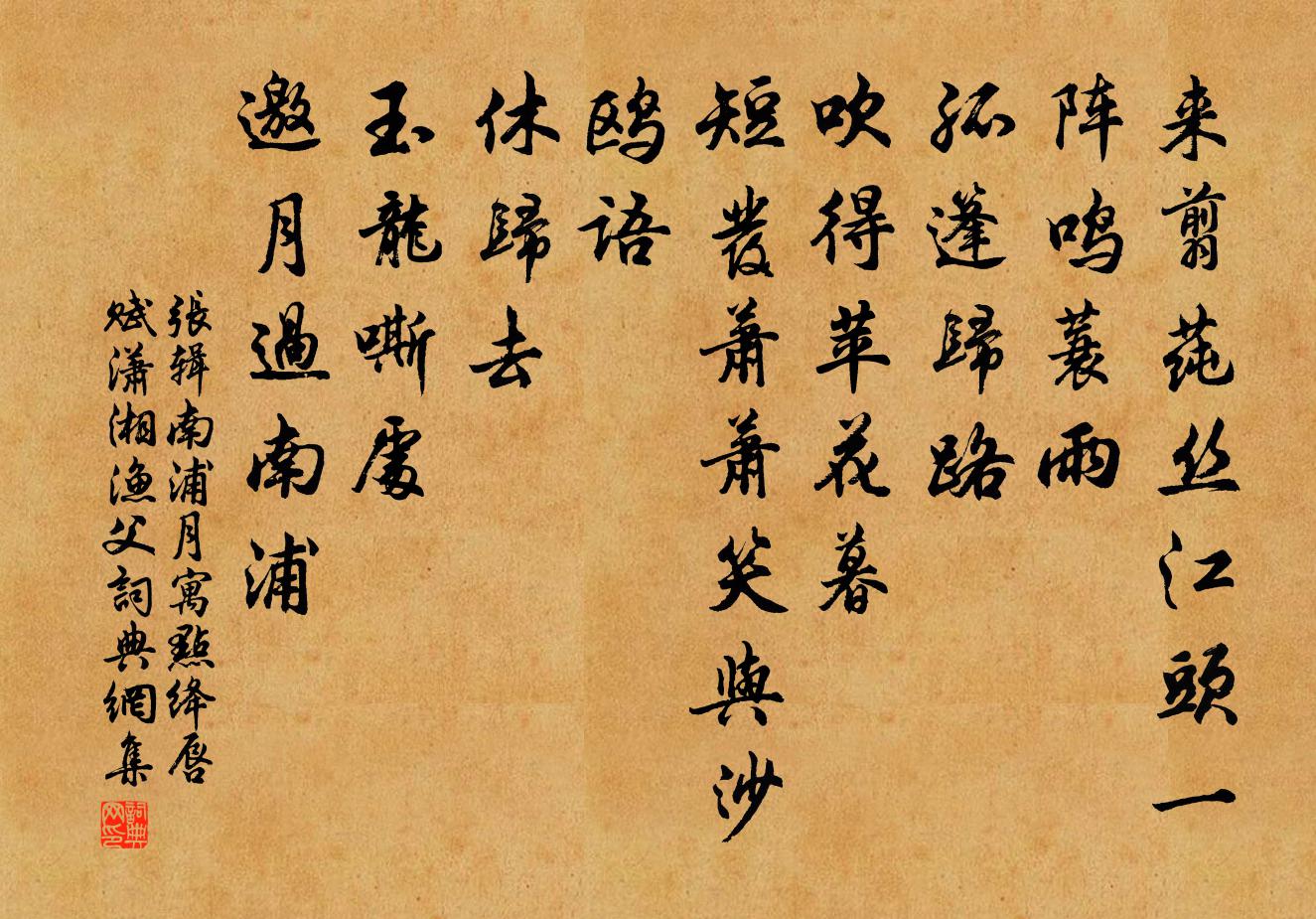 詩詞名句歷史字典書法欣賞書法字典國語詞典說文解字康熙字典古漢語字典標 題 作 者 詩 句 南浦月(寓點絳唇賦瀟湘漁父)作者:張輯 朝代:宋代原文來翦蓴絲,江頭一陣鳴蓑雨。孤篷歸路。吹得苹花暮。短髮蕭蕭,笑與沙鷗語。休歸去。玉龍嘶處。邀月過南浦。詩詞問答問:《南浦月(寓點絳唇賦瀟湘漁父)》的作者是誰?答:張輯問:該詩寫於哪個朝代?答:宋代問:該詩是什麼體裁?答:詞書法欣賞南浦月(寓點絳唇賦瀟湘漁父)書法作品詩詞推薦有感陳普〔宋代〕益州桑柘雨,莘野稻梁秋。功業髯秋兔,行藏汗萬牛。春日途中五首項安世〔宋代〕湖海今年最倦遊,春來新上浙西舟。天寒歲暮錢清路,又踏嚴州向婺州。春夜感物書懷曾豐〔宋代〕閣閣蛙鳴夜,嘈嘈鳥語春。物情猶任理,世事豈由人。時自有遲速,道初無屈伸。聖賢得貧力,吾恨不全貧。用韻詠雪簡湘中諸友陳傅良〔宋代〕夾湘而住一塵無,不在瑤池在石渠。氣蓋松篁誰與競,今行螟蟘自相屠。山光際水天無間,夜色通朝月不如。中有二十四日一日作十詩季承同之既罷復書四十字趙蕃〔宋代〕米盡不憂飢,行行且賦詩。相看一大笑,從謂兩真痴。未用追元白,聊須效陸皮。流傳君不愧,附益我奚為。酬贈王益舜良殿丞梅摯〔宋代〕風度幽間識宇高,暫分明寄握牛刀。賈生學贍思儀漢,李白才多合繼騷。步武即看峨豸角,對揚幾見擲麟毫。琴齋廬山雪王世懋〔明代〕朝日照積雪,廬山如白雲。始知靈境杳,不與眾山群。樹色空中斷,泉聲天半聞。千崖冰玉里,何處著匡君。 次韻葉碩夫南歸見貽二首李彌遜〔宋代〕飛花無數上衣裾,孤悶須憑酒破除。翻手作雲傷往事,轉頭如夢欲捐書。但知甘苦同薇蕨,不問辛勤有屋廬。後日句薛紹彭〔宋代〕山水三更月,煙中一葉舟。仲夏齋居,偶題八韻,寄微之及崔湖州白居易〔唐代〕腥血與葷蔬,停來一月餘。肌膚雖瘦損,方寸任清虛。體適通宵坐,頭慵隔日梳。眼前無俗物,身外即僧居。水榭臨水黃亢〔宋代〕人生朝復暮,水波流不駐。去年昨日水,今日到何處。惆悵雨殘花,嫣紅隨水去。花落水東流,識盡人生事。閒居洪咨夔〔宋代〕暑設青練幕,晴更皂葛巾。家貧猶氣象,人老亦精神。蜂鬧花生計,蛾翾繭化身。靜中觀物變,同是一天真。宿多景樓奉簡吳總侍方岳〔宋代〕客懷孤倚夕陽樓,煙老平蕪岸岸秋。往事六朝南北史,晴江一片古今愁。慨其嘆矣山吞吐,何以酬之酒拍浮。此意寓舍遭雨漏甚趙蕃〔宋代〕無計補天漏,寧關以瓦為。晝居衣數燎,宵臥枕頻移。慣悶長憑酒,窮愁更有詩。何須僂句問,可向穴居知。送友人及第歸蘇州顧非熊〔唐代〕見君先得意,希我命還通。不道才堪並,多緣蹇共同。鶴鳴荒苑內,魚躍夜潮中。若問家山路,知連震 * 。湖州崔郎中曹長寄三癖詩自言癖在詩與琴酒…四韻以謝之劉禹錫〔唐代〕視事畫屏中,自稱三癖翁。管弦泛春渚,旌旆拂晴虹。酒對青山月,琴韻白蘋風。會書團扇上,知君文字工。沁園春(壽)黃機〔宋代〕問訊梅梢,小春近也,花應漸開。記華堂此日,紅牙絲竹,歡聲昨夜,翠玉樽罍。霧節童童,金旓曳曳,人自閬風留題雲門山雍熙院錢惟演〔宋代〕精舍依岩巘,香林結薜蘿。崇台涵夕靄,危閣架春波。淨饌供蒲塞,真詮譯貝多。幾時輝晝錦,松下駐鳴珂。偈頌二十二首釋道生〔宋代〕三月既望,惠風和暢。龜峰擂鼓升堂,雲集五湖龍象。人人鼻孔遼天,好個西來榜樣。春晚郊行吳龍翰〔宋代〕芒鞋竹杖出柴關,檢點園林腳不閒。翠幄初張花結局,錦繃未解筍排班。煙波鷗鷺春風外,桑柘牛羊夕照間。野興名句推薦權者,人莫離也。來俊臣《羅織經·控權卷第四》 禍與福同門,利與害同城。佚名《增廣賢文·下集》 無功不賞,無罪不罰。荀子《荀子·王制》 風也蕭蕭,雨也蕭蕭,瘦盡燈花又一宵。納蘭性德《採桑子·誰翻樂府淒涼曲》 待到黃昏月上時,依舊柔腸斷。程垓《卜運算元·獨自上層樓》 庭花蒙蒙水泠泠,小兒啼索樹上鶯。貫休《春晚書山家屋壁二首》 崑崙之高有積雪,蓬萊之遠常遺寒。王令《暑旱苦熱》 秋來相顧尚飄蓬,未就丹砂愧葛洪。杜甫《贈李白》 恨人間、會少離多,萬古千秋今夕。張埜《奪錦標·七夕》 一道殘陽鋪水中,半江瑟瑟半江紅。白居易《暮江吟》