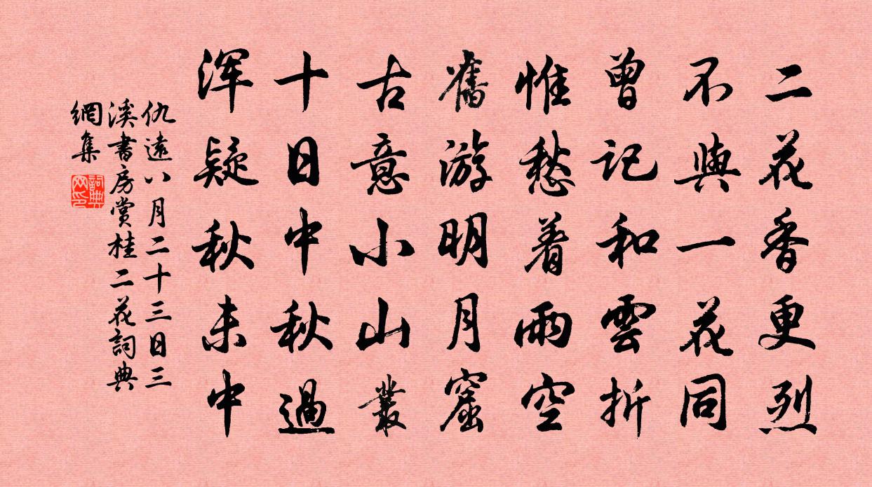 詩詞名句歷史字典書法欣賞書法字典國語詞典說文解字康熙字典古漢語字典標 題 作 者 詩 句 八月二十三日三溪書房賞桂二花作者:仇遠 朝代:宋代原文二花香更烈,不與一花同。曾記和雲折,惟愁著雨空。舊遊明月窟,古意小山叢。十日中秋過,渾疑秋未中。詩詞問答問:《八月二十三日三溪書房賞桂二花》的作者是誰?答:仇遠問:該詩寫於哪個朝代?答:宋代書法欣賞八月二十三日三溪書房賞桂二花書法作品詩詞推薦雪中呈范景仁侍郎蘇轍〔宋代〕羈游亦何樂,幸此賢主人。東齋暖且深,高眠不知晨。開門驚照曜,舞雪方繽紛。繁雲覆庭廡,落勢一何勻。霏霺和林守玉茗花韻趙汝鐩〔宋代〕澆花惟要早,芟草不知名。新竹生來巧,南牆補數莖。西江月(同蔡受之、趙中甫巡城,飲於南楚樓)趙師俠〔宋代〕淼淼澄清波面,依依紫翠山光。危欄徙倚對斜陽。山影波流蕩漾。世事一番醒醉,人生幾度炎涼。高情收拾付觥觴失題曾國藩〔清代〕西山一夜雨,秋氣入庭除。清晨展書坐,翛然樂有餘。天宇一何廓,蕩蕩真吾廬。熇熇誇毗子,奪隘無曠居。眾鱗官舍竹王禹偁〔宋代〕誰種蕭蕭數百竿,伴吟偏稱作閒官。不隨夭艷爭春色,獨守孤貞待歲寒。聲拂琴床生雅趣,影侵棋局助清歡。明年秦樓月(次韻陳子象)韓元吉〔宋代〕鶯聲寂。春風欲去難蹤跡。難蹤跡。幾枝紅葉,萬金消得。青銅鏡里朱闌側。照人也似傾城色。傾城色。一尊莫負卜運算元·賞荷以蓮葉勸酒作葛立方〔宋代〕明鏡蓋紅蕖,軒戶臨煙渚。窣窣珠簾淡淡風,香里開尊俎。莫把碧筒彎,恐帶荷心苦。喚我溪邊太乙舟,瀲灩盛芳中酒宋白〔宋代〕中酒事俱妨,偷眠就黑房。靜嫌鸚鵡鬧,渴憶荔枝香。病與慵相續,心和夢尚狂。從今改題品,不號醉為鄉。題樂天居士詩集後時謫居廬山汪大猷〔宋代〕居士當年謫九江,高懷往往萬篇音。多言世上風波惡,不似閒中氣味長。千載聲名雖莫及,一時蹤跡偶相望。若容春社日置酒示客宋庠〔宋代〕欣欣春色上高台,一雨關河宿霧開。洛浦宓妃鴻已去,漢家皇后燕初來。山爐馥郁熏歌扇,錦瑟丁寧侑客杯。秉燭七里灘四錫〔宋代〕清泚寒流走白沙,釣台蒼翠遠嵯峨。隔谿人語穿芳樹,旁岸魚跳落淺莎。幾處上源堪涉渡,有時野艇並來過。秋聲和此陽先生感興詩二十首劉黻〔宋代〕智巧役一世,往往悲古愚。觸蠻榮利場,白日事浮虛。情流失固有,意騖希本無。相與龍斷登,獨不捷徑趨。是非如歸亭葉綱〔宋代〕拍天煙浪接滄溟,識盡歸舟是此亭。風遞秋香來橘社,水資春味驗茶經。捲簾江樹差差綠,入坐湖山隱隱青。魯望扇子詩李石〔宋代〕山陰五月雪芬芳,猛火叢中雪放光。比似瑞花成六出,夜深更與佛燒香。平原郡王南園詩二十一首多稼姜特立〔宋代〕富貴多為居養移,田家作苦記農時。亭名多稼非無意,後代兒孫卻要知。喜閒趙善傅〔宋代〕向晚幽棲地,襟懷頗自宜。品題風與月,驅使酒兼詩。供興千岩竹,應門一局棋。此中無俗慮,高臥復何之。偈頌九十三首釋梵琮〔宋代〕春雪消,春水足。春風吹起洞天雲,落梅點破蒼 * 。言發非聲,色前不物。耗電量頭露眼睛,虛空里揣出骨。林題研六言四首劉克莊〔宋代〕其面固已晬然,其背貴不可言。寧捧以供李白,勿舉以擲鄭畋。賀生子索杯王大烈〔宋代〕小童門外走雙壺,知是君家毓掌珠。前語果然符老蚌,這番不可學乾烏。且將詩句為君問,還有婆杯惠我無。莫怪送潤州通判李屯田梅堯臣〔宋代〕過江始與風沙隔,京口山連北固牢。刺史丰儀於體重,邦人全伏以名高。宴盤紫蟹方多味,古寺青林不厭遨。定挈名句推薦烏絲闌紙嬌紅篆,歷歷春星。納蘭性德《紅窗月·燕歸花謝》 得時無怠,時不再來,天予不取,反為之災。左丘明《國語·越語·越興師伐吳而弗與戰》 生死有命,富貴在天。佚名《增廣賢文·上集》 行行無別語,只道早還鄉。袁凱《京師得家書》 塞雁高飛人未還,一簾風月閒。李煜《長相思·一重山》 寂歷秋江漁火稀,起看殘月映林微。湯顯祖《江宿》 日星隱曜,山嶽潛形;范仲淹《岳陽樓記》 百川東到海,何時復西歸?佚名《長歌行》 君子不器。孔子弟子《論語·為政篇》 黃河怒浪連天來,大響谹谹如殷雷。溫庭筠《拂舞詞 / 公無渡河》
