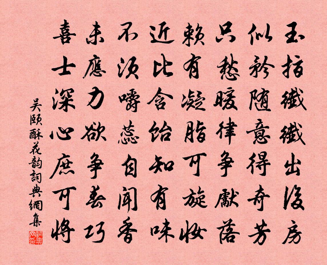 詩詞名句歷史字典書法欣賞書法字典國語詞典說文解字康熙字典古漢語字典標 題 作 者 詩 句 酥花韻作者:吳頤 朝代:宋代酥花韻原文玉指纖纖出後房,似矜隨意得奇芳。只愁暖律爭先落,賴有凝脂可旋妝。近比含飴知有味,不須嚼蕊自聞香。未應力欲爭春巧,喜士深心庶可將。詩詞問答問:酥花韻的作者是誰?答:吳頤問:酥花韻寫於哪個朝代?答:宋代吳頤酥花韻書法欣賞酥花韻書法作品詩詞推薦吳公惠酒因謝文同〔宋代〕山城物色正嚴冬,梅放長梢露小紅。破萼未深聊敵雪,收香不密任隨風。盡教插滿金釵上,休管吹殘玉笛中。須至歸近趙蕃〔宋代〕黃溪潭上晚風生,吹我孤舟直又橫。歸近尚餘三十里,不妨待得月同行。韓乾畫馬闕四足龍眠榻而全之劉子翬〔宋代〕吾聞兩臂天下重,馬失四蹄將底用。平生想似萬里游,對此惟心惻然動。得非曾落駑駘群,踠脫泥塗良已勤。又疑東宮壽詩范成大〔宋代〕甲觀秋彌月,前星蚤麗天。君親重慶日,家國中興年。英武神機遠,溫文德宇全。攡章森曲則,會道極高堅。儉寶題碧蘚亭陳舜俞〔宋代〕瀟灑闌乾碧玉叢,頻來游賞似兒童。縈迴修竹撩清影,刻畫新詩繞翠筒。十載雪霜林色改,幾翻風月酒尊空。子猷郴江百詠並序南塔寺阮閱〔宋代〕江岸南峰對石城,僧房高在亂雲層。台前天闊秋多月,塔上風微夜有燈。江樓秋夕真山民〔宋代〕樓高古城繞,無奈漏聲催。幽夢風吹斷,新吟月送來。江長漁唱遠,雲冷雁聲哀。明日重陽酒,黃花開未開。瀑布六首孔武仲〔宋代〕懸崖傾注自成川,六月溪風為肅然。不是化工移用巧,尾閭應亦有窮年。客至陸游〔宋代〕何處軒車客,能來桑麥村?一奴先入市,此老自應門。野果嘗皆澀,村醅厭尚渾。殘年亦何恨,治世作黎元。四方觀練深心訣晃逈〔宋代〕性之生情,為夢為想。性之生緣,如影如響。不有古聖,愚將安仰。不有妙道,愚將安倣。爰得智刃,決開疑網。頌十玄談祖意釋印肅〔宋代〕殷勤為說西來意,得意忘言真不二。昨夜三更穿市過,只聞米賤油鹽貴。聞舊曲一首蘇籀〔宋代〕短舞長謳撩性情,狗翻砑鼓醉承平。六么花下西湖集,三疊雲凝玉塞聾。治世之音豈淪謝,淫哇已極返和清。關雎過昭君村賦詩李壁〔宋代〕王嬙南郡良家子,靚飾丰容照江水。何人引入光明宮,綠鬢雲鬟朝暮理。增成亦擬備充依,反向陰山嫁胡兒。陰山壽春節進貫休〔唐代〕聖運關天紀,龍飛古帝基。振搖三蜀地,聳發萬年枝。出震同中古,承乾動四夷。恩頒新命廣,淚向舊朝垂。大寶塞下曲二首曹勛〔宋代〕天聲未暢威窮髮,將軍已過和城窟。紅旗半卷夜歸來,馬蹄踏碎天山月。好事近(詠梅)陳亮〔宋代〕的皪兩三枝,點破暮煙蒼碧。好在屋檐斜入,傍玉奴橫笛。月華如水過林塘,花陰弄苔石。欲向夢中飛蝶,恐幽香讀晁錯傳許氏〔宋代〕匣劍未磨晁錯血,已聞刺客殺袁絲。到頭昧卻人心處,便是欺他天道時。痛矣一言偷害正,戮之萬段始為宜。鄧公雜詠一百首木蘭劉克莊〔宋代〕出塞男兒勇,還鄉女子身。尚能吞北虜,斷不慕西鄰。安國寺贈廣宣上人雍陶〔唐代〕馬急人忙塵路喧,幾從朝出到黃昏。今來合掌聽師語,一似敲冰清耳根。再和孫應時〔宋代〕文章富貴自兩事,脫欲其全天定慳。平生蕭瑟也不惡,未妨詩賦動江關。名句推薦柳花深巷午雞聲,桑葉尖新綠未成。范成大《春日田園雜興》 待人寬一分是福,利人實利己的根基。洪應明《菜根譚·概論》 居善地,心善淵,與善仁,言善信,政善治,事善能,動善時。夫唯不爭,故無尤。老子《老子·道經·第八章》 天有其時,地有其財,人有其治,夫是之謂能參。荀子《荀子·天論》 常恐秋風早,飄零君不知。盧照鄰《曲池荷》 丈夫貧賤應未足,今日相逢無酒錢。高適《別董大二首》 夫禮之初,始諸飲食戴聖《禮記·禮運》 嘆江山如故,千村寥落。岳飛《滿江紅·登黃鶴樓有感》 走馬西來欲到天,辭家見月兩回圓。岑參《磧中作》 君子坦蕩蕩,小人長戚戚。孔子弟子《論語·述而篇》