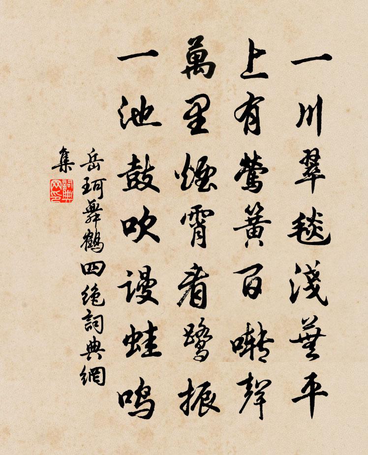 詩詞名句歷史字典書法欣賞書法字典國語詞典說文解字康熙字典古漢語字典標 題 作 者 詩 句 舞鶴四絕作者:岳珂 朝代:宋代舞鶴四絕原文一川翠毯淺蕪平,上有鶯簧百囀聲。萬里煙霄看鷺振,一池鼓吹謾蛙鳴。詩詞問答問:舞鶴四絕的作者是誰?答:岳珂問:舞鶴四絕寫於哪個朝代?答:宋代岳珂舞鶴四絕書法欣賞舞鶴四絕書法作品詩詞推薦林氏庵呈周練師林景英〔宋代〕遙跨青田鶴,翩翩到此來。庭生自家草,山有主人梅。掃石夜朝斗,雨田秋起雷。誰知塵影裹,清趣似蓬萊。座中詠蟬分韻得飢字吳龍翰〔宋代〕兩翼才乾殻已離,便升喬木最高枝。銀床落葉秋風裡,金掌盤敧曉露時。斷續翻成無調曲,悲涼做出苦吟詩。前身傷始平李少府正己褚亮〔唐代〕勞息本相循,悲歡理自均。誰能免玄夜,惜爾正青春。邁德惟家寶,生才諒國珍。高文綴翡翠,茂學掩麒麟。述作中秋復書趙蕃〔宋代〕涼生愁輾轉,月上照鬅鬙。林壑故對此,溪山逢未曾。吟哀蛩伴苦,書絕雁無憑。更欲留危坐,枝梧殆不勝。高塘橋高衡孫〔宋代〕碧荷色猶懶,紫花香漸多。過橋通故里,分界入新河。土潤何功治,沙平不用磨。衣冠今已矣,從此想鳴珂。臨江郡齋邀涼亭分韻得居字彭龜年〔宋代〕子猷猶愛竹,愛竹意已疏。著腳踏危機,肉相元未除。要識竹情性,顧我求其初。是中儻虛明,處處我與居。公侯寒食前一日行部過牛首山七首楊萬里〔宋代〕帛山恨骨已寒灰,盡禁廚煙肯更回。老病不禁餿食冷,杏花餳粥湯將來。村舍雜書陸游〔宋代〕我居大澤中,一舟不可無。短篷挾兩槳,疾若波中鳧。來往菰蘆村,按行瓜芋區。浮家亦可樂,何必愛吾廬。即事四首王炎〔宋代〕半日肩輿走,歸來已薾然。倦談懸麈尾,清坐炷龍涎。有累緣餬口,何時可息肩。靈襟要淘洗,盥手閱韋編。持國遺食梅堯臣〔宋代〕乞食非為貧,妻病妾且死。晨爨不暖釜,朝飯亦輟匕。遺我我所恤,食我我所恥。我恥曾我求,我恤寧我止。應乏過長河堰朱南傑〔宋代〕帆指長河風力微,漁舟個個有魚歸。一聲水際笛三弄,幾處梅邊竹四圍。桑伐遠揚蠶事熟,花消濃艷柳綿飛。西湖次馬季思十韻蘇泂〔宋代〕巷內窗有佳人,窗其志介如窗石。沉酣數千卷,徑草無行跡。秋清入肺胃,籬落牽牛碧。詩成錦繡段,裁剸非刀尺春雨吳融〔唐代〕霏霏漠漠暗和春,冪翠凝紅色更新。寒入膩裘濃曉睡,細隨油壁靜香塵。連雲似織休迷雁,帶柳如啼好贈人。別有次陳頤剛與許拾遺酬唱之作廖行之〔宋代〕奇謀端合贊幾沈,何事山林意味深。引類古人方厚祿,憂時百念可灰心。會看覽德翔千仞,未信乾霄老百尋。卻笑夏日吳中寄內陳維崧〔清代〕記睡醒紗巾輕墮,又促床移,樹陰中臥。院悄人稀,舉首閒數碧星顆。月華浴簟,漸月映、中門鎖。喚綠茗盈盈,烘被詩姜特立〔宋代〕烘被龜藏六,焞焞梨棗春。不唯勻踵息,且以暖腰身。捫虱閒尋句,聽雞怕及晨。是中有真味,不羨北窗人。送宋省元教授吉州徐璣〔宋代〕州名因水得,此地昔曾游。自有歐公宅,常多儒者流。野花開別岸,春色在行舟。勉就詩書教,名高不用求。題汪水雲詩卷楊學周〔宋代〕握手論心不記年,重逢仍似地行仙。琴彈碧玉時三弄,袖有驪珠近百篇。嶽麓曉行雲外履,湘潭夜醉月中船。它時寄洪洲新建知縣張康釋保暹〔宋代〕遠聽弦歌樂部封,放衙乘醉半疏慵。家辭南越地千里,縣管西山有幾峰。人望廢田禾影合,吏愁空獄蘚痕重。孺亭蘇州十詠其五閶門范仲淹〔宋代〕吳門聳閶闔,迎送每躋攀。一水帝鄉路,片雲師子山。落鴻漁釣外,斜柳別離間。白傅歸休處,盤桓幾厚顏。名句推薦天涯失鄉路,江外老華發。李白《江南春懷》 罔游於逸,罔淫于樂。佚名《尚書·虞書·大禹謨》 馬驕泥軟錦連乾,香袖半籠鞭。薛昭蘊《喜遷鶯·清明節》 俯皇都之宏麗兮,瞰雲霞之浮動。曹植《銅雀台賦》 晨起動征鐸,客行悲故鄉。溫庭筠《商山早行》 竹樹無聲或有聲,霏霏漠漠散還凝。杜荀鶴《春日山中對雪有作》 所謂敬天者,不獨嚴而有禮,當有其實。張廷玉《明史·本紀·卷三》 自春來、慘綠愁紅,芳心是事可可。柳永《定風波·自春來》 故視強,則目不明;聽甚,則耳不聰;思慮過度,則智識亂。韓非及後人《韓非子·解老》 故園渺何處,歸思方悠哉。韋應物《聞雁》