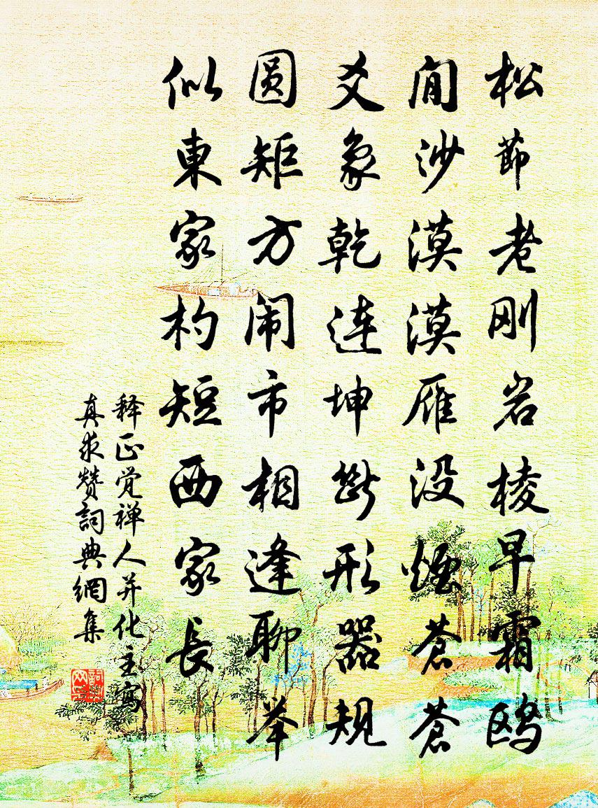 詩詞名句歷史字典書法欣賞書法字典國語詞典說文解字康熙字典古漢語字典標 題 作 者 詩 句 禪人並化主寫真求贊作者:釋正覺 朝代:宋代禪人並化主寫真求贊原文松節老剛,岩棱早霜。鷗閒沙漠漠,雁沒煙蒼蒼。爻象乾連坤斷,形器規圓矩方。鬧市相逢聊舉似,東家杓短西家長。詩詞問答問:禪人並化主寫真求贊的作者是誰?答:釋正覺問:禪人並化主寫真求贊寫於哪個朝代?答:宋代釋正覺禪人並化主寫真求贊書法欣賞禪人並化主寫真求贊書法作品詩詞推薦代書寄友人邵雍〔宋代〕當年有志高天下,嘗讀前書笑謝安。豈謂此身甘老朽,尚無閒地可盤桓。棋逢敵手才堪著,琴少知音不願彈。非止句劉應時〔宋代〕燭與梅花共過冬,淡月故移疏影去。唐史君與正新建浮橋徐似道〔宋代〕秋風百柁倚江皋,幻出城南不柱橋。虹影勒回天際水,鷁頭驚退海東潮。白銀闕里看車馬,赤玉闌邊聽鼓簫。硎刃長相思佚名〔宋代〕繡停針。淚盈盈。斷腸梁燕語聲頻。宋文約有謁於邡江不遂而歸復用韻見貽以此答李流謙〔宋代〕中山老穎初得君,姬姓之毛遂無聞。疏封新賜管城爵,待詔嘗趨金馬門。胡為得此色為動,引赴幽人春草夢。新詩題余文叔山間四時之樓舒岳祥〔宋代〕輕財好事余文叔,磊落襟期端不俗。外方避地客來多,我亦從君借書屋。屋前曲徑繞淪漪,池上高樓新結束。一條星精亭鄭損〔唐代〕星沈萬古痕,孤絕勢無鄰。地窄少留竹,空多剩占雲。釣篷和雨看,樵斧帶霜聞。莫惜尋常到,清風不負人。園中即事朱翌〔宋代〕出山道士在家僧,晚誦儒書早佛經。灰盡此心猶木偶,掃除往事送芻靈。花邊過客蜂旁午,溪上良時鷺適丁。一到句張耒〔宋代〕風光處處同。張持荷示詩編次韻一篇為謝喻良能〔宋代〕先唐詩道昌,萬象繞吟筆。長吉窮嶮怪,奚囊銷永日。一洗齊梁陋,古澹見摩詰。詰齋妙入神,二者無一失。遊戲臨江仙·憶舊張宏范〔元代〕千古武陵溪上路,桃源流水潺潺。可憐仙侶剩濃歡。黃鸝驚夢破,青鳥喚春還。回首舊遊渾不見,蒼煙一片荒山。途次淮口吳融〔唐代〕寒流萬派碧,南渡見煙光。人向隋宮近,山盤楚塞長。有村皆綠暗,無徑不紅芳。已帶傷春病,如何更異鄉。送李端明知河中府梅堯臣〔宋代〕才業人終服,聰明帝所聞。來希段乾木,去識大馮君。金絡鳴津口,朱旗颭雁群。山河虞舊國,簫鼓漢橫汾。古堞贈張亦趙師秀〔宋代〕一別無書信,相逢各老蒼。山川烽外遠,歲月夢中長。空橐盛詩草,單衣碗酒香。因言瀼溪宴,同憶舊時狂。病中獨坐毛滂〔宋代〕千秋橋畔桑麻村,槐陰覆砌綠映門。關門誰覓病居士,掩書不讀愔不言。明窗養石作幽伴,蒼骨孤瘦棲秋痕。瀟湘八聲甘州(題維揚摘星樓)王奕〔宋代〕問蒼天、蒼天闃無言,浩歌摘星樓。這茫茫禹跡,南來第一,是古揚州。當日雙龍未渡,風月一家秋。中分胡越後朝南以詩送巴石研屏香幾用韻香幾洪咨夔〔宋代〕玉版橫陳醉眼邊,尚余金鴨水沉煙。客窗寂寂那消得,祗有南豐一瓣緣。山居葉茵〔宋代〕朝踏山根雲,暮歸雲中扉。野鳥始驚避,今焉情依依。異哉海上鷗,猜疑未忘機。行春野外宋祁〔宋代〕綠野陽膏動,春旗出曉衢。川長羅後乘,林轉隱前驅。早蕊紅粘杏,輕苞紫綴榆。桑郊不敢問,直為使君愚。西池清暉亭許抗〔宋代〕亭號清暉闞碧漣,半連村落半神仙。青山剩得雲間日,明月饒分水底天。名句推薦夫君子愛口,孔雀愛羽,虎豹愛爪,此皆所以治身法也。劉向《說苑·雜言》 天仙碧玉瓊瑤,點點揚花,片片鵝毛。薛昂夫《蟾宮曲·雪》 是無貓邪,是不會蓄貓也。樂鈞《世無良貓》 卻愁擁髻向燈前,說不盡、離人話納蘭性德《一絡索·過盡遙山如畫》 玉人初上木蘭時。懶妝斜立澹春姿。吳文英《浣溪沙·題李中齋舟中梅屏》 過雨西風,數葉井梧愁舞。吳文英《荔枝香近·七夕》 跨馬出郊時極目,不堪人事日蕭條杜甫《野望》 念故人,千里至此共明月。寇準《踏莎行·寒草煙光闊》 罔游於逸,罔淫于樂。佚名《尚書·虞書·大禹謨》 草枯鷹眼疾,雪盡馬蹄輕。王維《觀獵》